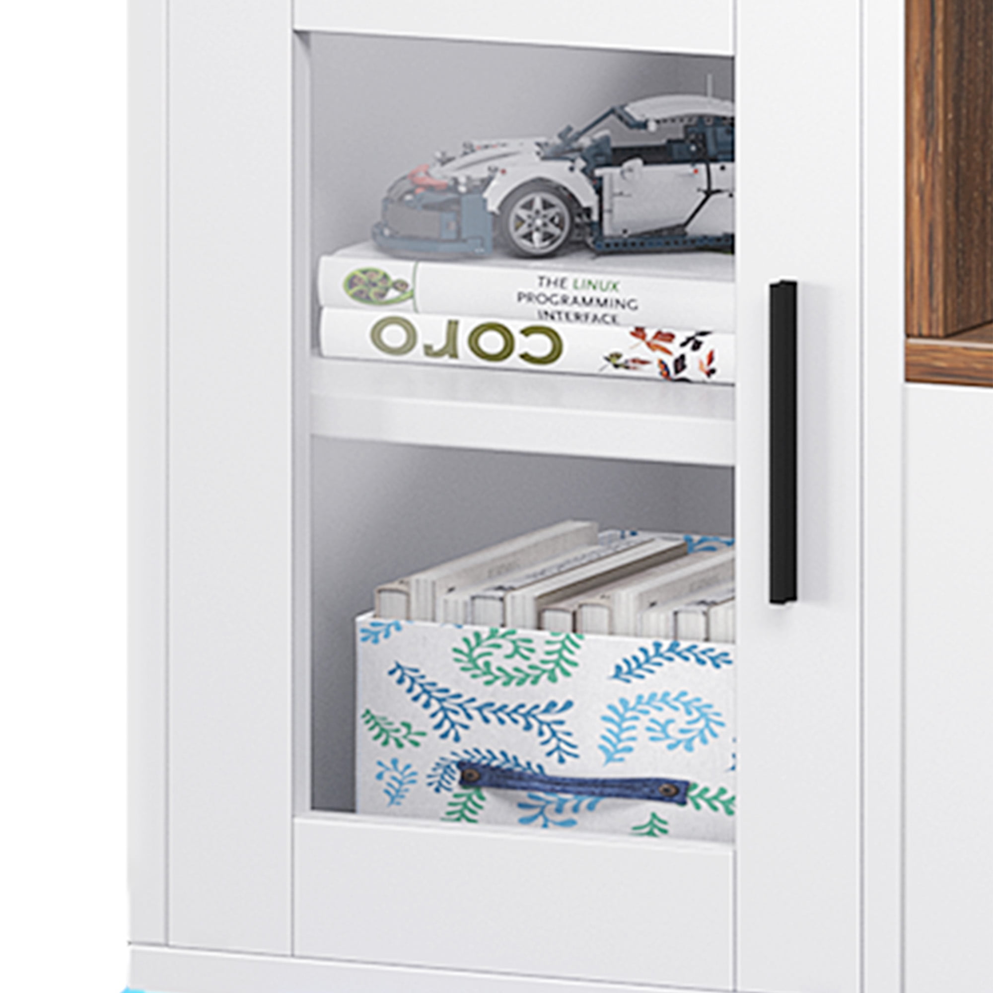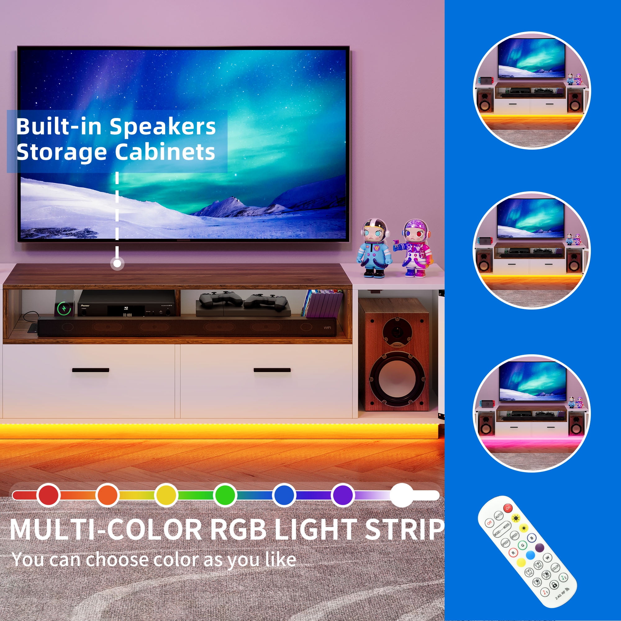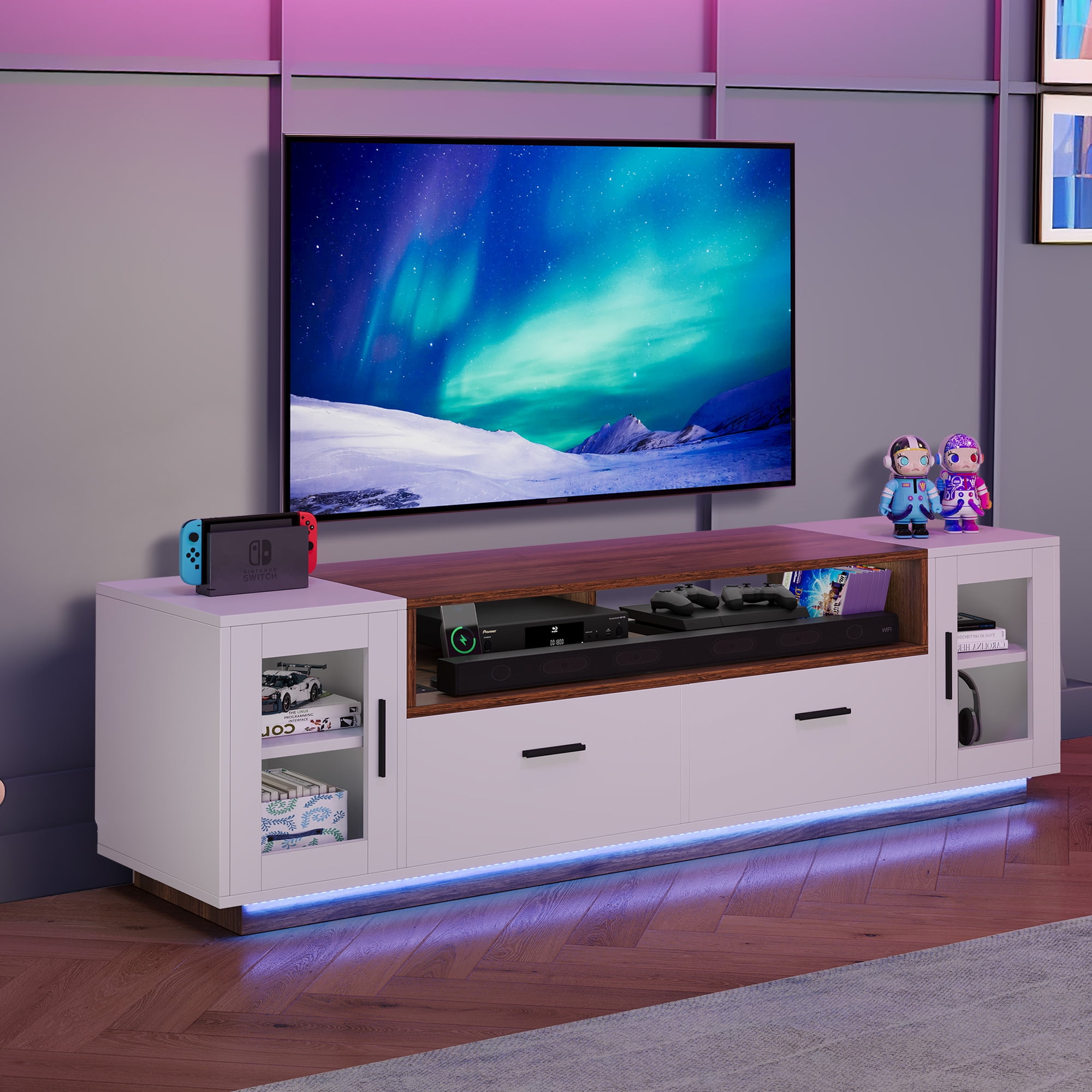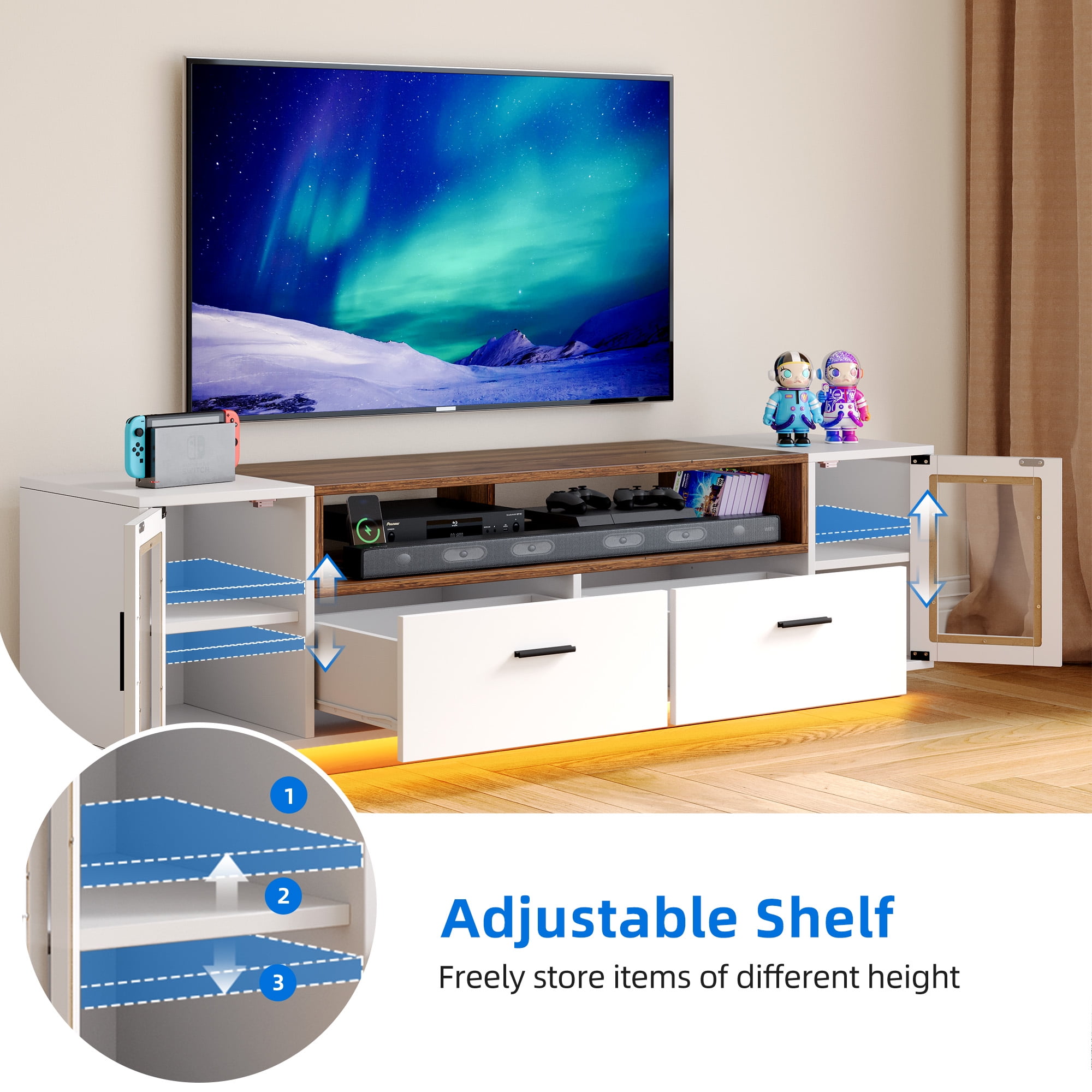 Enhanced entertainment experience: Elevate your TV viewing with remote-controlled LED lighting for a cozy atmosphere during movie nights or gaming sessions. Convenient charging and cable management: Stay organized with built-in charging ports and cable management holes, keeping your devices powered and cables tidy. Stylish display with glass cabinet doors: Showcase collectibles or media devices with elegance using glass cabinet doors, adding sophistication to your living space. Ample storage space: Keep essentials organized with two drawers and adjustable shelves, providing ample storage for media accessories and remote controls. Sturdy construction and easy maintenance: Enjoy durability and stability with a sturdy structure, while the easy-to-clean surface simplifies maintenance.
