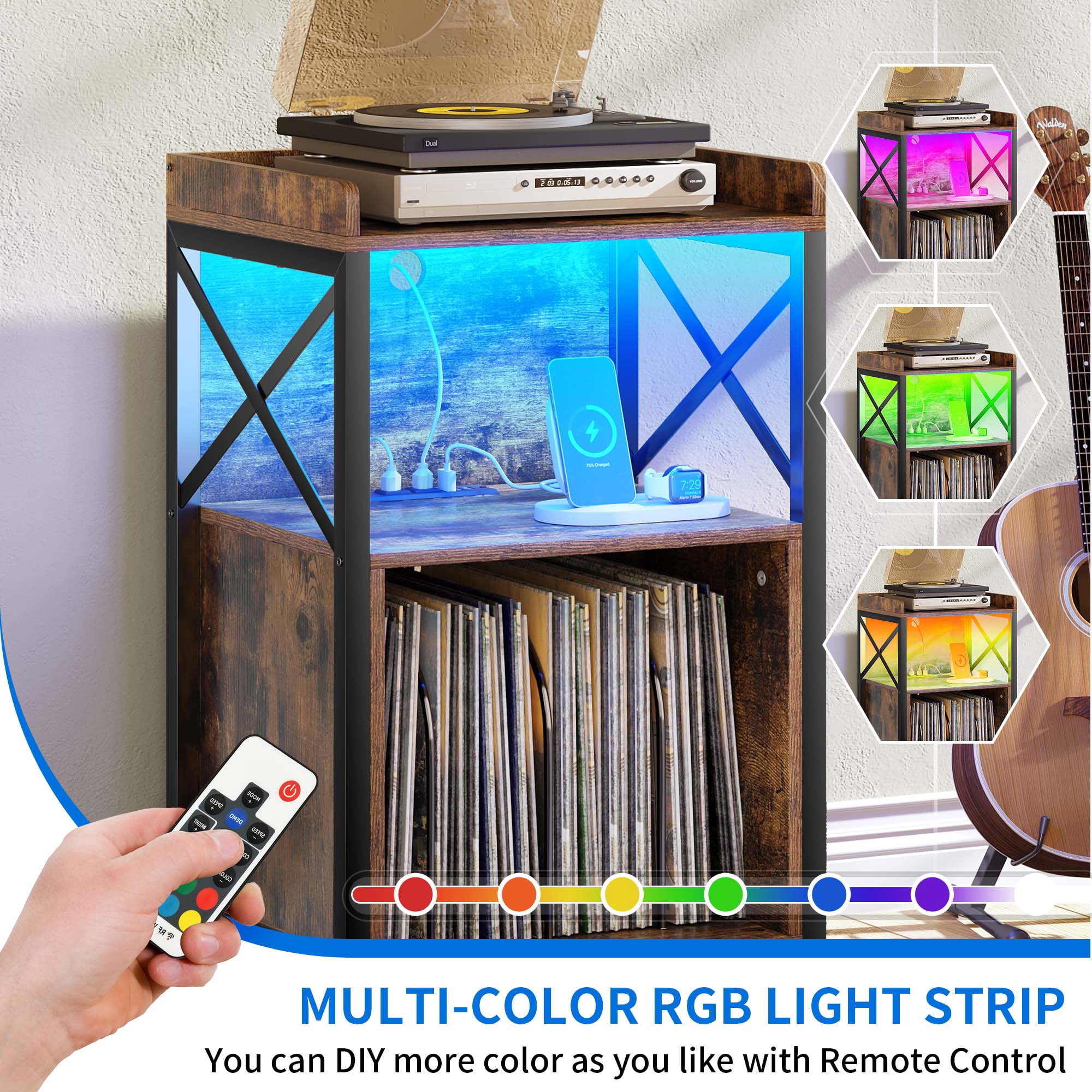 Compact and Convenient Vinyl Record Player Stand: Designed for space-saving convenience, this vinyl record player stand is perfect for small spaces and can hold most turntable sizes on the top layer. Equipped with universal wheels, it is effortlessly portable, making it easy to enjoy music in any location, whether it be your living room, bedroom, office, or even your outdoor spaces. Multipurpose Charging Station with Sleek Design: With 2 USB ports and 2 standard plug outlets, this small end table serves as a multifunctional charging station for your record player, phone, lamp, or any other electronic devices. Its sleek and stylish design adds to the overall aesthetic appeal of the room. Impressive RGB LED Light Strips: Adding an extra layer of ambiance, these multi-color RGB LED light strips allow you to create a soothing atmosphere via a remote control. Whether hosting friends and family or simply unwinding after a long day, you’ll appreciate the extra touch of style and comfort. Spacious Storage Capacity: With four open compartments, this record player stand can hold up to 120 albums, keeping everything organized and easily accessible. In addition, you can use the top layer and upper open storage to hold your record player, while the bottom shelf can double as a bedside table, coffee table, or file cabinet. Simple Installation Process: Each piece of the record player stand is labeled with a letter or number, and the step-by-step instructions make assembly simple to follow. If you have any issues, feel free to contact us and we’ll promptly find a solution that meets your satisfaction.