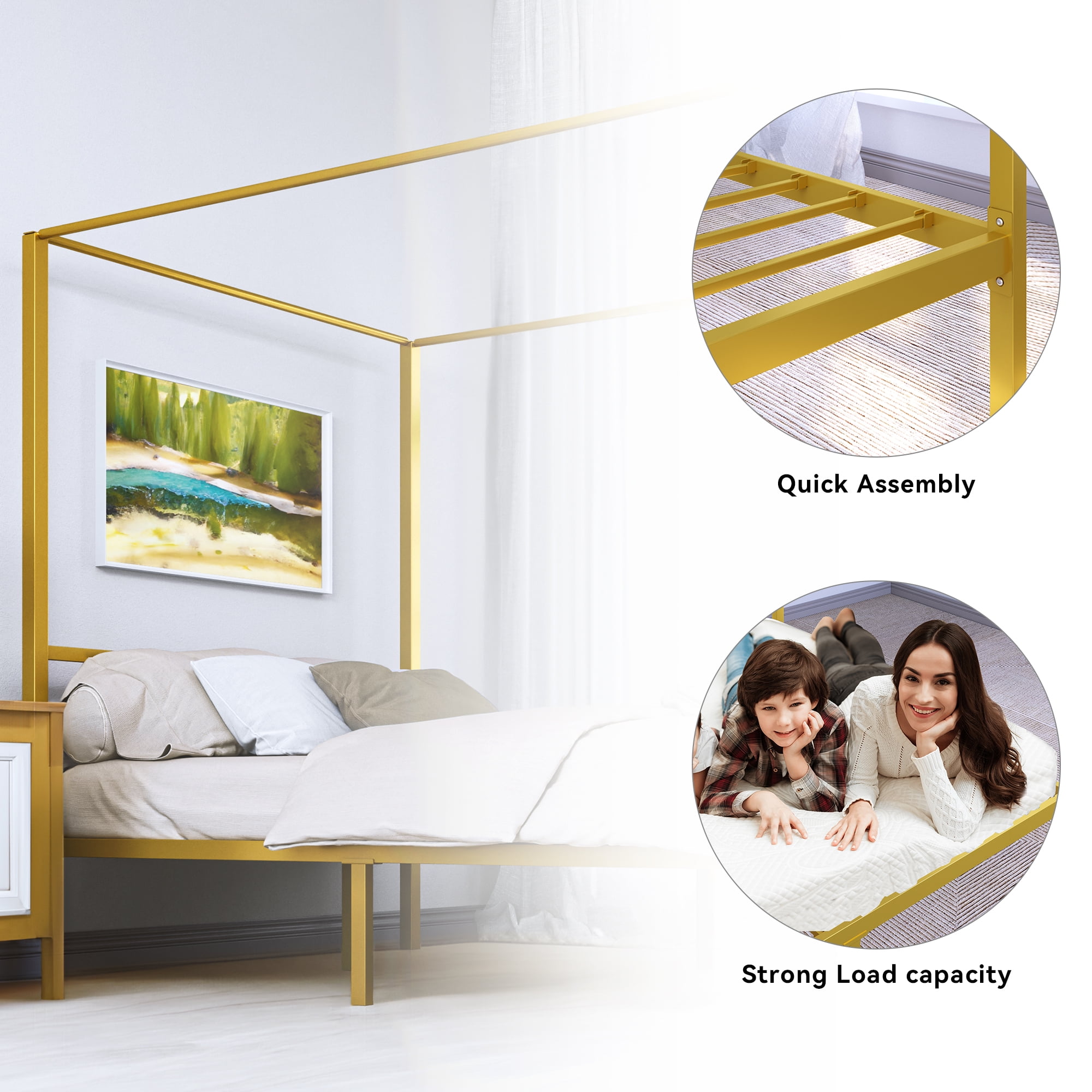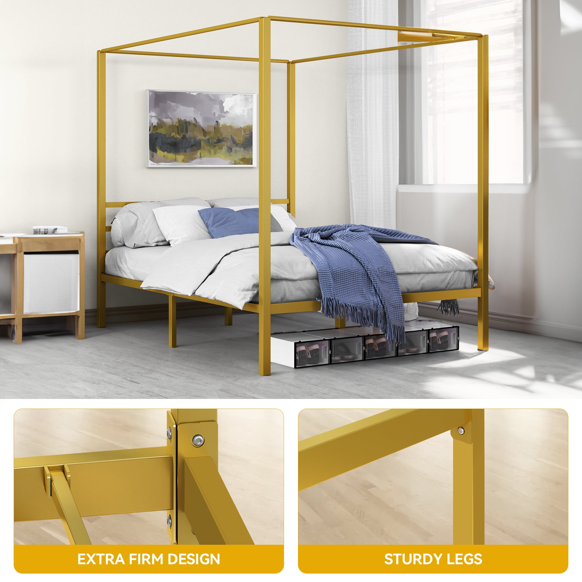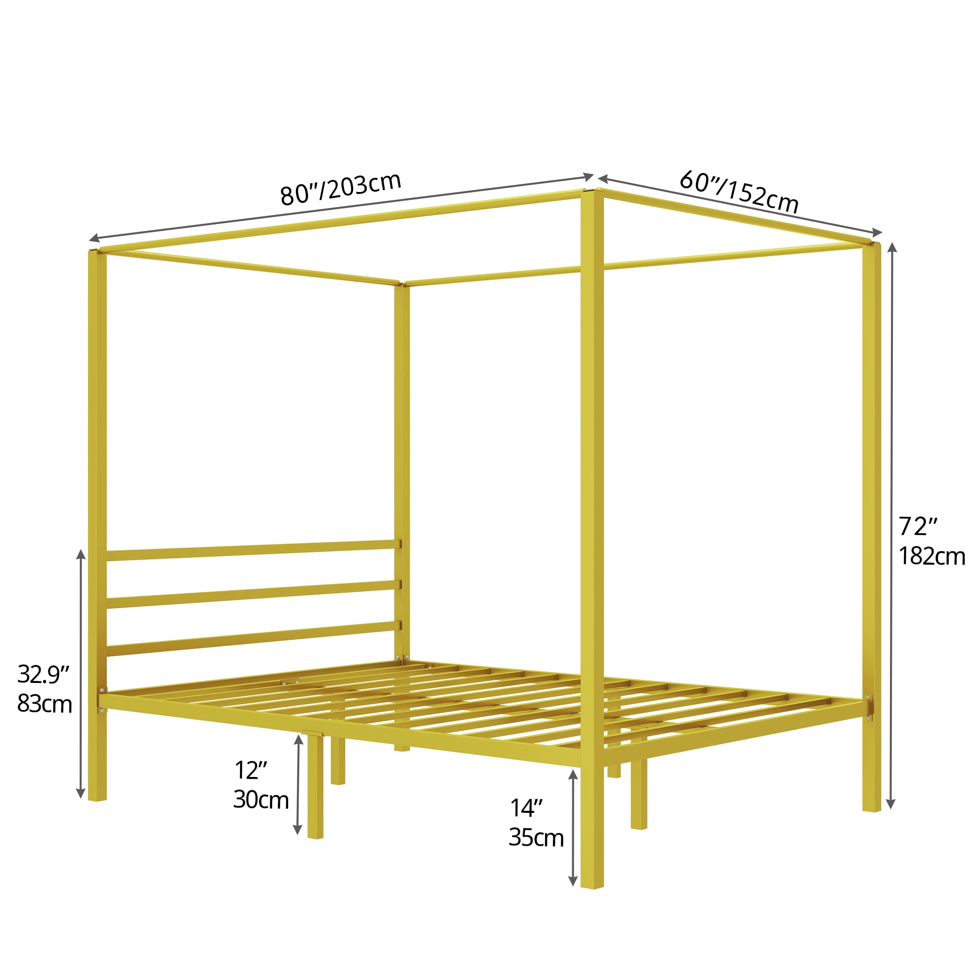 Brand Introduction Dextrus brings a passion for life and is devoted to creating visually stunning furniture with a minimalist style meant for everyday use. Each piece is the result of unique design and meticulous craftsmanship, combining art and functionality, minimalistic outlines, and sculptural details, so you can feel comfortable in your daily space. Product Description Dextrus Metal Four Poster Canopy Bed Frame 14 Inch Platform with Built-in Headboard Strong Metal Slat Mattress Support, No Box Spring Needed, Gold, Queen Size Specifications Size ‎ :Queen Color :‎Gold Material :‎Metal Item Weight ‎:58.53 Pounds Product Dimensions :‎80 x 60 x 72 inches