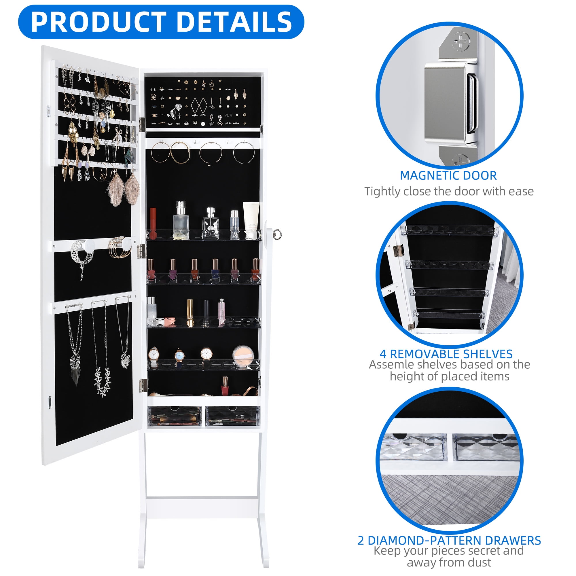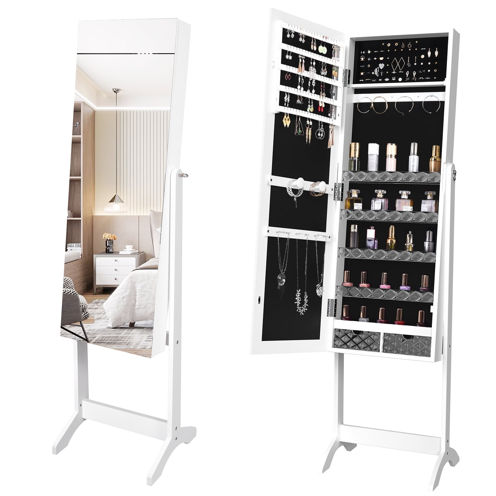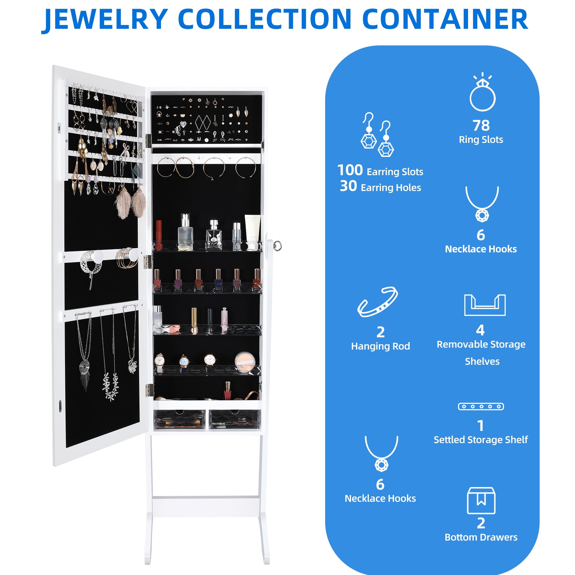Dextrus Mirrored Jewelry Cabinet Armoire with Full Length Mirror, Standing Large Capacity 2 in 1 Jewelry Armoire Organizer with 2 Drawers, 3 Angel Adjustable – White