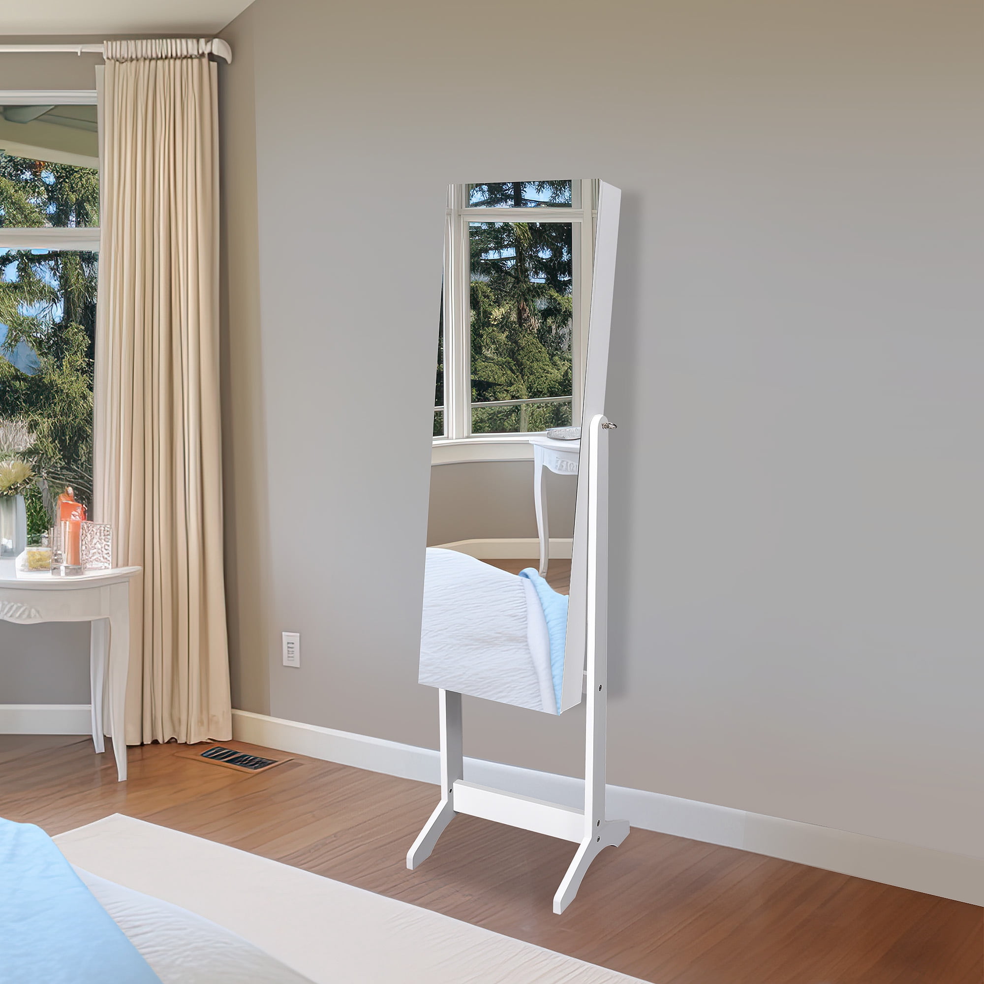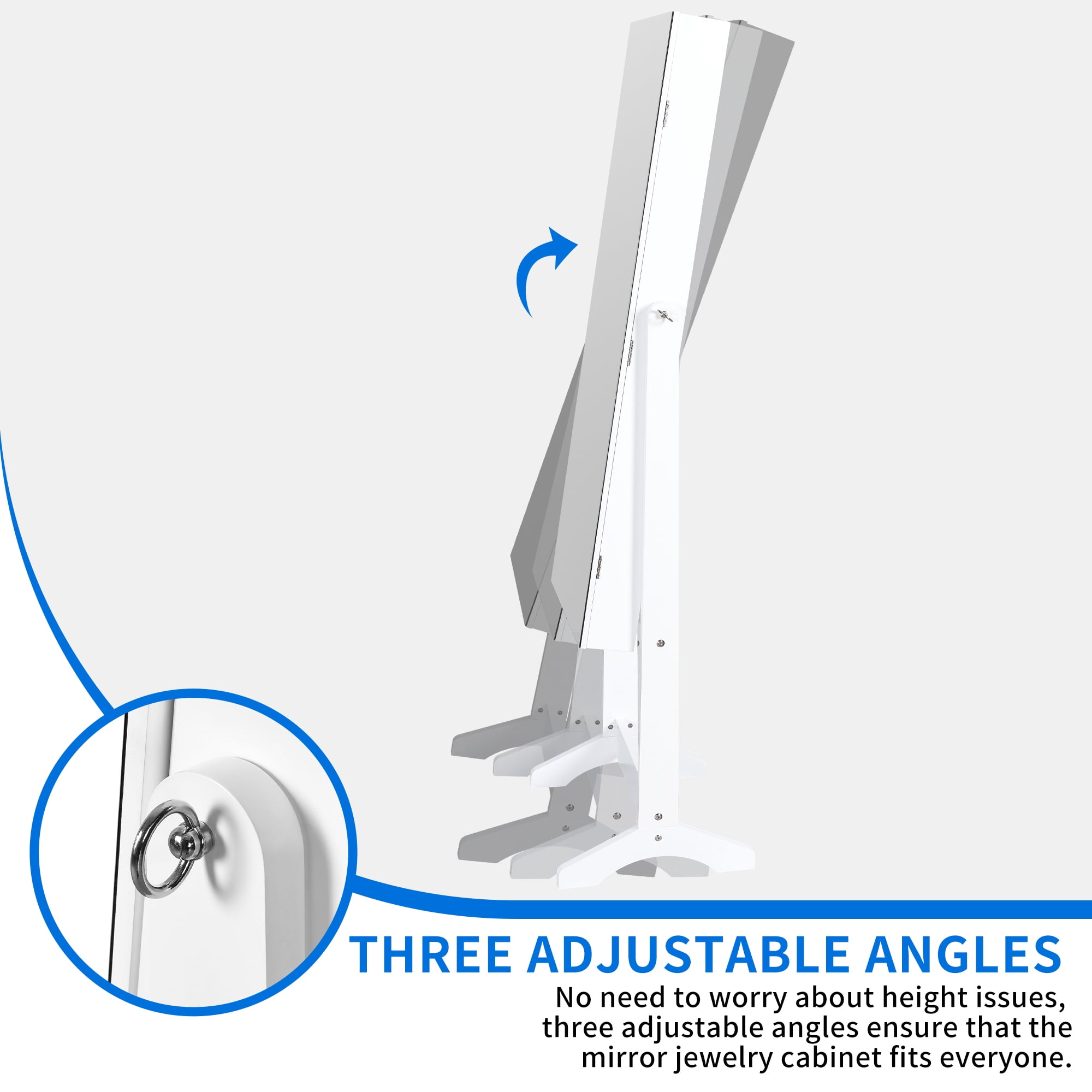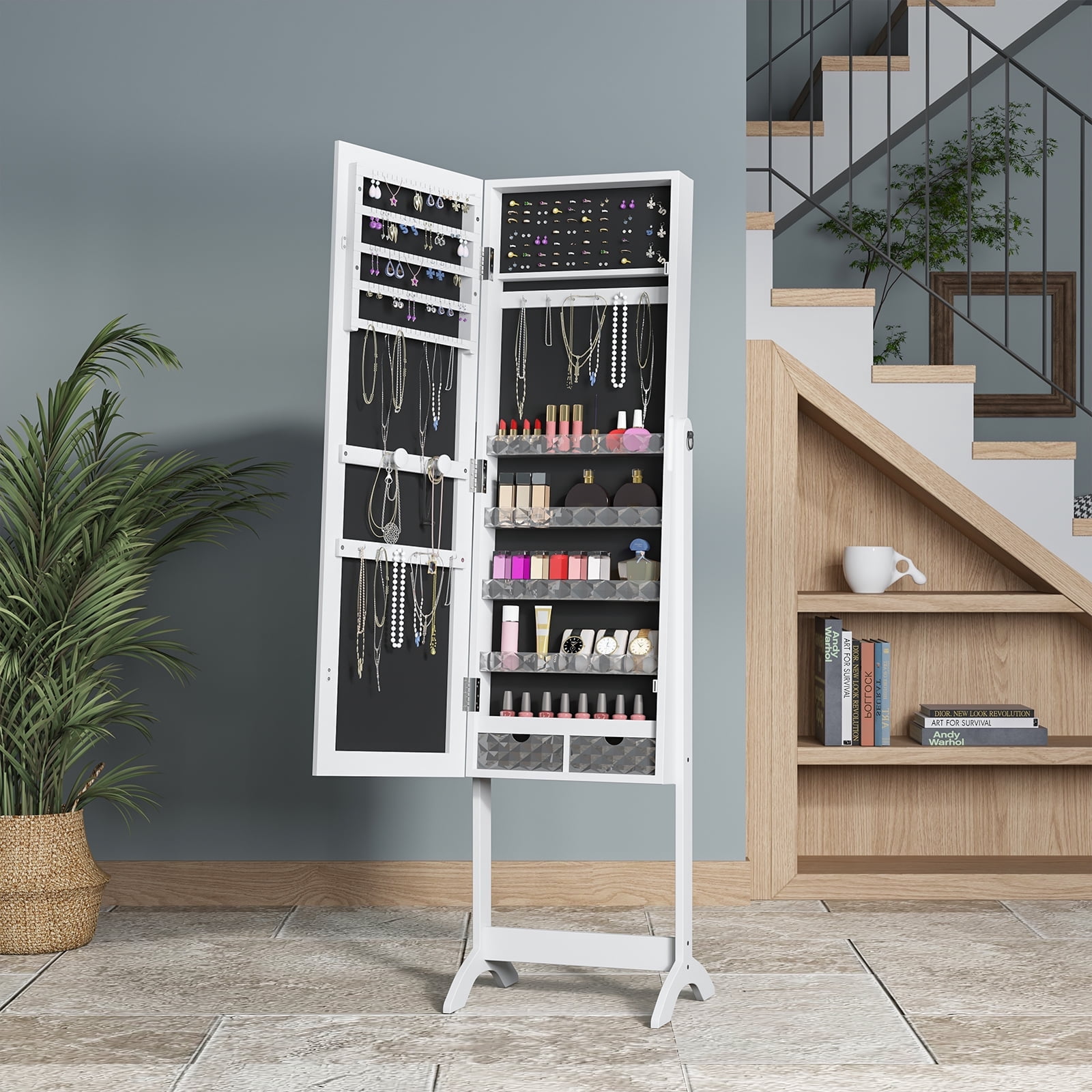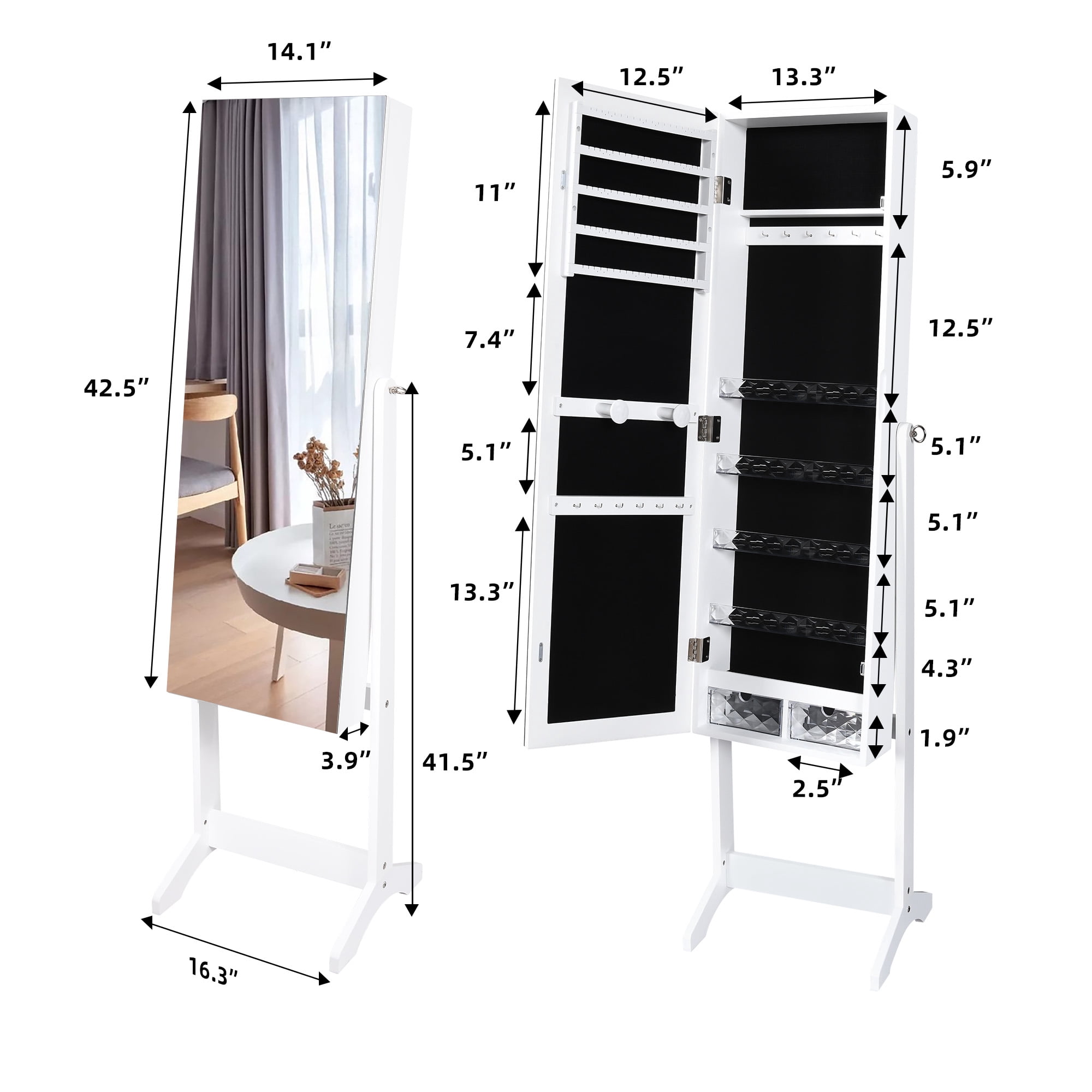 JEWELRY SANCTUARY: Discover the ultimate jewelry cabinet, meticulously designed to house your treasures. With 130 earring holders, 12 necklace hooks, 78 ring slots, 2 bracelet rods, and 5 storage shelves, your valuables find a secure haven. VERSATILE BEAUTY: This jewelry armoire is more than meets the eye. It’s not just a guardian of your precious items; it also serves as a full-length mirror with adjustable angles, making it the ideal companion for your daily rituals and activities. SWIFT GLAMOUR: The full-length mirror jewelry cabinet, measuring 44.5″H x 17.1″L x 6.3″W, gives you a right size for a quick head-to-toe check, allowing you to start your day in style. IMAGINED FOR EXCELLENCE: Constructed with MDF, a durable, long-lasting material. Its contemporary curved design ensures stability, and the mirror jewelry cabinet can be adjusted to three angles to suit your needs. ELEGANT GIFT: Whether it’s for your wife, mother, or daughter, consider this charming jewelry cabinet as the great gift. It’s an attractive choice for your family and friends, and the sturdy package results in a safe arrival. Specification: Color: White Material: Engineered Wood Item Dimensions(LxWxH): 44.5 x 17.1 x 6.3 inches Special Feature: Adjustable Inner Material: Engineered Wood Package Contents: 1 x Jewelry Cabinet 1 x Pack of Accessories 1 x Instruction
