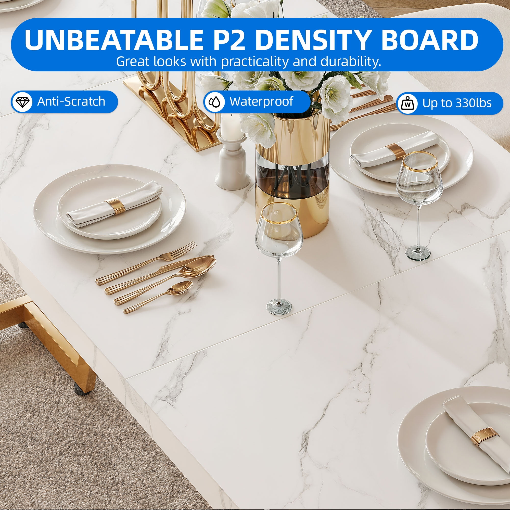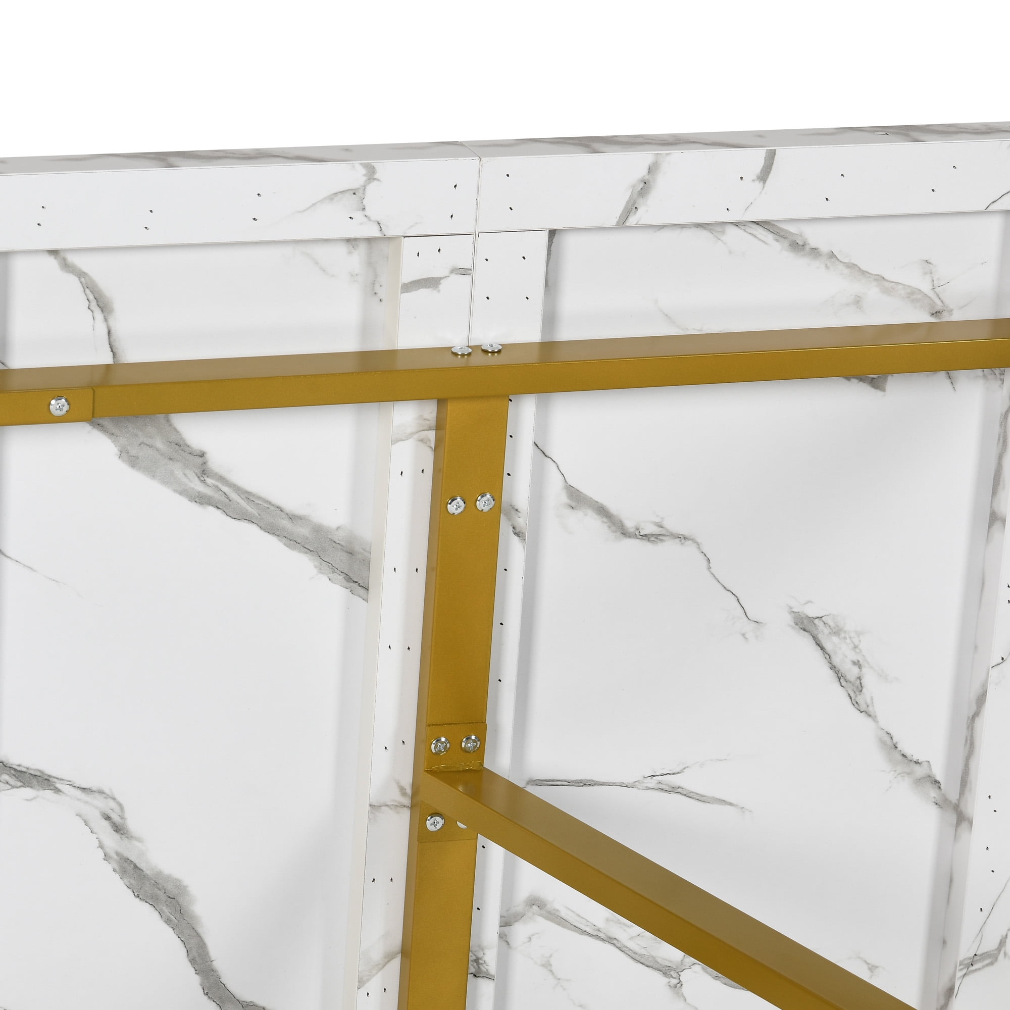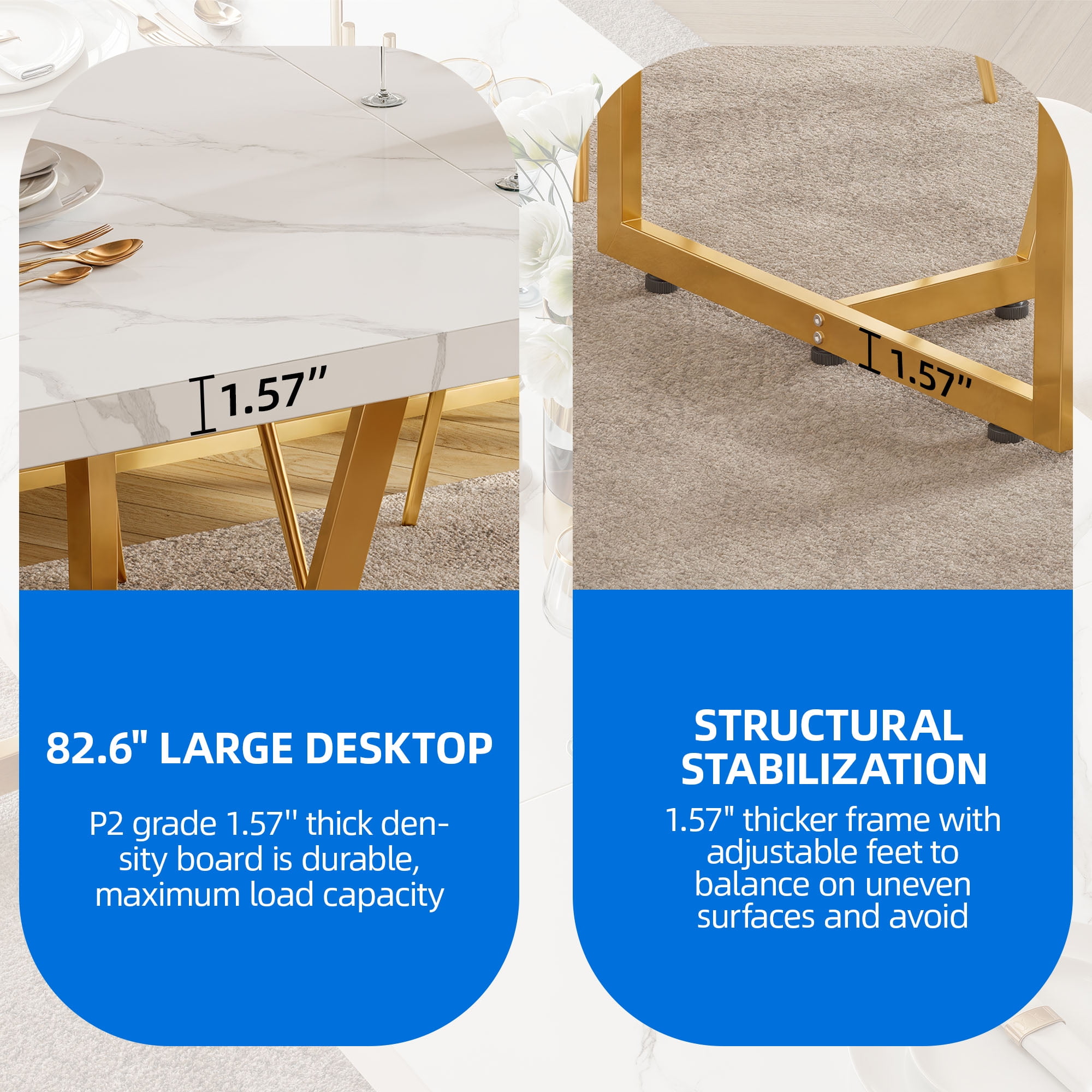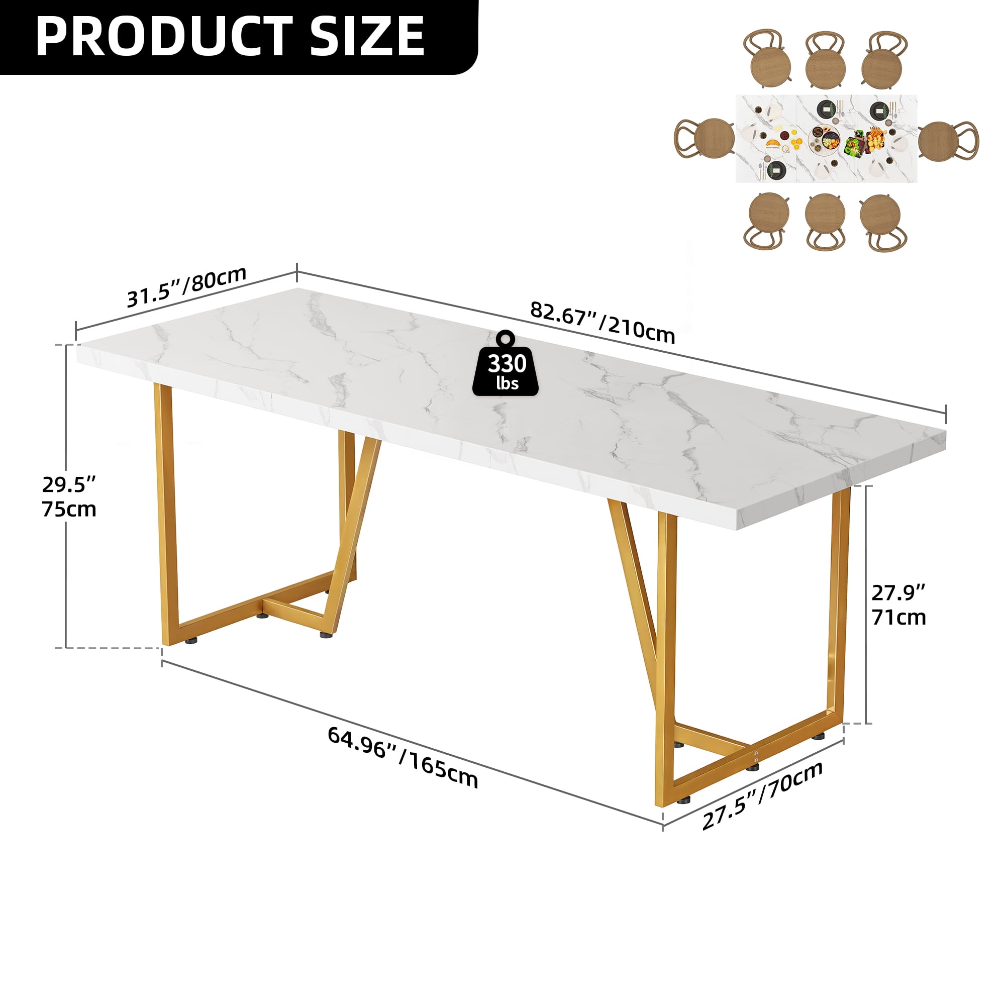 Supreme Dining Oasis: Measuring a grand 82.7″ in width, 31.5″ in depth, and 29.5″ in height, this expansive dining table graciously accommodates gatherings of 6-8 individuals. A pinnacle choice for large families and convivial gatherings, it offers a spacious and inviting ambiance for all to relish their meals. Elegantly Crafted Faux Marble Excellence: Adorned with a sophisticated faux marble top, this dining table exudes an air of opulence, enriching your dining occasions. The 1.6-inch thick top, meticulously fashioned from durable chipboard, guarantees enduring functionality without compromise. Innovative Geometric Grandeur: Featuring a base with dual rectangular and trapezoid cutouts, the table’s geometric allure brings a captivating visual interplay, lending a distinctive and alluring charm. Constructed from robust metal, it boasts a weight capacity of up to 330 lbs., while adjustable foot pads ensure both impeccable stability and safeguard your flooring. Versatile Utility: Beyond its role as a dining table, this contemporary masterpiece extends its versatility to serve as a capacious workstation, a refined meeting table, or a sophisticated home office desk, accommodating all your needs with style and ease. Effortless Assembly & Exceptional Customer Care: Simplifying the setup process, this dining table arrives with meticulously labeled components and clear assembly instructions, facilitating a swift and hassle-free assembly experience. Complemented by our dedicated customer service team, we stand committed to providing unparalleled support, ensuring a seamless and gratifying shopping expedition.
