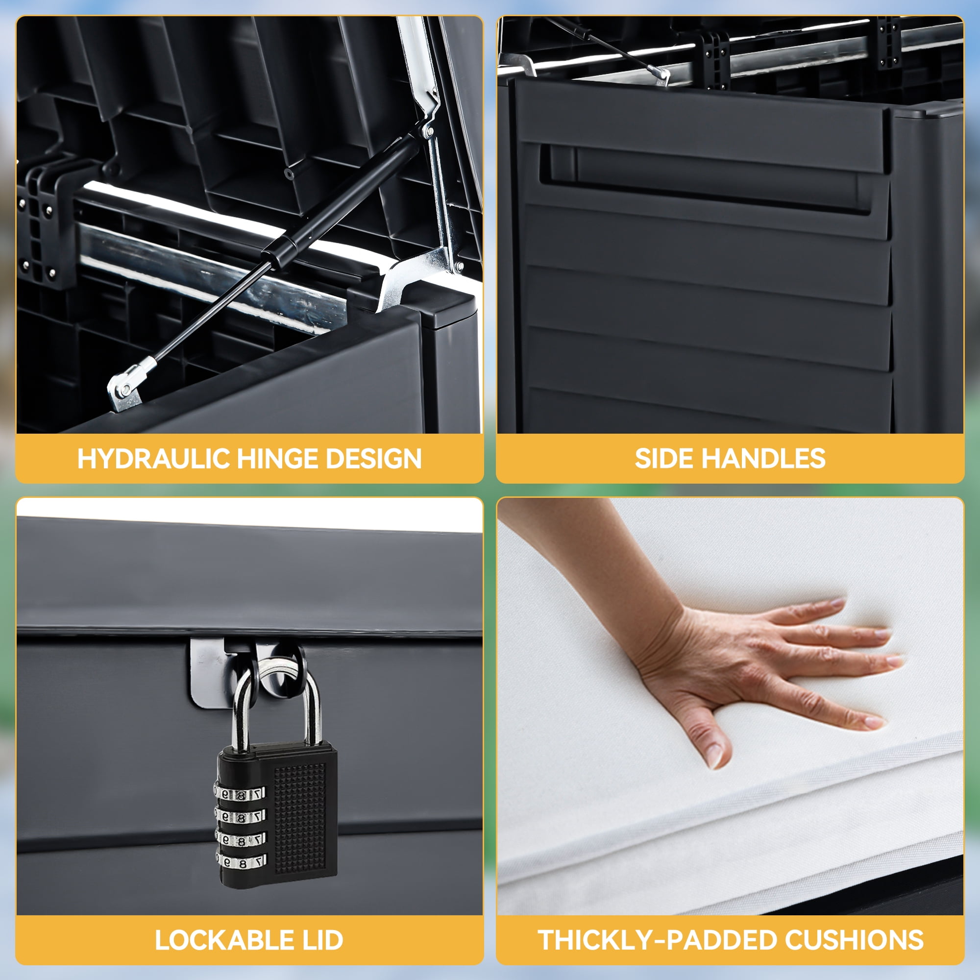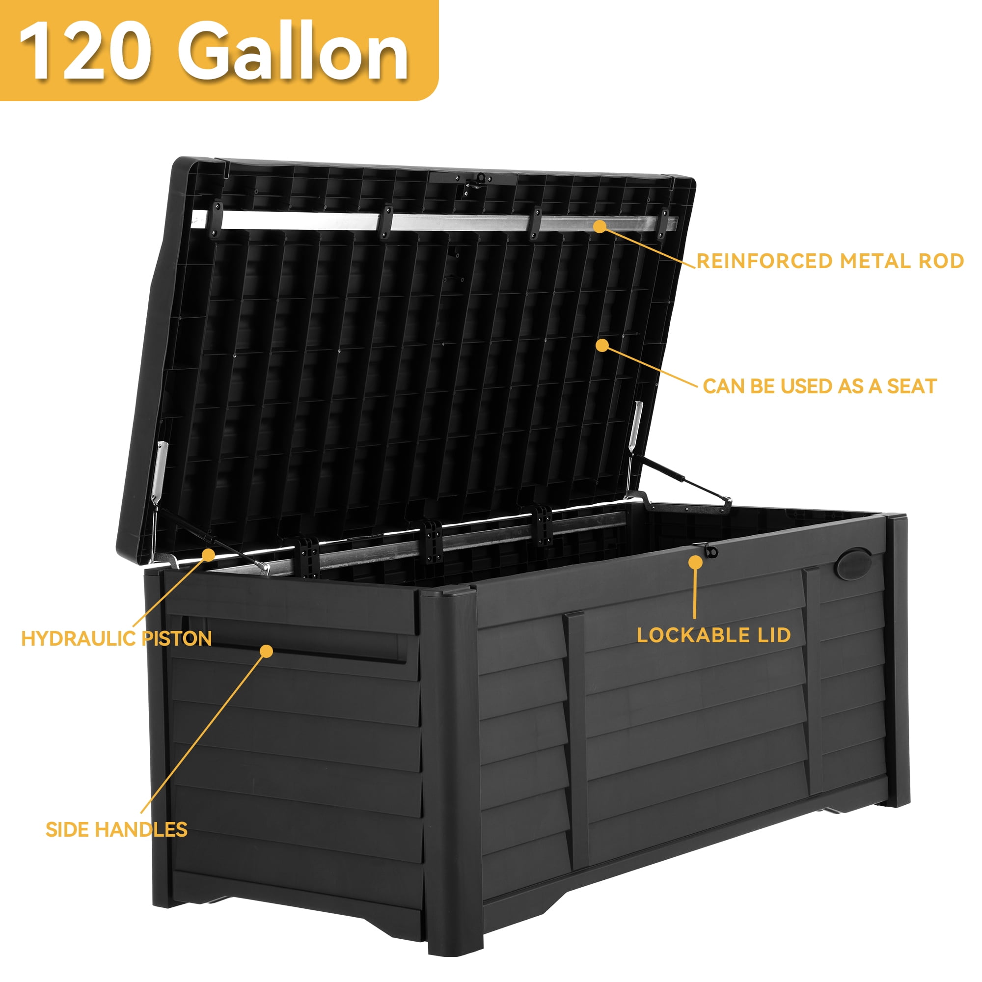 Dextrus Outdoor 120 Gallon Resin Deck Box, Black Effortless Opening and Closing: Equipped with a hydraulic piston for easy and safe lifting and closing of the top, minimizing the risk of finger injuries. Suitable for all ages Exceptional Durability: Made from all-weather resin, this deck storage box is designed to withstand the elements without fading or rusting. Reinforced with iron bars for added support and strength Versatile with Added Comfort: Features a built-in 1.18″ cushion, allowing it to double as an additional seat. Supports up to 660 pounds for a sturdy seating experience Ample Storage Space: Offers 120 gallons of storage capacity, perfect for garden tools, children’s toys, or various pillows and blankets Stylish and Functional: The unique louvered wheel design complements your patio furniture, making it an ideal storage solution for outdoor cushions, pool accessories, and gardening tools