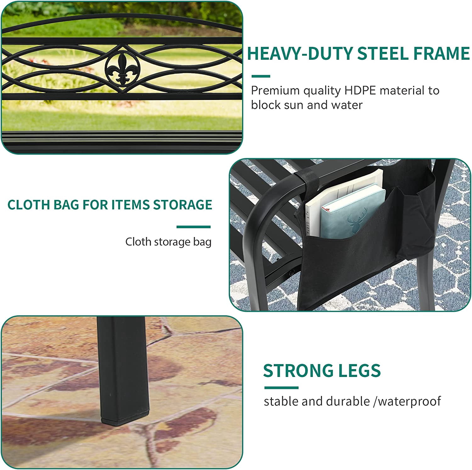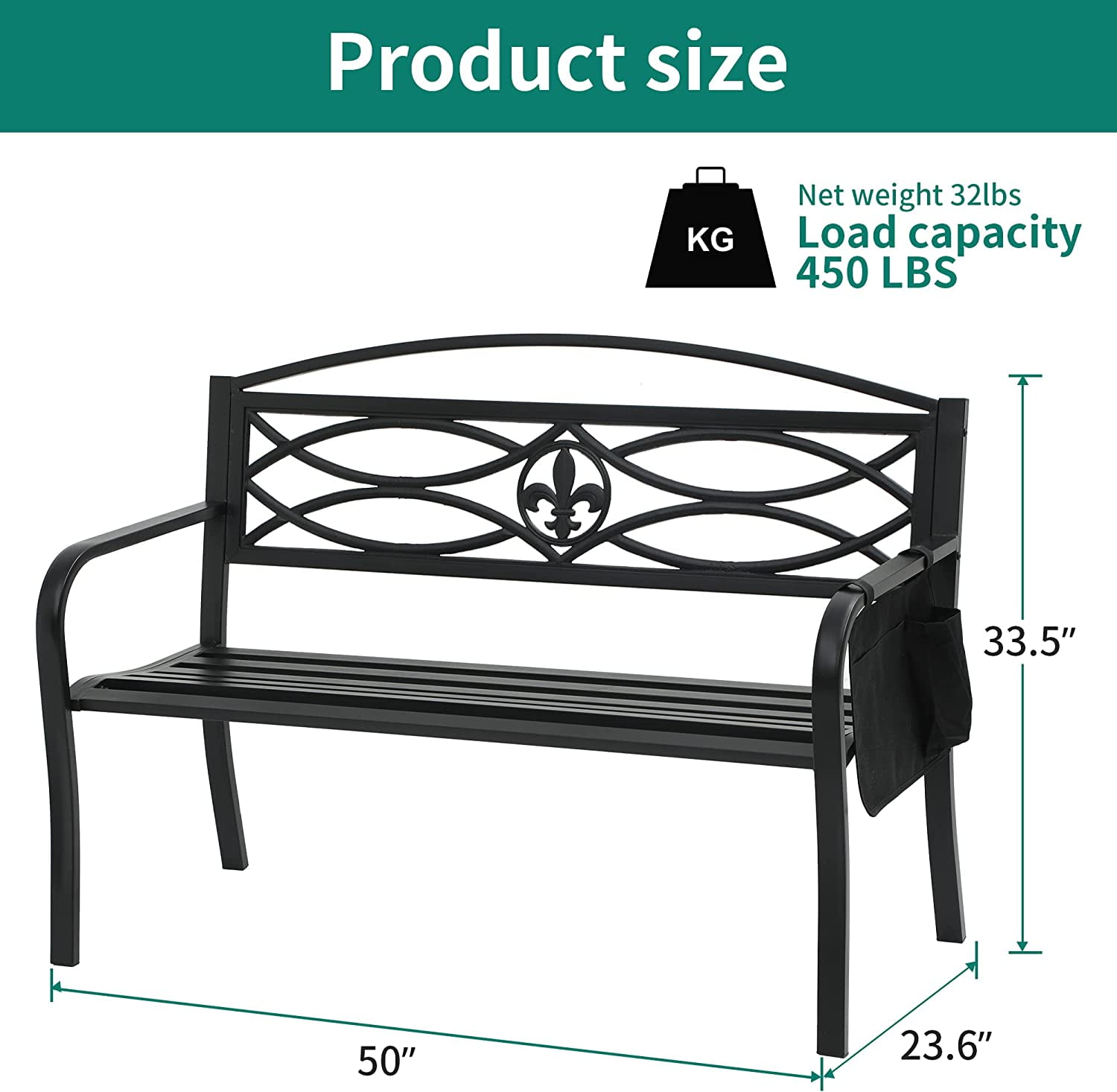 Exquisite Outdoor Bench: Patio Metal Bench contains one 600D cloth bag for small items storage.Slatted seat joined with arc-contoured armrests grant a comfortable sitting experience. Perfectly complements other decor and allows you to indulge in reading or relaxation. Sturdy Structure: This garden bench is built using all-steel design and cast iron backrest to ensure great sturdiness & stability that’ll last for years; Surface is powder coated for easy cleaning, weather resistance, and UV protection. Safe & Comfortable: Metal bench’s delicate craftsmanship on every edge and overall surface to ensure a smooth feel; Arced armrests and ergonomically designed seat height to relieve your tension and maximize comfort. Easy Assembly: This patio bench can be quickly assembled in around 10 minutes with all parts and detailed instructions included; Overall dimensions: 50″L x 23.62″W x 33.46″H; 32 Lbs. Weight capacity can seat up three people. Enhance Outdoor Life: Outdoor patio bench’s spear pattern brings a dashing aesthetic to your backyard, patio, garden, or lawn; Lightweight yet durable structure accompanies an antique style to provide an elegant addition to your patio, yard, porch, garden, and poolside.