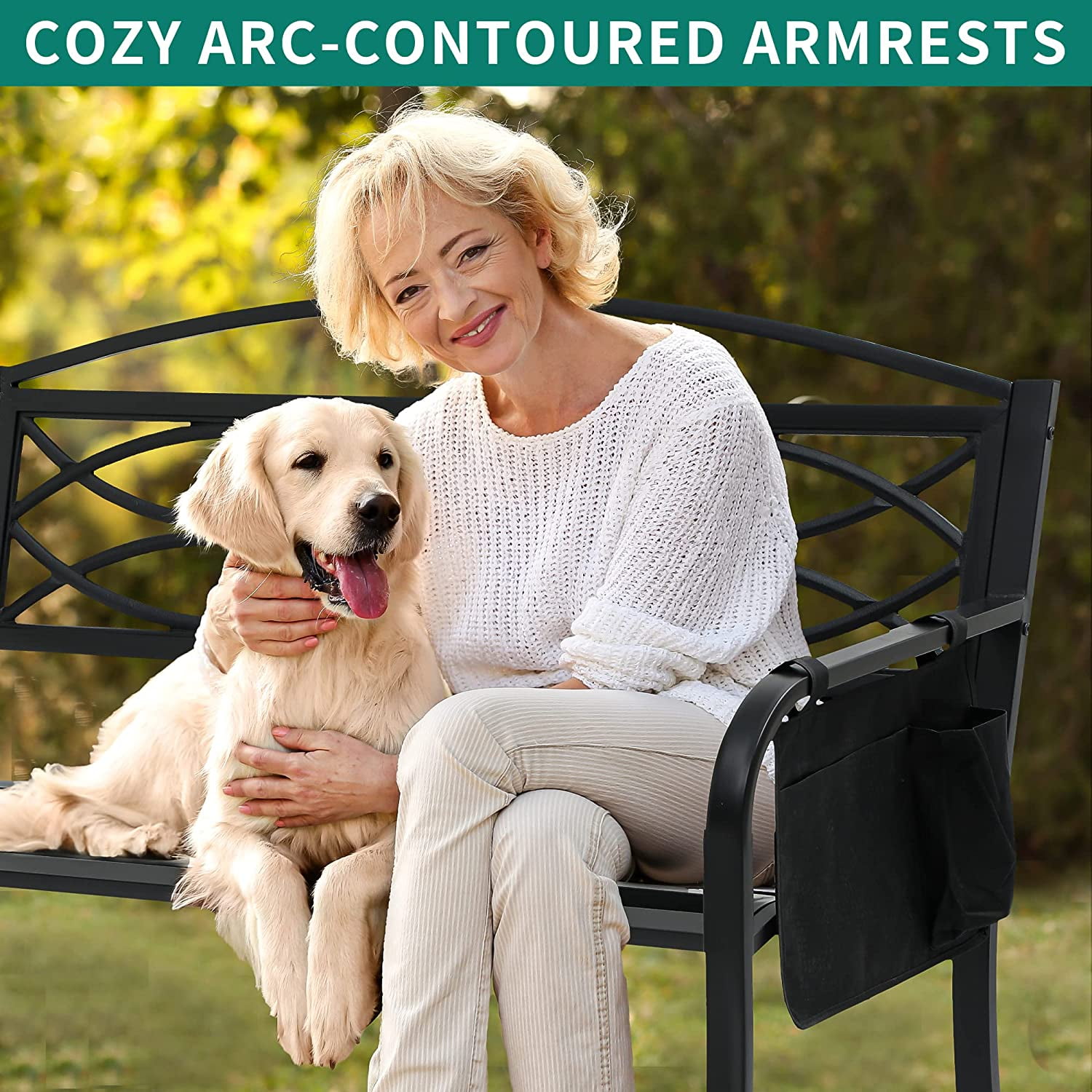 Dextrus Outdoor Bench 50″ Metal Bench with Cloth Storage Bag Spear Pattern Patio Bench with Backrest and Armrest for Porch Lawn Balcony Backyard and Indoor Black