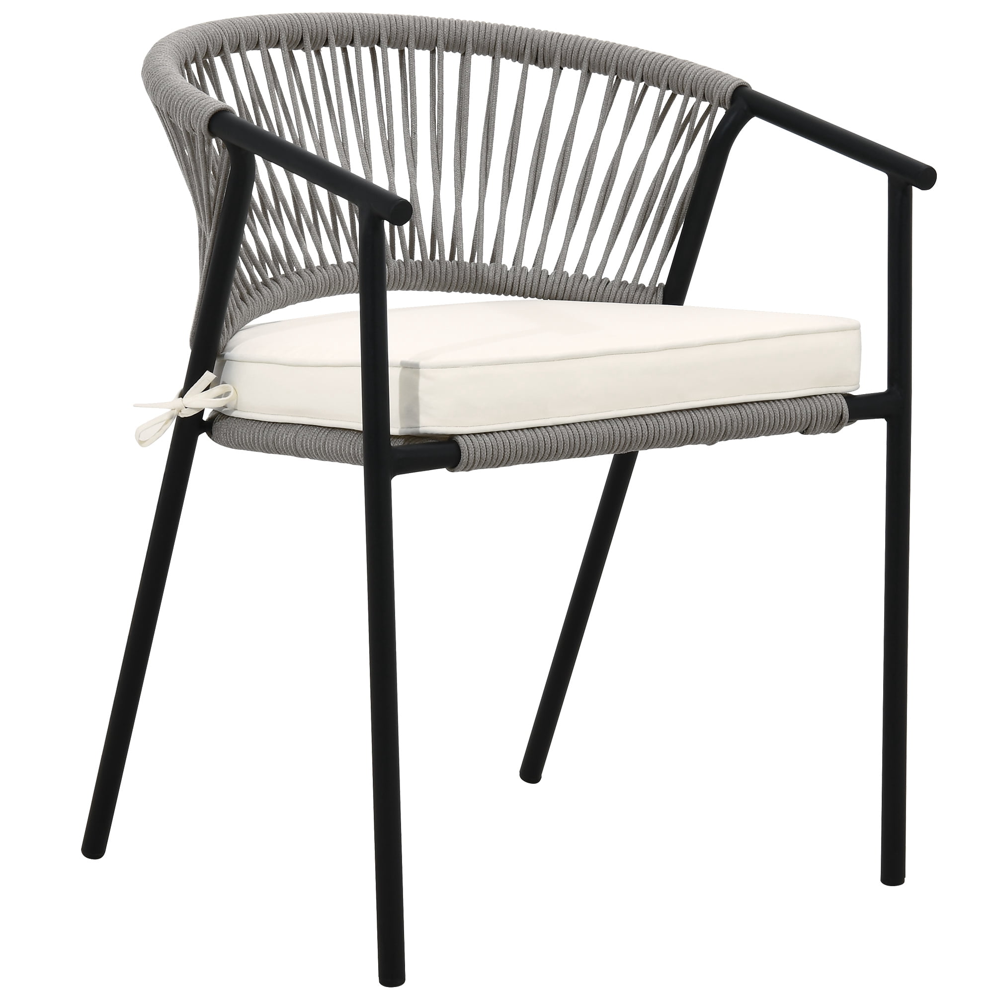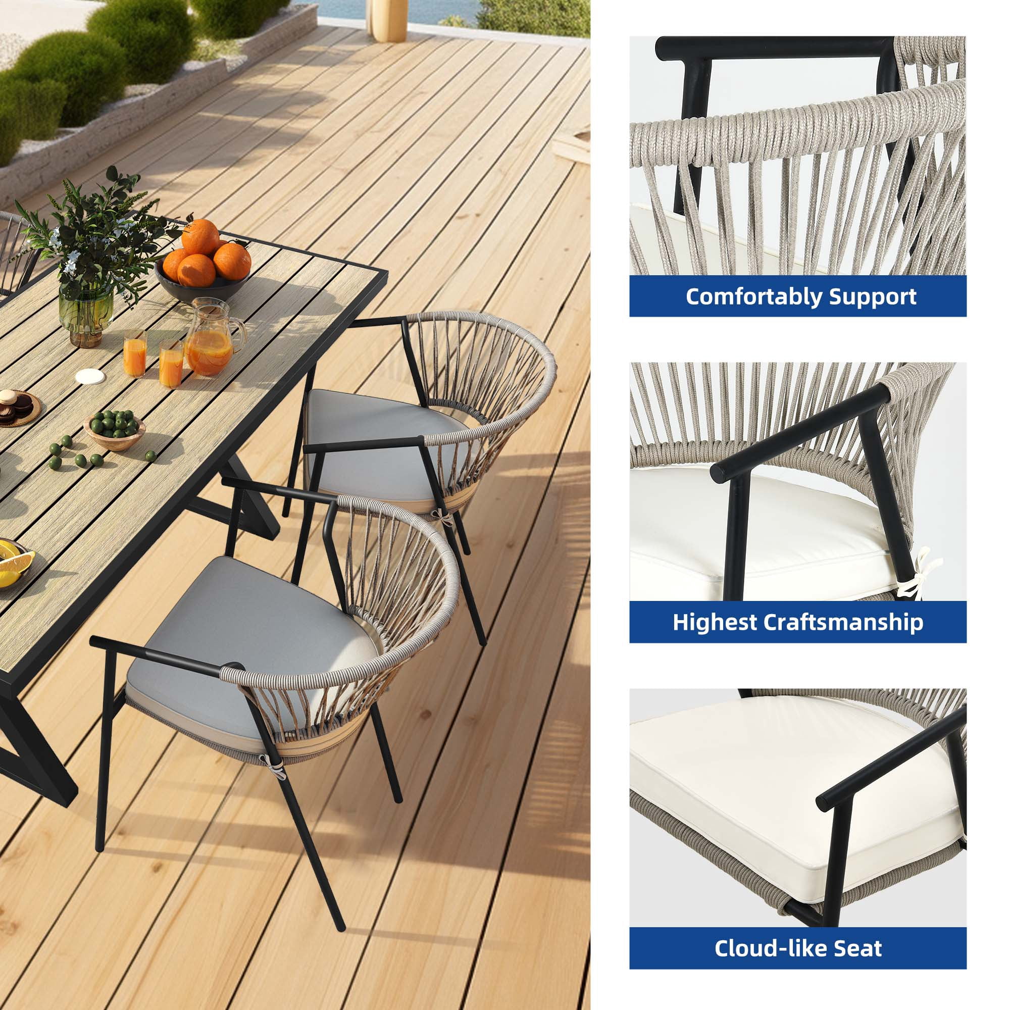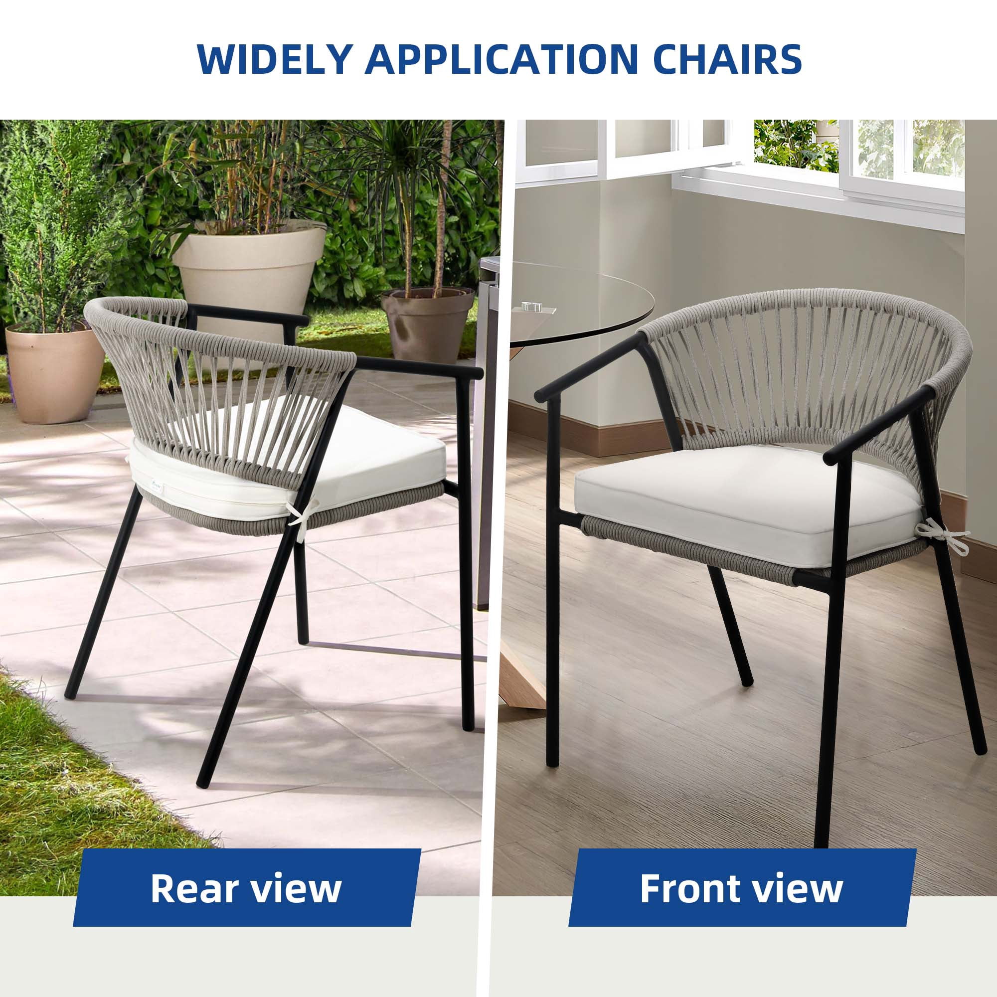 Woven Rope Chair: Our woven rope chair provides an elegant style and a sense of casualness, blending seamlessly into any décor from contemporary or coastal to preppy and ultra-chic. Upgrade the look of your outdoor space, soften it up, and make your outdoor space cozier and warmer with this chair. Premium Materials: The chair is made up of a powder-coated steel frame wrapped in hemp rope, promising durability and sturdiness enough to hold up to 265lbs. The weather-resistant polyester fabric safeguards the chair from the elements, ensuring protection from accidental drizzle or drink spills. Cloud-Like Comfort: Our outdoor dining chair is furnished with a soft cushion that provides you with ultimate comfort that makes you feel you are sitting on a cloud. Sink in or lean back, relax your heart, and rejuvenate your soul. Space-Saving: Our outdoor chairs are space-efficient, taking up minimal storage space. The chairs can be stored vertically, freeing up storage space; one can now store two chairs in the space it would take up to store one. Versatile Use: We provide modern additions to your outdoor space, such as gardens, porches, patios, pools, etc. However, our wicker chairs can contribute to a laid-back bohemian feel to your living or dining room as well. Our woven rope chair can be designed for both indoor and outdoor use.