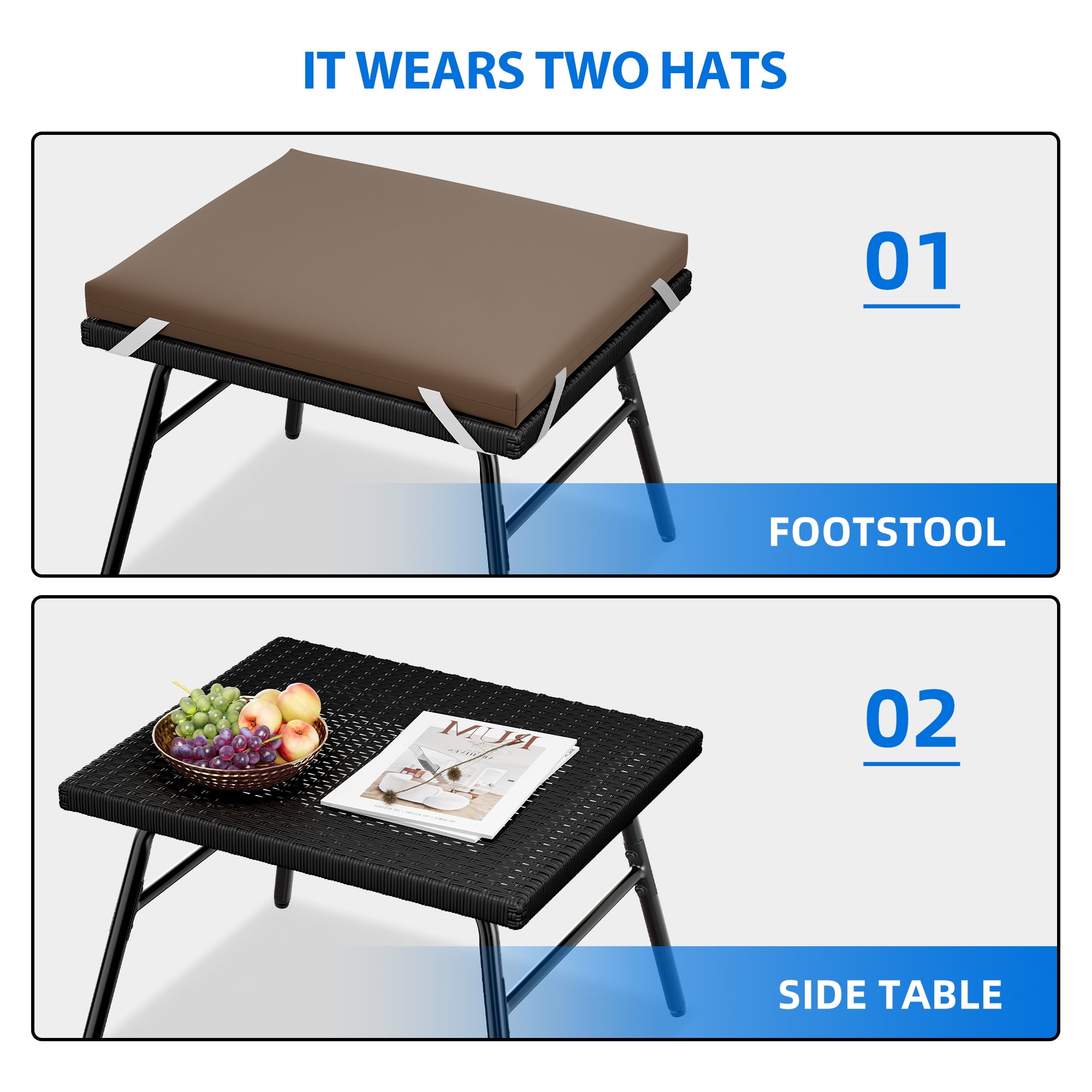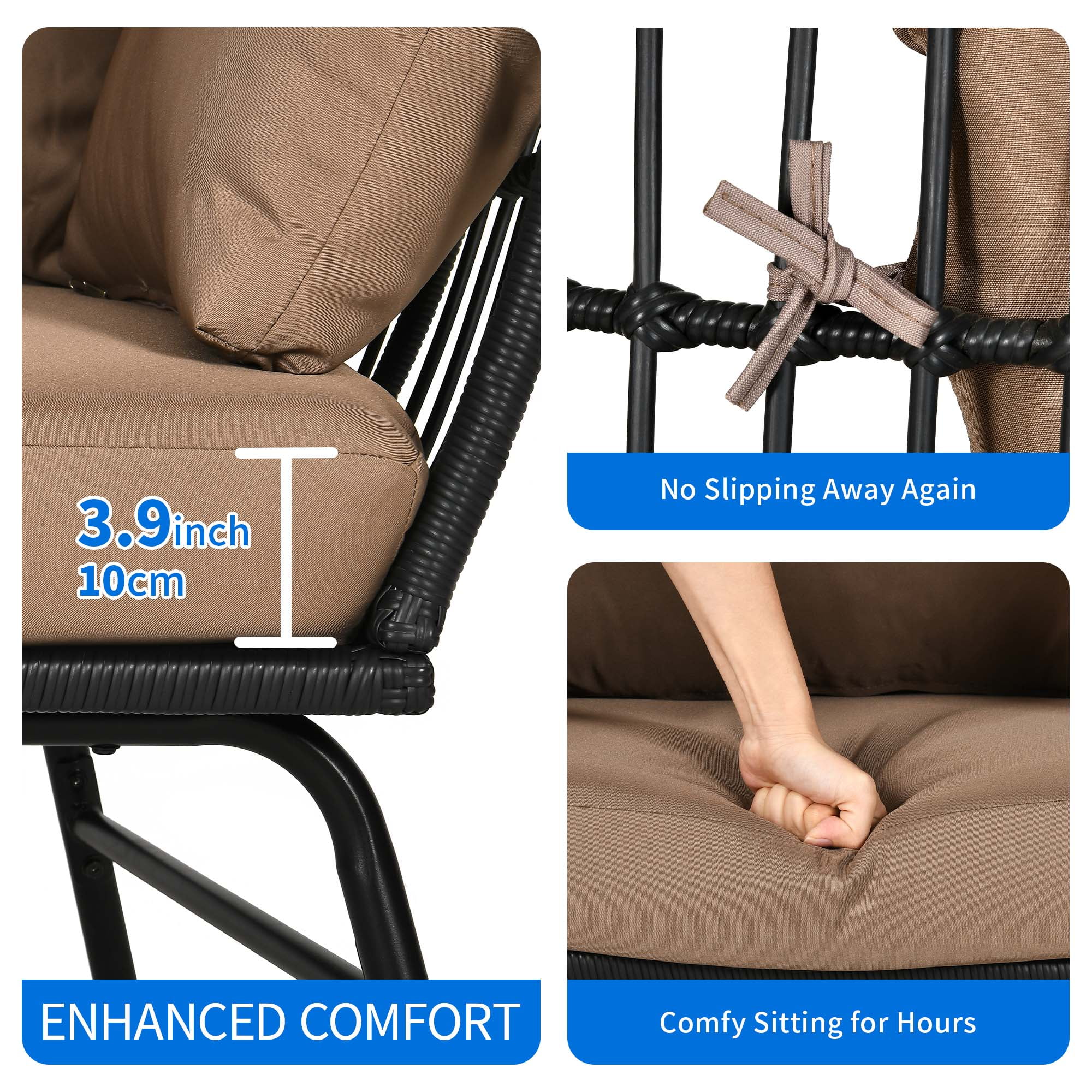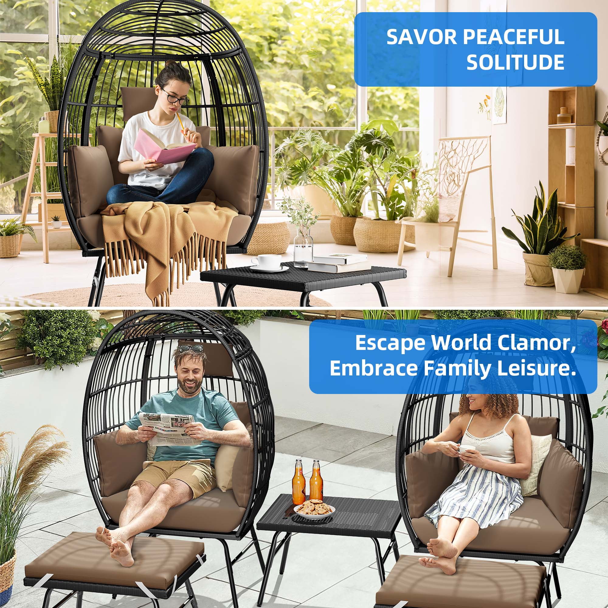 【2-IN-1 Egg Chair COMBO】: Our egg chair footrest combo offers optimal sitting comfort. You can raise your feet on the footstool, which relieves leg fatigue, or transform the cushionless footstool into a side table for your magazine, coffee, or books. 【ENHANCED COMFORT】: With our thick, cozy cushions, you’ll be so relaxed you’ll never want to leave. The five snugly cushions and straps ensure that you’ll sink into peaceful solitude as you indulge in your favorite books, or enjoy a sweet nap. 【STURDY & RELIABLE】: Our rattan egg chair is constructed with a robust power-coated metal frame and four supportive legs for ultimate stability. Holding up to 400lbs in pure relaxation, this hanging chair is your go-to spot for relaxation. 【VERSATILE DESIGN】: Indoors or outdoors, this wicker peacock chair is your perfect leisure spot. Add a touch of bohemian style to your living room or elevate your outdoor space with its exquisite woven rattan design. 【EASY ASSEMBLY & MAINTENANCE】: Assembly is effortless. Follow the illustrated instructions and tighten the parts for easy alignment. The package includes one egg chair and one footstool. Removable covers make cleaning simple. A quick wipe down with a wet cloth lets you maintain your chair’s neat appearance.
