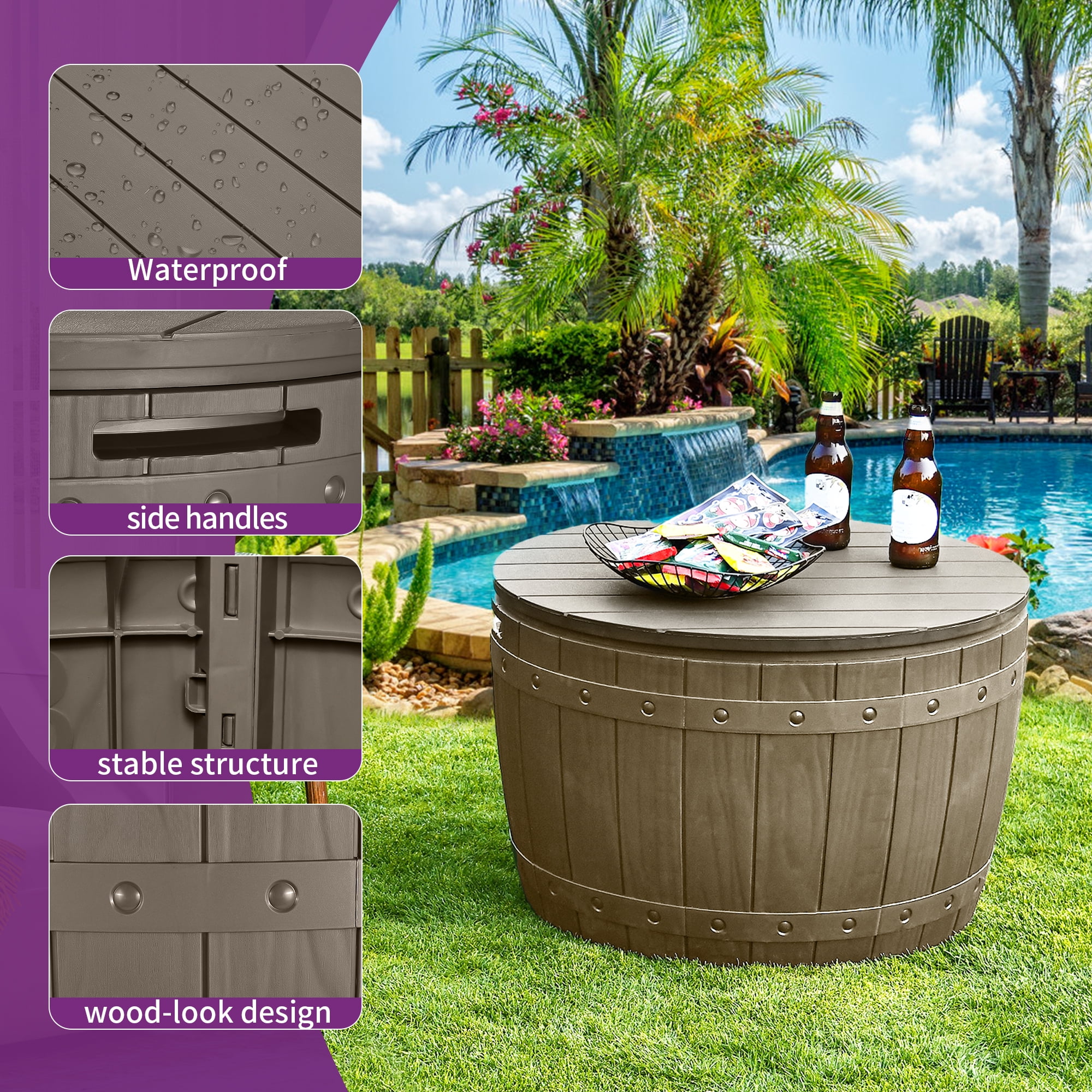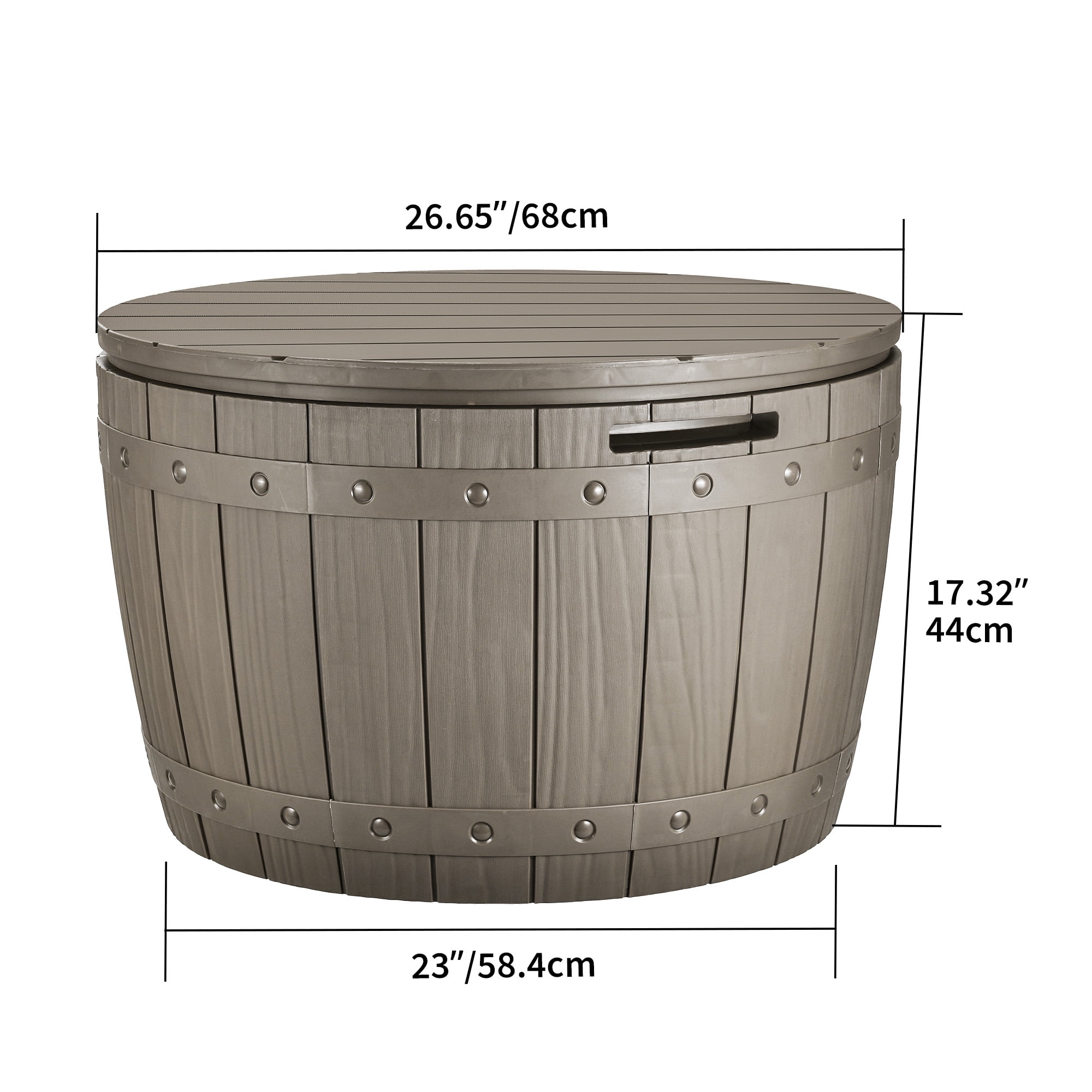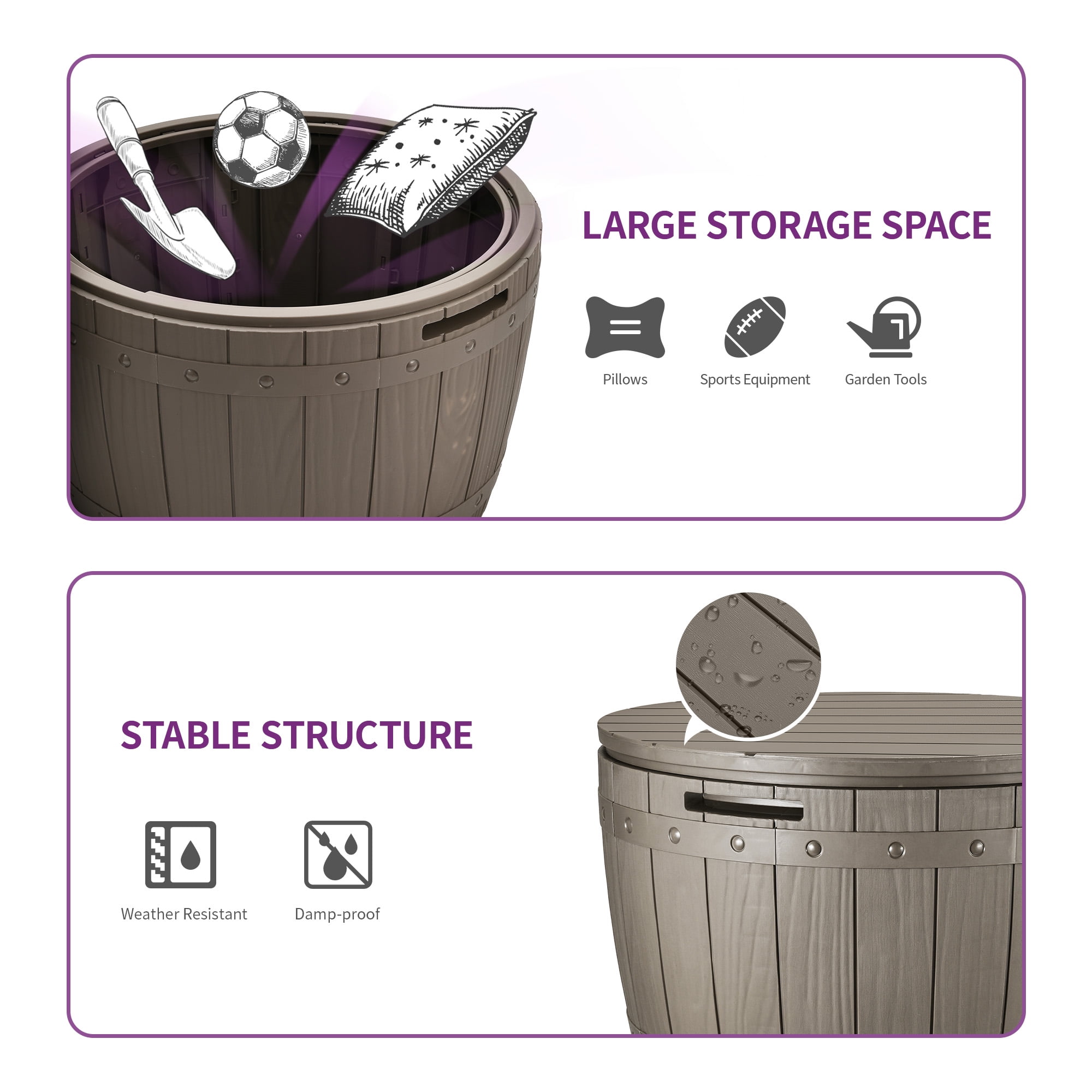Dextrus Outdoor Waterproof 33 gal Resin Deck box, Light Brown Ample Storage Space: with dimensions of 26.65”L x 26.65”W x 17.32”H and a 33-gallon capacity, this outdoor storage box provides easy access for storing small items, helping to keep your garden and backyard organized User-Friendly Design: Built-in handles on both sides allow for easy lifting and maneuvering, making it perfect for patio storage, resting your feet, or serving as a convenient surface for plates and drinks Weather-Resistant Durability: Constructed from weather-proof resin, this box features an attractive wooden grain appearance while offering waterproof, UV-resistant, rust-resistant, and mold-protective qualities for long-lasting use Simple Assembly: The easy LEGO-like KD (knocked-down) design requires no tools for assembly, allowing one person to effortlessly put all panels together Versatile Outdoor Storage: This round deck box is ideal for daily indoor or outdoor storage needs, such as cushions, toys, and gardening tools. It can also serve as a side table, coffee table, patio seating, storage ottoman, or footstool, complementing Adirondack Chairs and Chaise Lounge Chairs perfectly