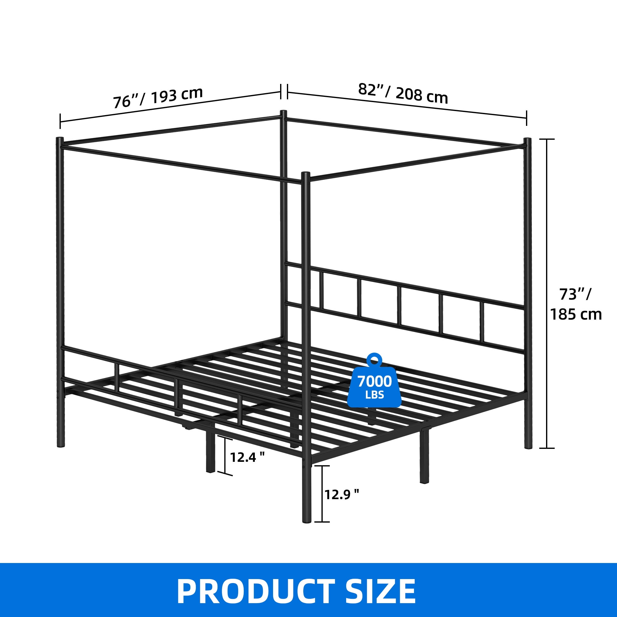 Product Description Elevate your bedroom with our Premium Metal Canopy Bed Frame, featuring a robust iron construction for long-lasting durability. The queen-sized frame offers a weight capacity of up to 900 lbs. With 14 inches of under-bed storage and upgraded slats for excellent mattress support, this bed frame combines form and function. Easy assembly and responsive customer service ensure a hassle-free experience. Experience superior sleep and style with our premium metal canopy bed frame. Specifications Size ??????Queen Color ??Black Material ??Alloy Steel Style ??Modern Shape ?Square Item Weight ?54?Pounds Assembly Required ?Yes Product Dimensions ?82.4 x 60 x 73.2 inches