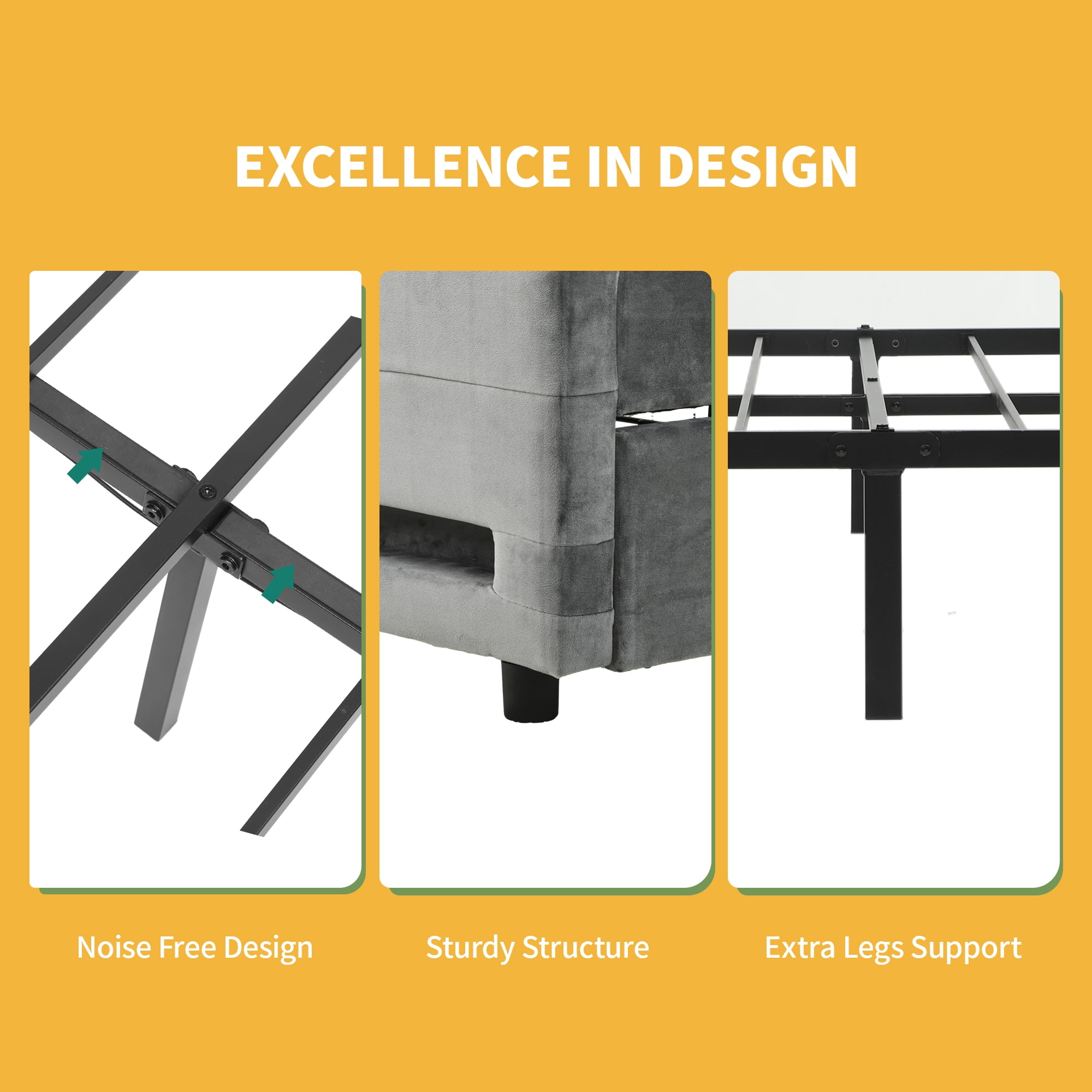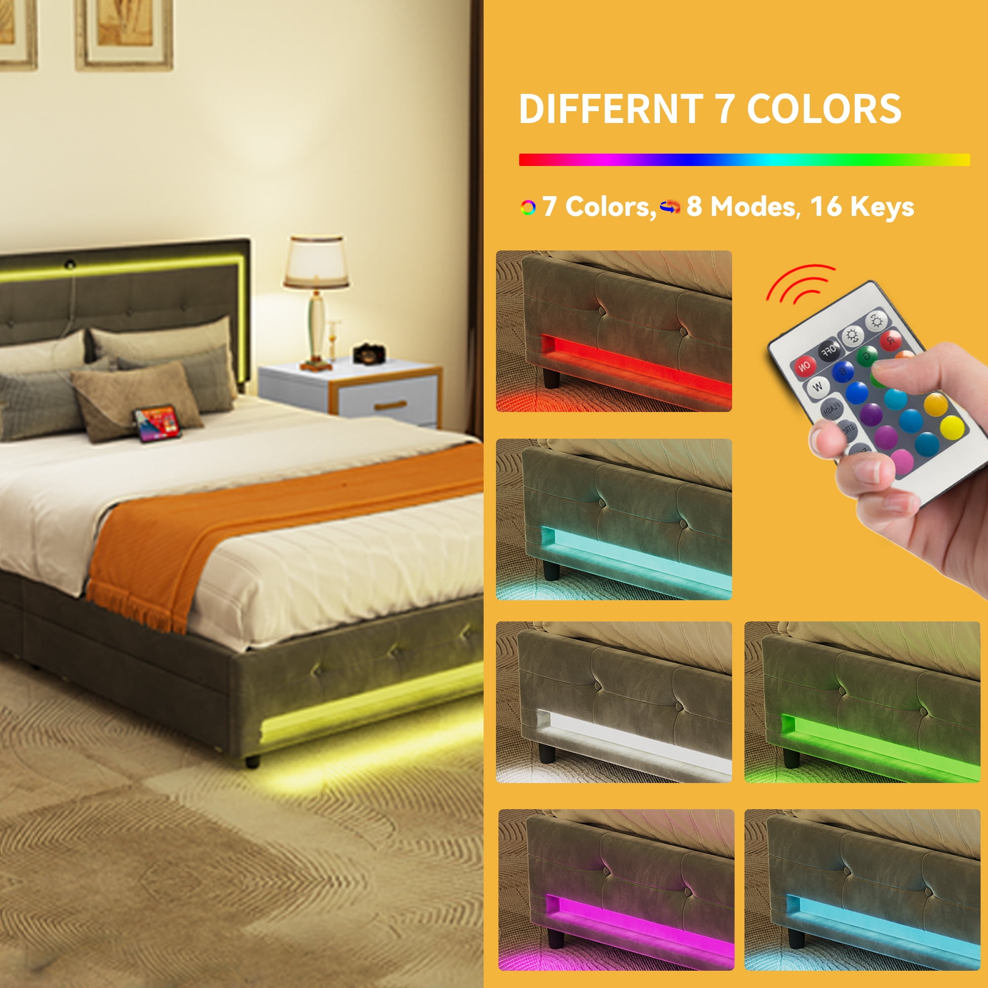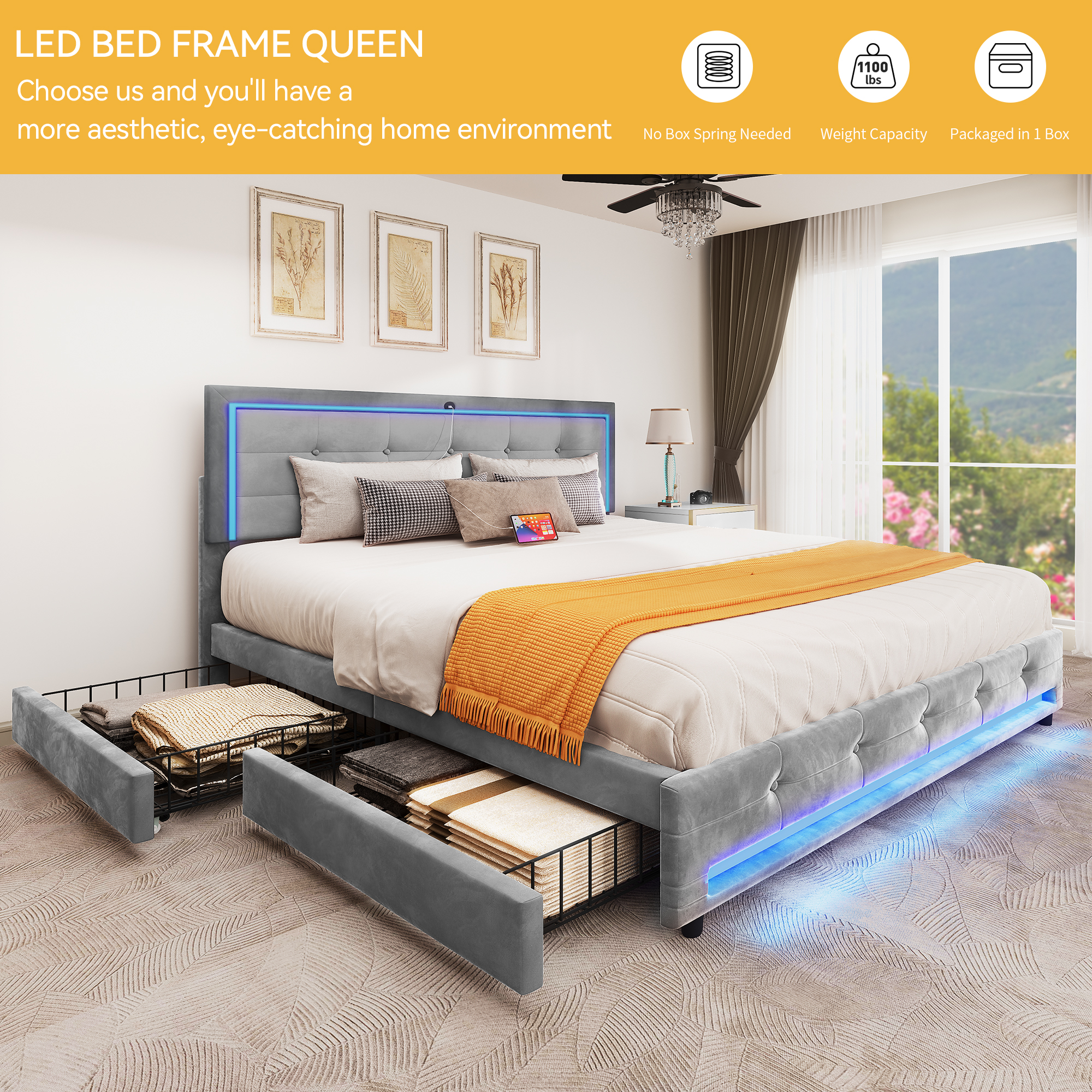 Dextrus Queen Size Modern Velvet Platform Bed with Storage, Gray Illuminate Your Space with LED Elegance: Features dynamic LED lighting to set the mood in your bedroom with customizable brightness, color, and mode Effortless Device Charging: Built-in power strip with two USB ports in the headboard for easy device charging without leaving your bed Intelligent Storage and Adjustable Headboard: Adjustable headboard accommodates mattresses from 10 to 13 inches thick, with four spacious drawers for organized storage Robust Support System: Engineered with 12 sturdy wooden slats, 2 metal supports, and 9 support legs, eliminating the need for a box spring and supporting up to 1100 lbs Easy Assembly: Delivered in one package with clearly labeled parts and detailed instructions for straightforward assembly, intended for two people