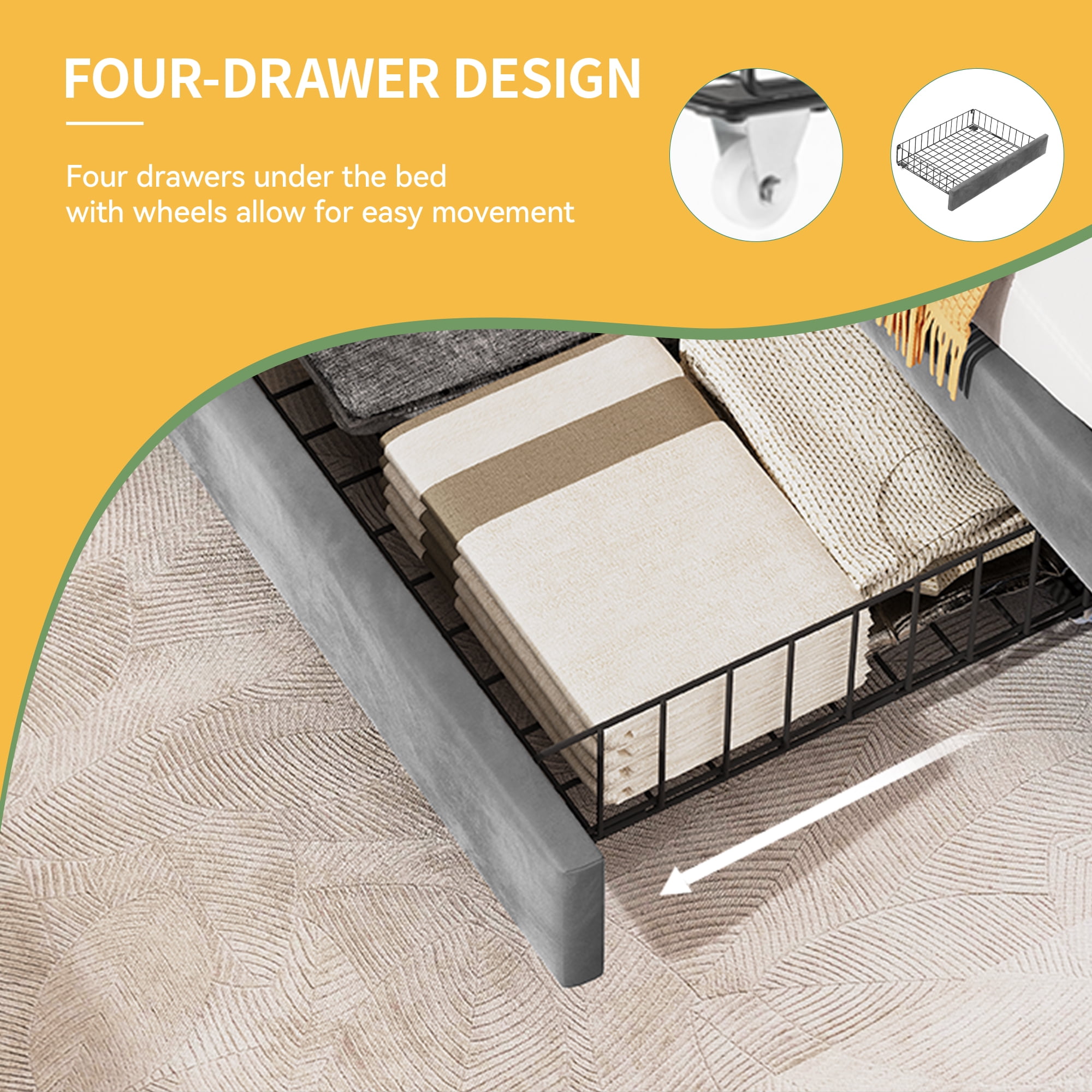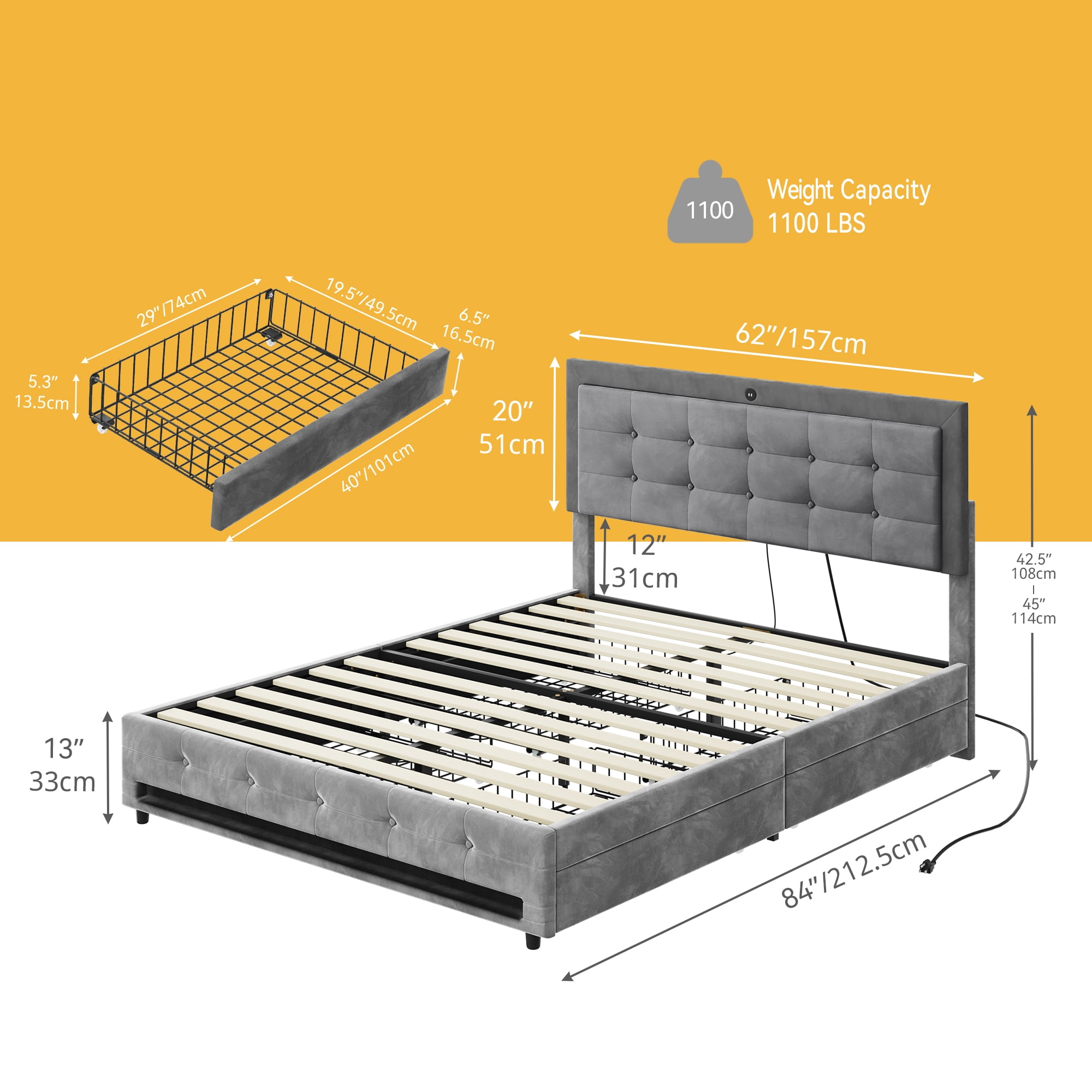 ” Product Description Discover the perfect blend of convenience and durability with our queen-sized bed. Our intelligent storage design features a customizable headboard to accommodate mattresses from 10 to 13 inches, along with four spacious drawers for seamless organization. Enjoy the robust support system, including 12 wooden slats and 2 metal supports, eliminating the need for a box spring. With a weight capacity of up to 1100 lbs.The parts are clearly labeled and numbered, and you can easily follow the detailed instructions. We are available to answer any questions you may have to ensure your satisfaction. Specifications Size : Queen Product Dimensions : 84″”L x 62″”W x 45″”H Color : Grey Material : Wood, Alloy Steel Maximum Weight Recommendation : 1100 Pounds Item Weight : 109 Pounds “