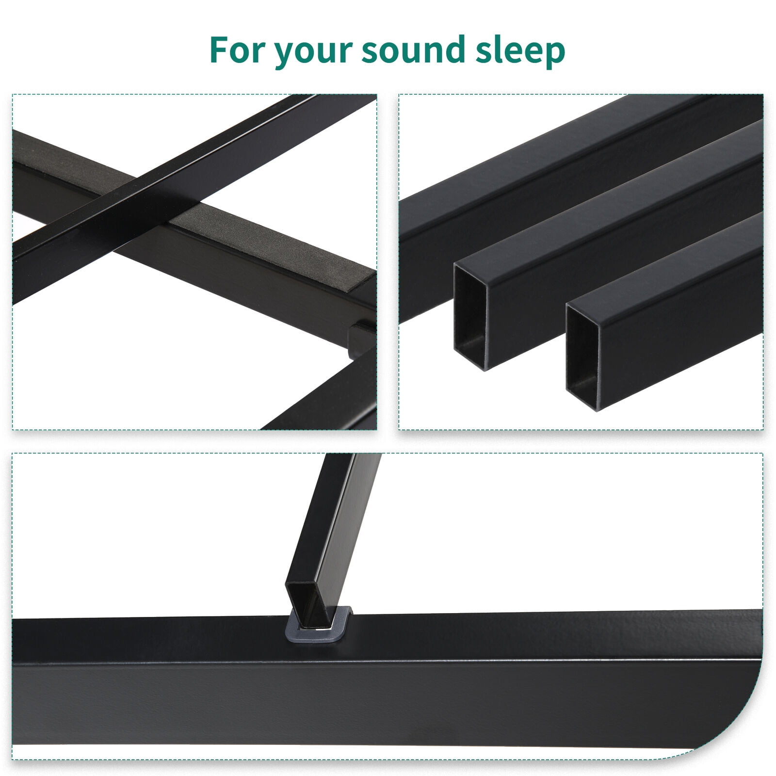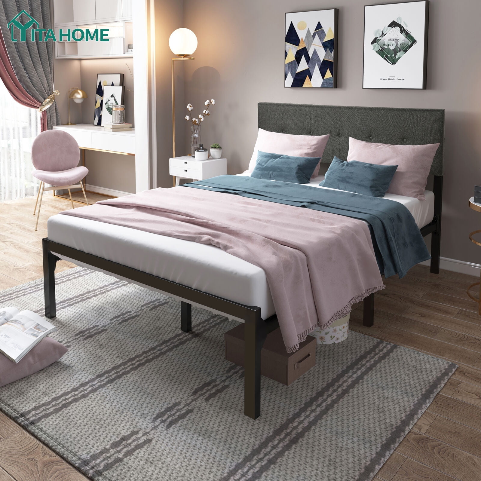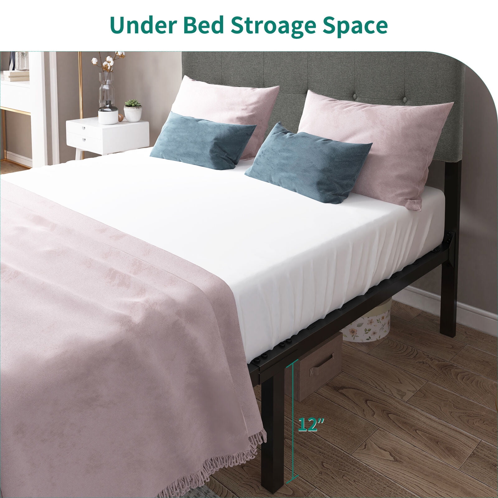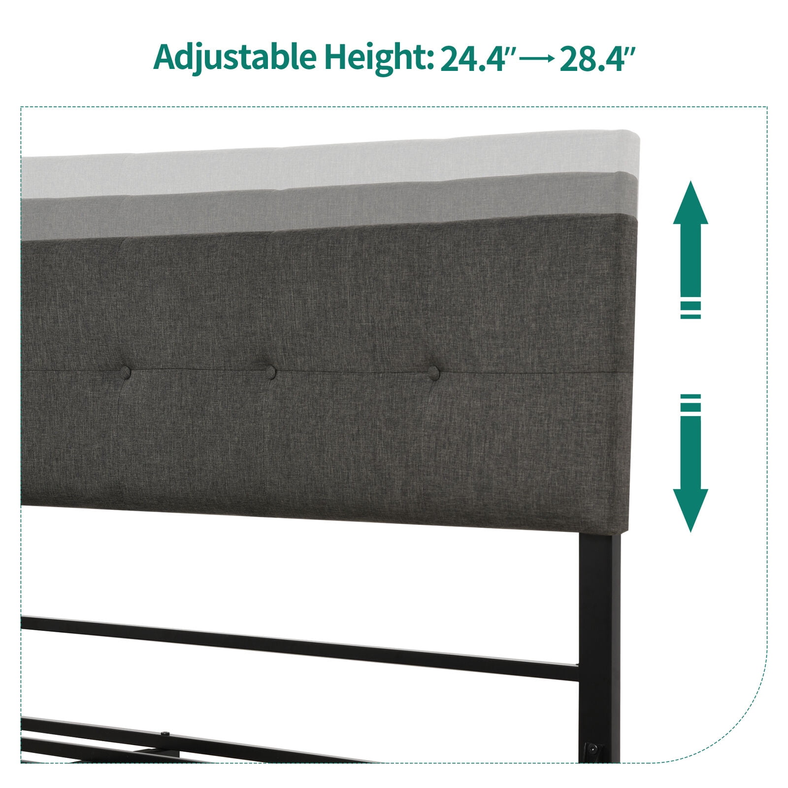 ADJUSTABLE HEADBOARD – There are 2 holes on the back of the headboard for you to adjust the height. Padded Headboard conforms to your body and offers you more comfort when relaxing. The button design on the soft linen headboard adds an elegant feel to the metal bed frame. This platform bed is suitable for contemporary, industrial, rustic decor homes. HEAVY-DUTY METAL FRAME – Features a thick & sturdy metal frame constructed from premium iron to provide the product with a longer lifespan; The bed frame can support up to 400 lbs(Full size)/ 500lbs(Queen Size). This platform bed stands 12″ off the floor and offers plenty of space for storing boxes. STABLE CONSTRUCTION – Triangular structure near the headboard and central metal legs improve overall stability; Sturdy slats provide strong support and prevent the mattress from sagging and extend your mattress lifespan. NO BOX SPRING NEEDED – Easy to assemble due to the minimalist design; Directly place a mattress pad on the platform bed, no box spring required. ENJOY SOUND SLEEP- Anti-scratch foot pads for top-notched comfort keep the floor or mats free from harm. VEA pads on slats help to reduce noise. EASY ASSEMBLY- Packed in one box for moving around easily. It may take you 30 mins to finish the whole assembling with the help of the users’ manual. Please follow the instructions, and professional installation recommended.
