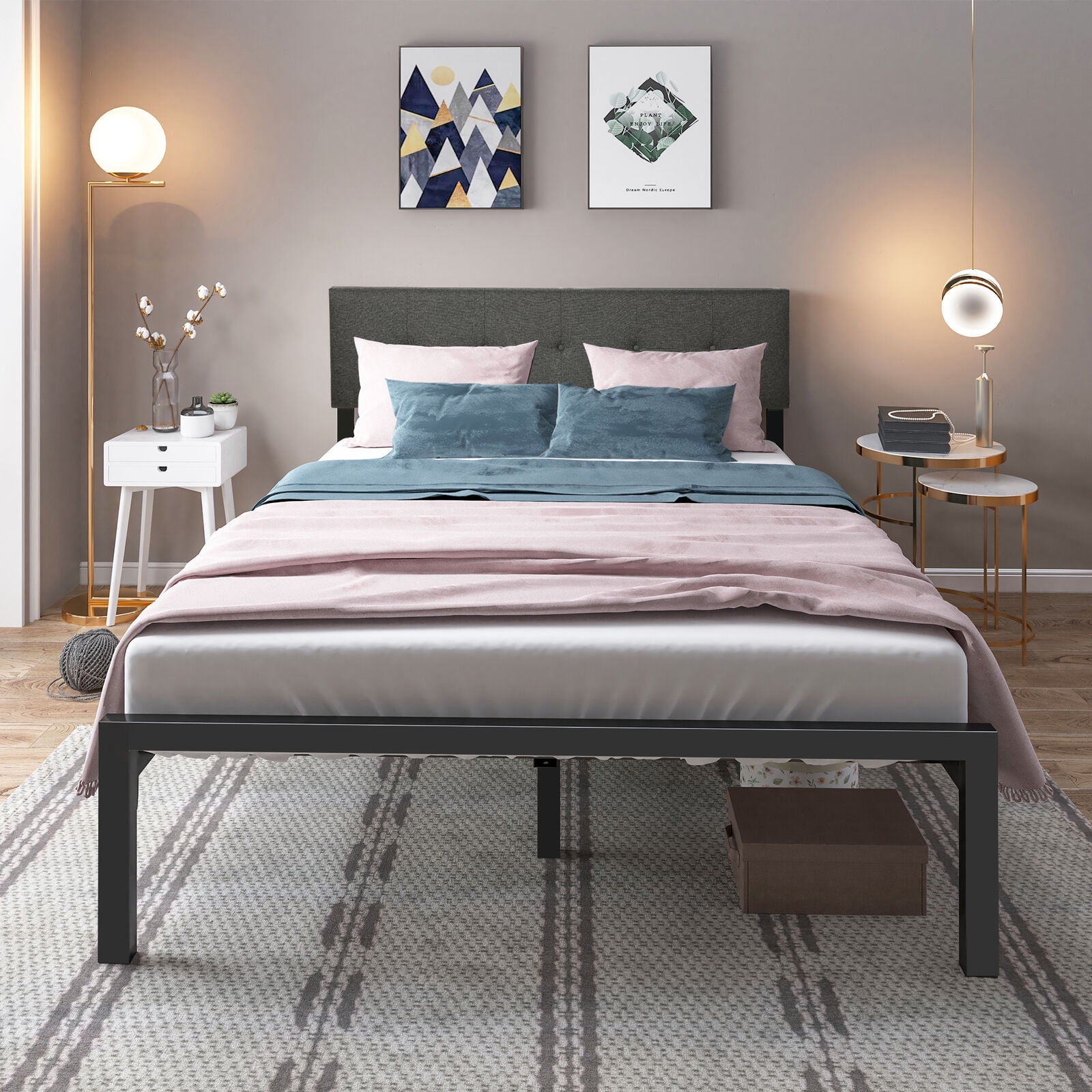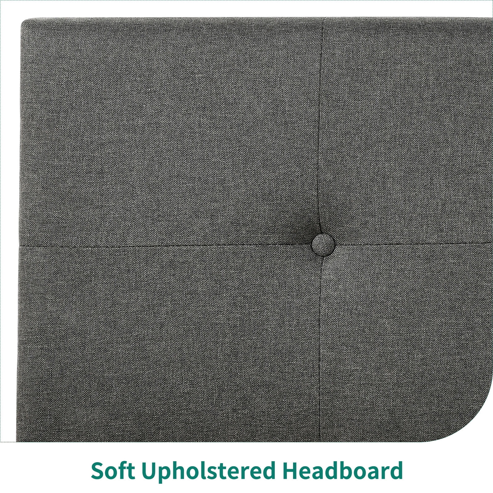 ” Product Description This platform bed combines the softness of the linen with the coolness of the metal, creating a sleek and elegant tone; No box spring is needed. The button design on the upholstered headboard adds a tailored touch that will blend in well with contemporary, industrial, rustic, and other decor styles. The skin-friendly linen finish and thick foam padding offer superior comfort when you lean on the headboard.There are 2 holes on the back of the headboard for you to adjust the height. Padded Headboard conforms to your body and offers you more comfort when relaxing. The button design on the soft linen headboard adds an elegant feel to the metal bed frame. This platform bed is suitable for contemporary, industrial, rustic decor homes. Specifications Brand:Dextrus Size: QUEEN Color: Grey Maximum Weight Capacity: 500 Lbs Notes: 1. Please kindly known: The Mattress is not included. 2. Confirm the appropriate furniture size for your needs prior to purchase “