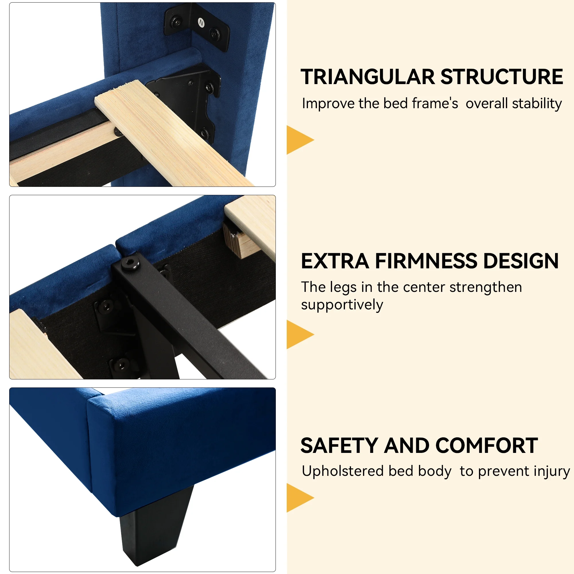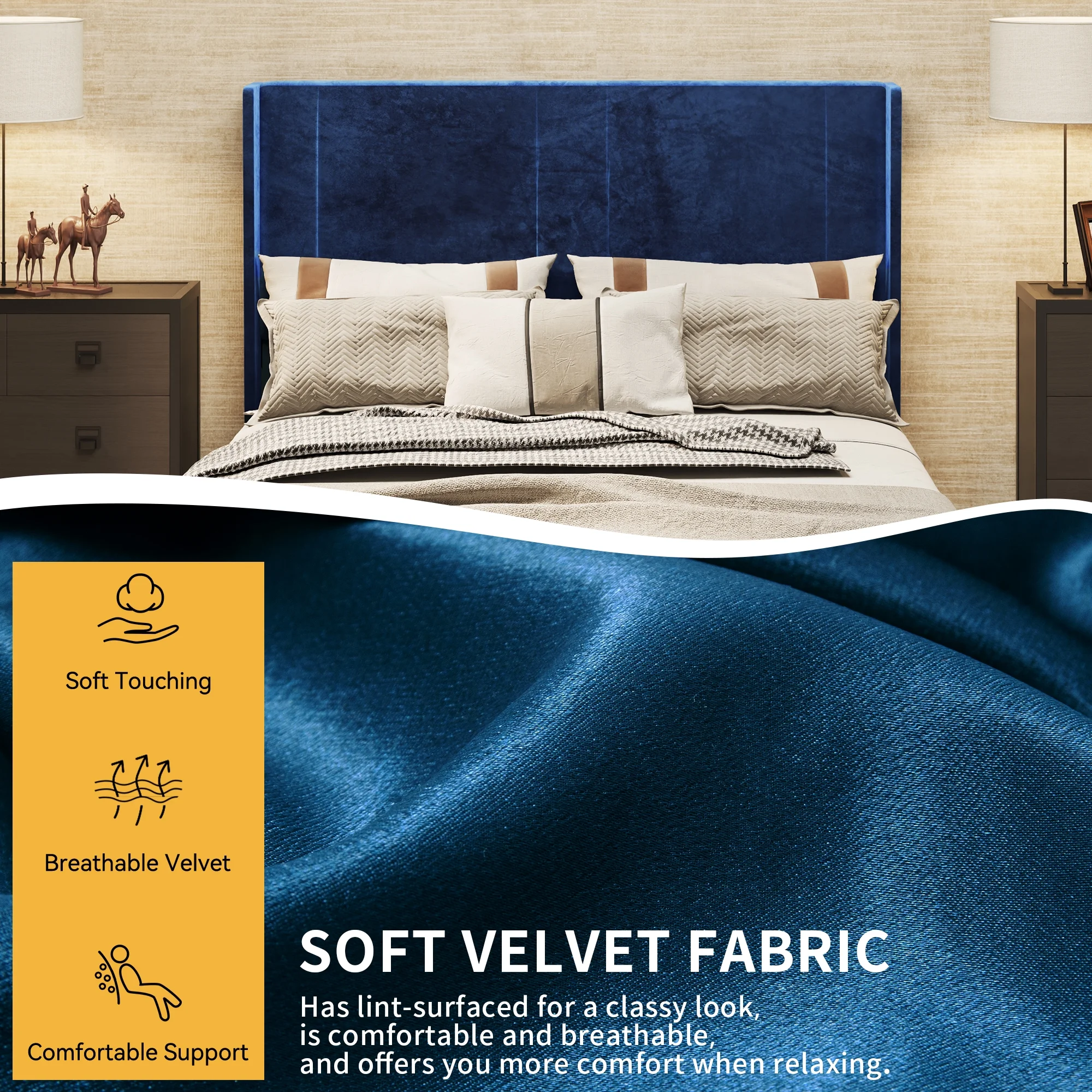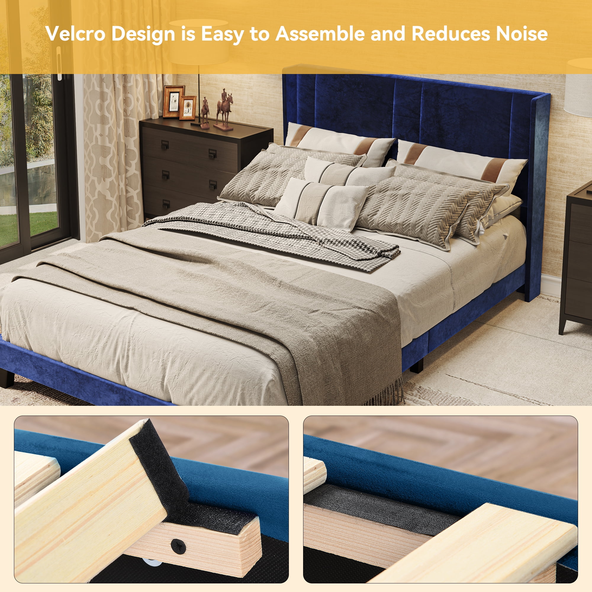 Dextrus Queen Upholstered Platform Bed with Navy Blue Velvet Headboard,No Box Spring Needed