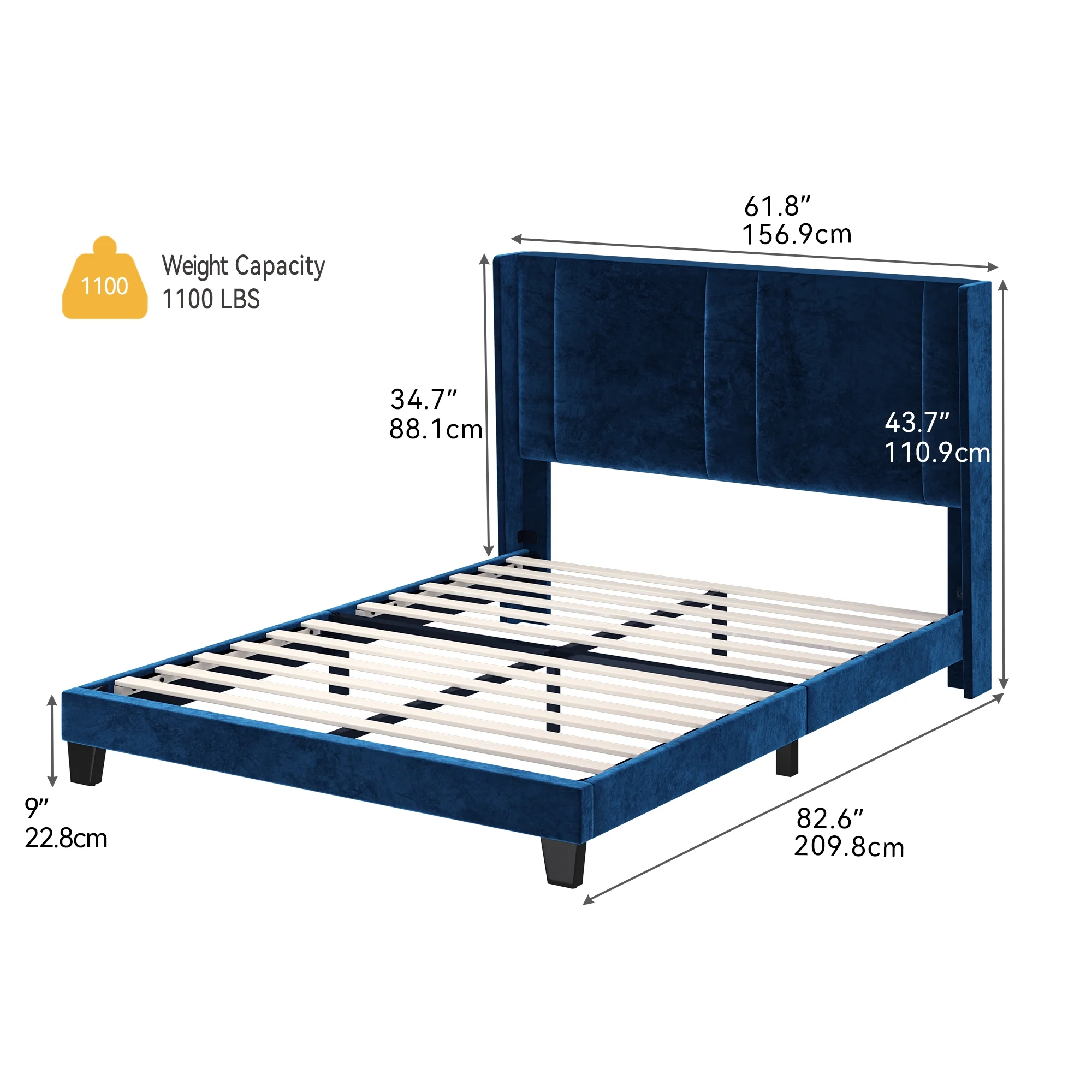 EASY ASSEMBLY- To avoid missing carton, it is smartly packaged in one carton for moving around easily. It may take you 30 mins to finish the whole assembling under the help of users’ manual. HUMANIZED DETAIL- The triangular structure near the headboard and the supportive legs in the center improve overall stability; Middle bed legs are upgraded, anti-scratch foot pads keep the floor or mats free from harm. Stickers on slats help to reduce noise. STURDY AND STABLE CONSTRUCTION- Features a thick & sturdy metal frame constructed from premium iron to provide product with a longer lifespan; The well-selected wood is sturdy and supports mattress stably. The bed frame can support up to 400 lbs(Full size)/ 500lbs(Queen Size). WINGBACK VELVET HEADBOARD- Has a lint-surfaced with rectangular tufting for a classy look. The wingback design conforms to human body and offers you more comfort when relax. NO BOX SPRING NEEDED- Easy to assemble due to the minimalist design; Directly place a mattress pad on the frame, no box spring required. Please follow the instructions, and professional installation recommended.