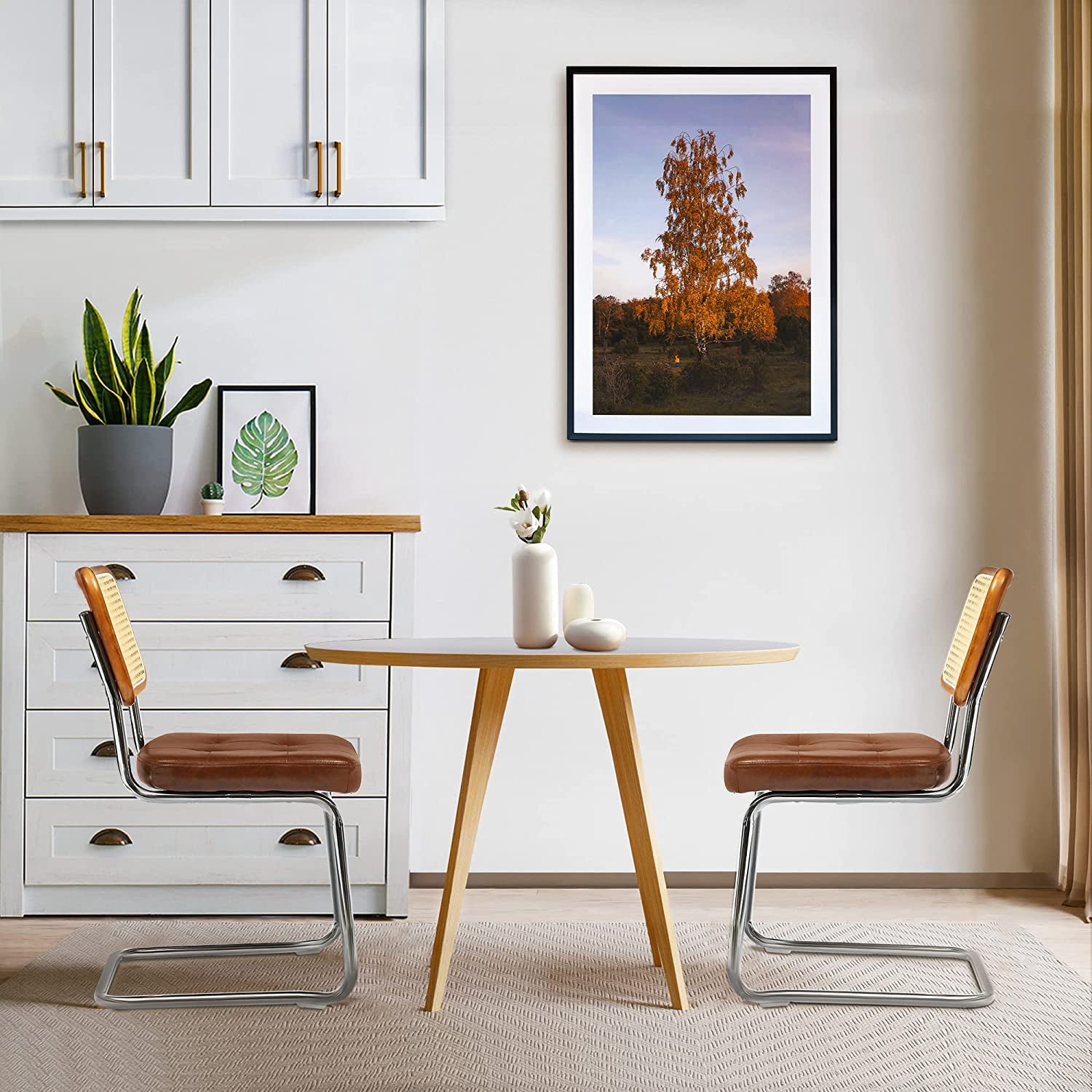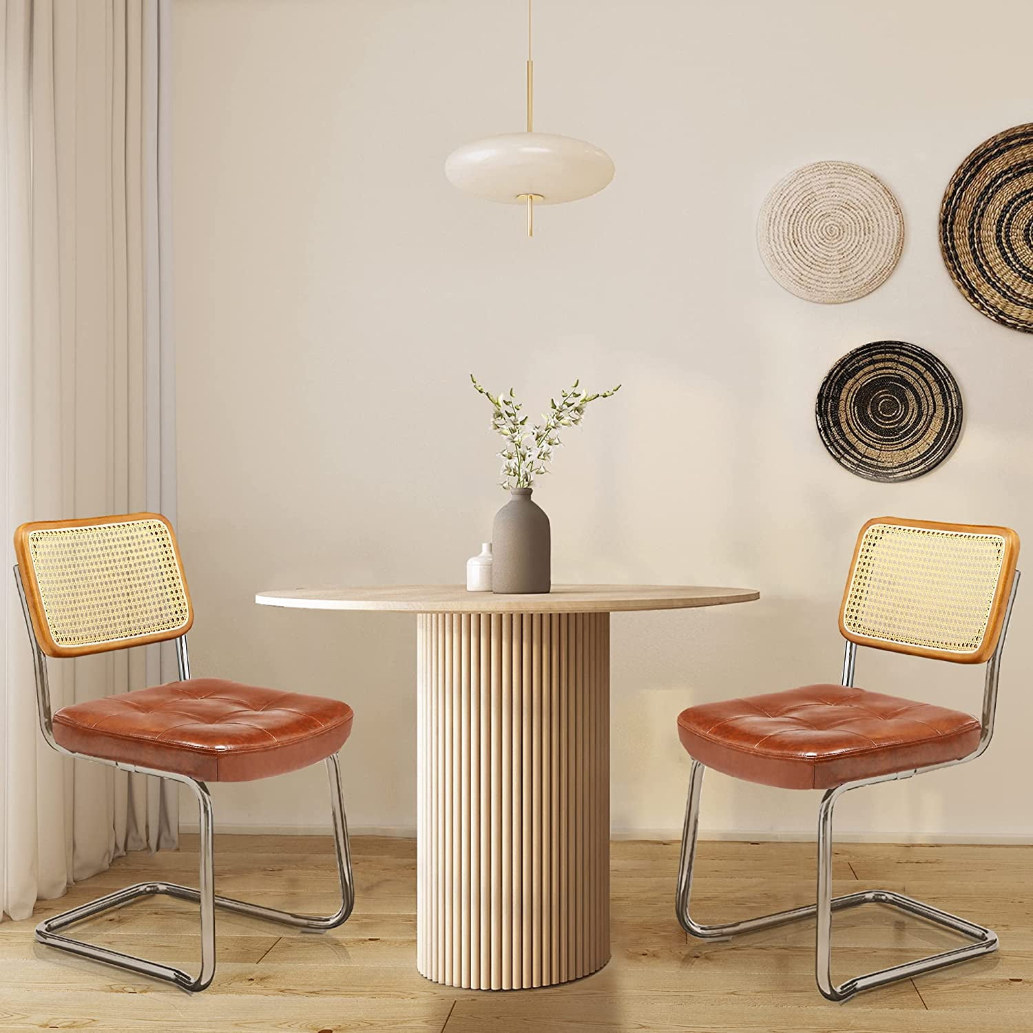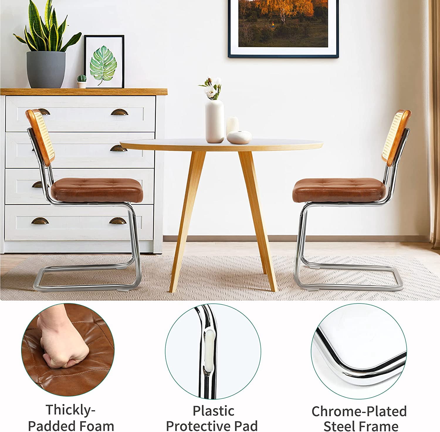 MID-CENTURY MODERN CHAIR: Backrest is made from rattan woven into a mesh and paired with wooden frame, embuing a simple yet elegant appearance that befits any space EXTREME COZINESS: High-density sponge-filled cushions are covered with PU leather upholstery; Weaving back cutout promotes permeability while being elastic, granting you comfortable back support at all times STURDY FRAME: Chrome-plated curved steel frame encompasses stable structural support; Two plastic protective pads are attentively added on the chair’s bottom to protect your floor and reduce noise MULTIFUNCTIONAL USE: The modern rattan dining chair set exudes a lasting charm that can perfectly enhance the aesthetics of your dining room, kitchen, living room, bedroom, and home office; Provides enough sitting space for dinner parties or family meals EASY ASSEMBLY: Follow the included instructions for an easy 15-minute assembly of the elegant dining chairs, freeing up more time to enjoy gatherings with family and friends; All parts and instructions are included