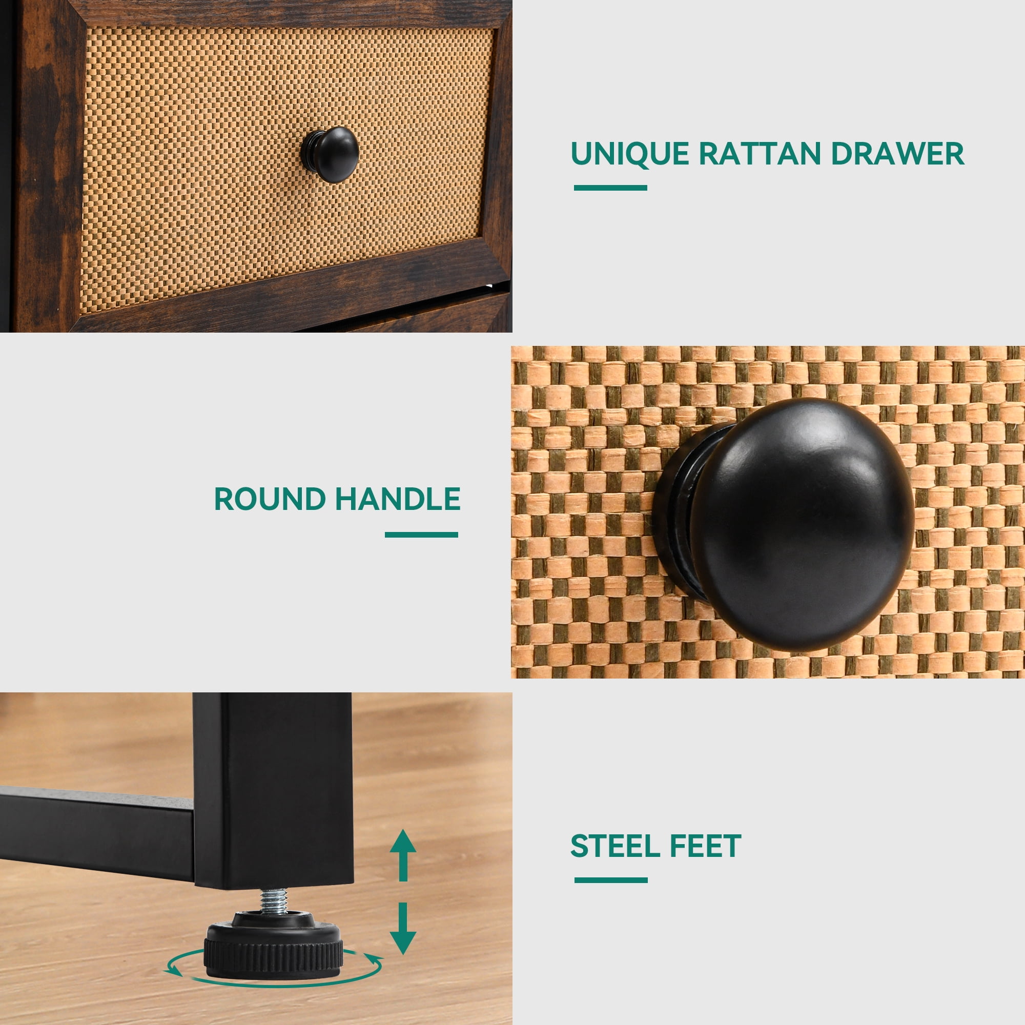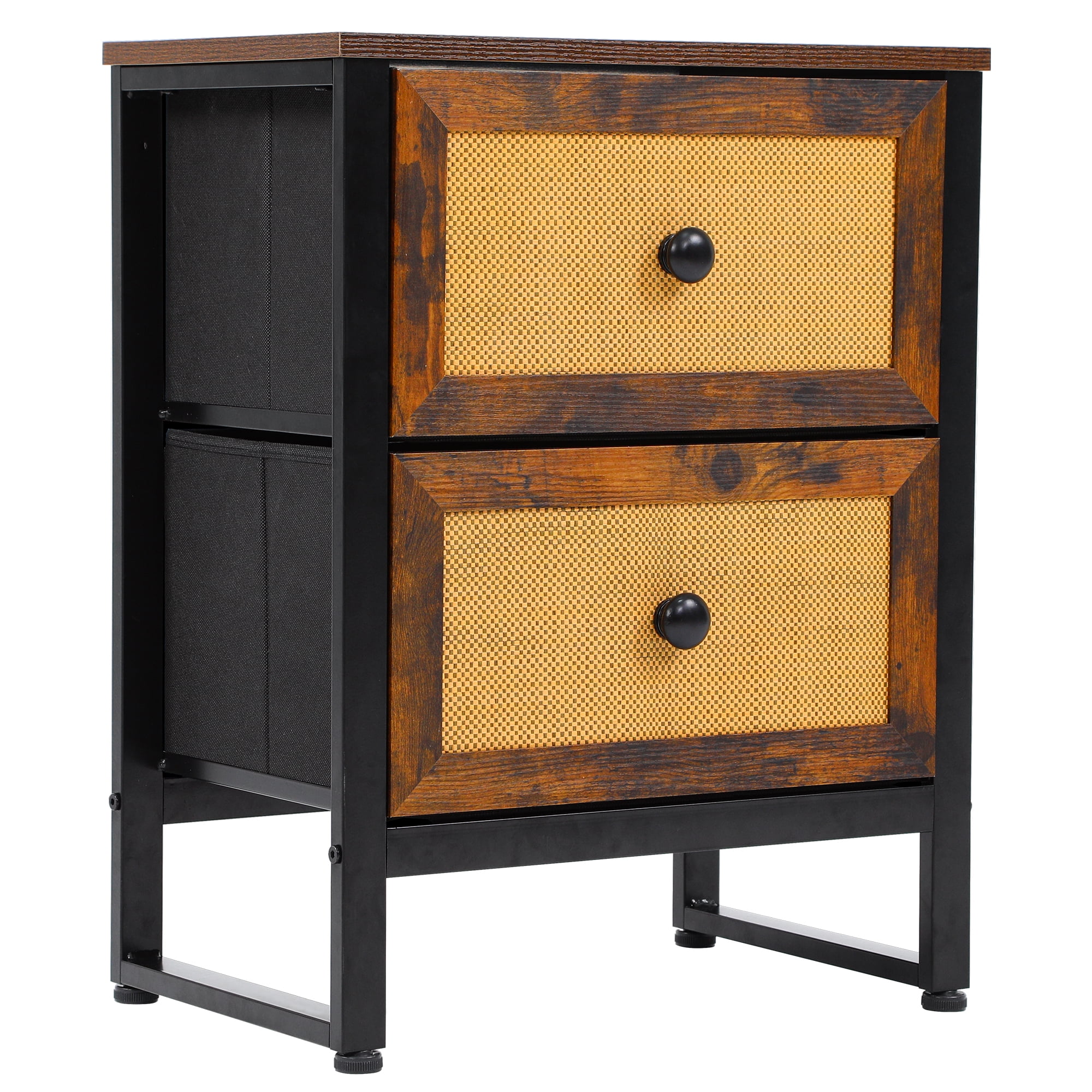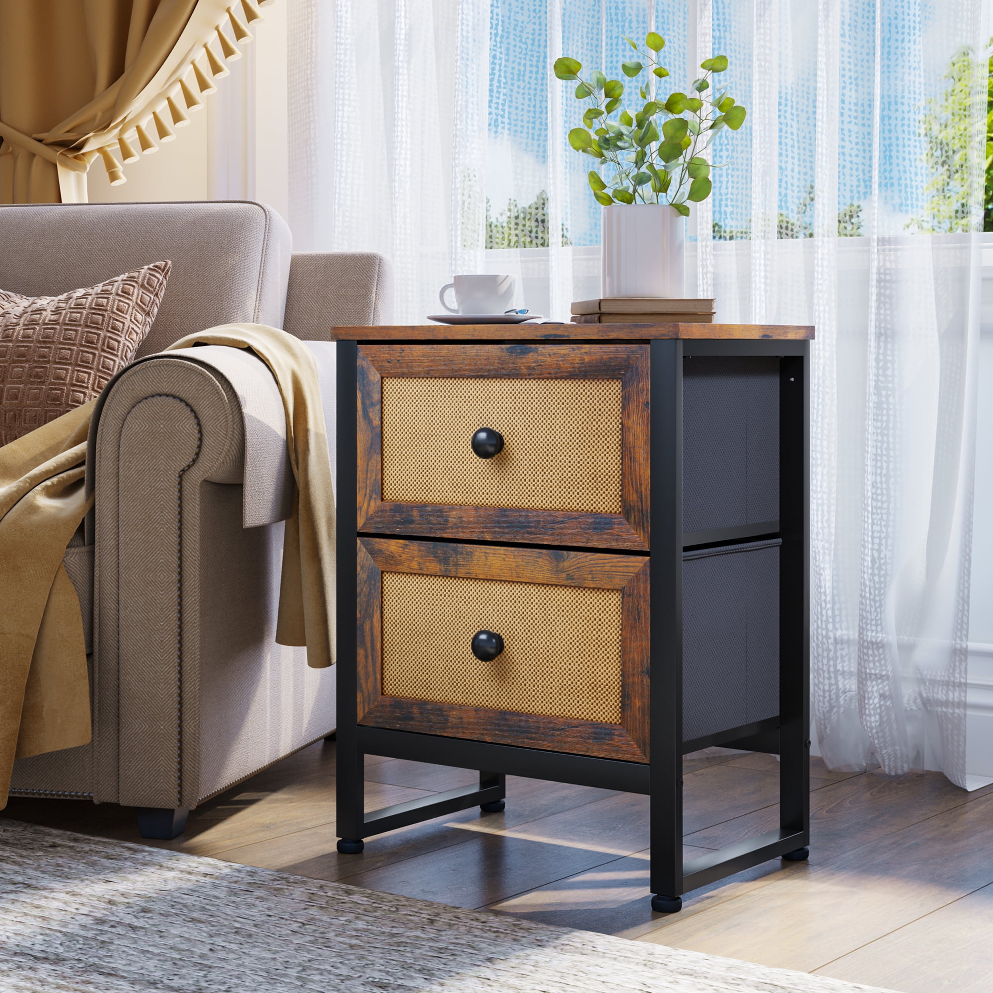 Dextrus Rattan Nightstand with 2 Drawers, Rustic Brown Thickened metal frame provides robust support with removable and foldable drawers featuring wood knob handles for smooth operation Constructed from MDF wooden top and particleboard, offering heavy-duty durability for long-term use Includes detailed instructions and an installation video for easy assembly, along with all necessary hardware Versatile height makes it suitable as a bedside table or end table, fitting seamlessly in various spaces like living rooms, bedrooms, and entryways Top surface supports up to 20kg, with each drawer holding up to 5kg, providing ample load-bearing capacity
