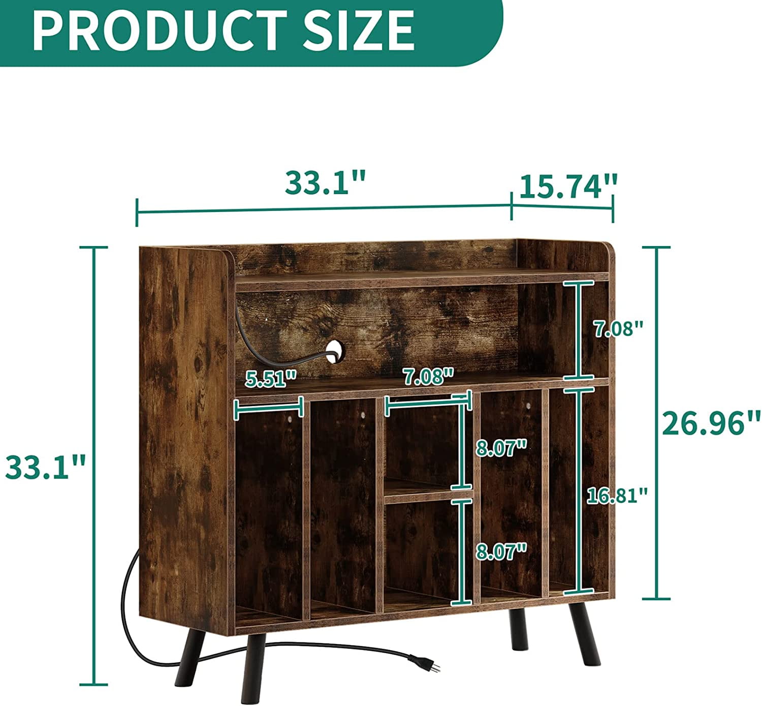 Give your living room or entertainment space a retro look with the DEXTRUS turntable stand. Inspired by mid-century design, the rustic brown woodgrain finish on the laminated particleboard and MDF pairs with the black metal hairpin legs for a retro twist. The record stand is the perfect size to place your record player and the open cubbies offer plenty of options to keep your albums organized. You can store them upright in the 4 lower cubbies or keep your favorites at the top in the large upper cubby. It can be used not only as a media storage cabinet , but also as a nightstand, record shelf. You can place it in the living room, bedroom, office.