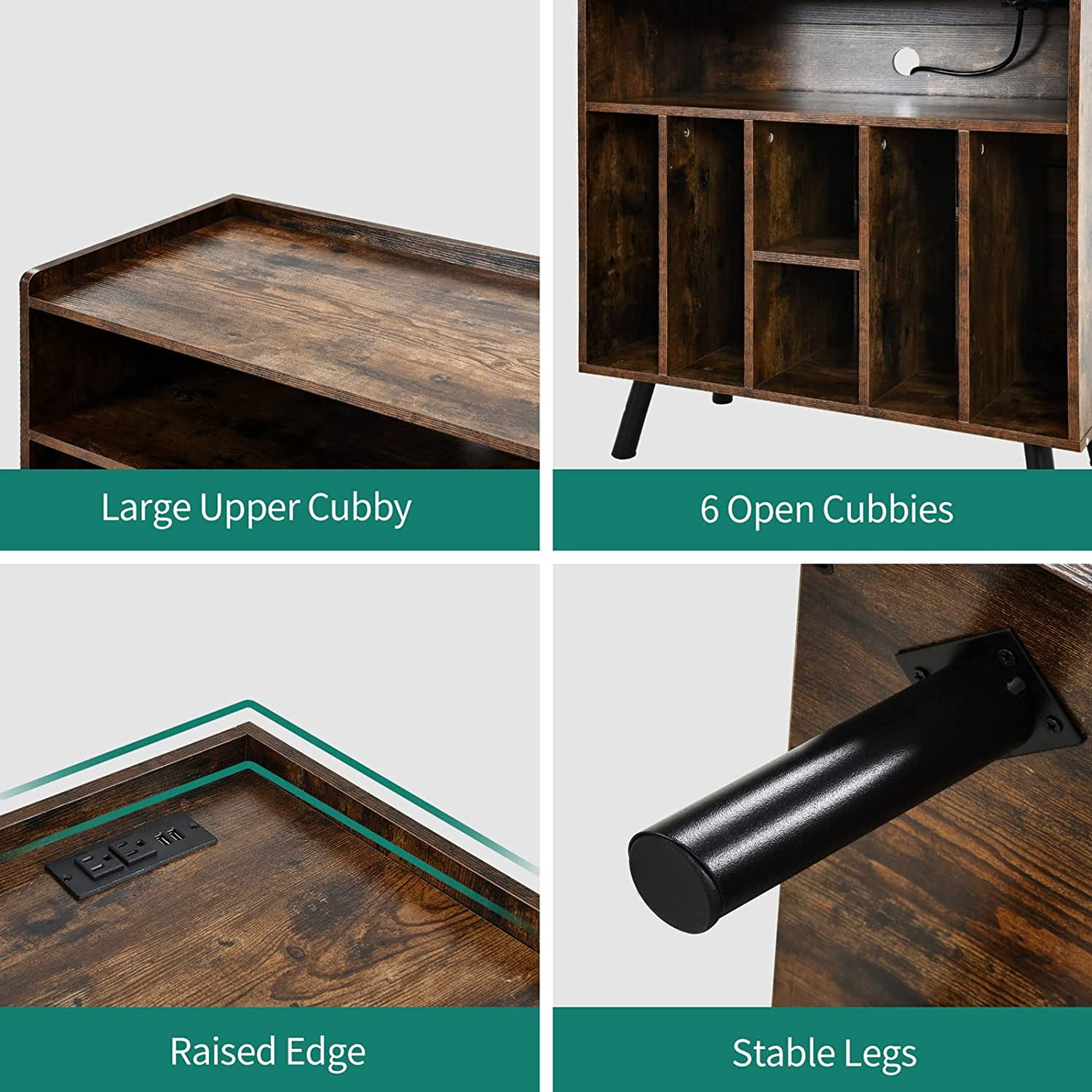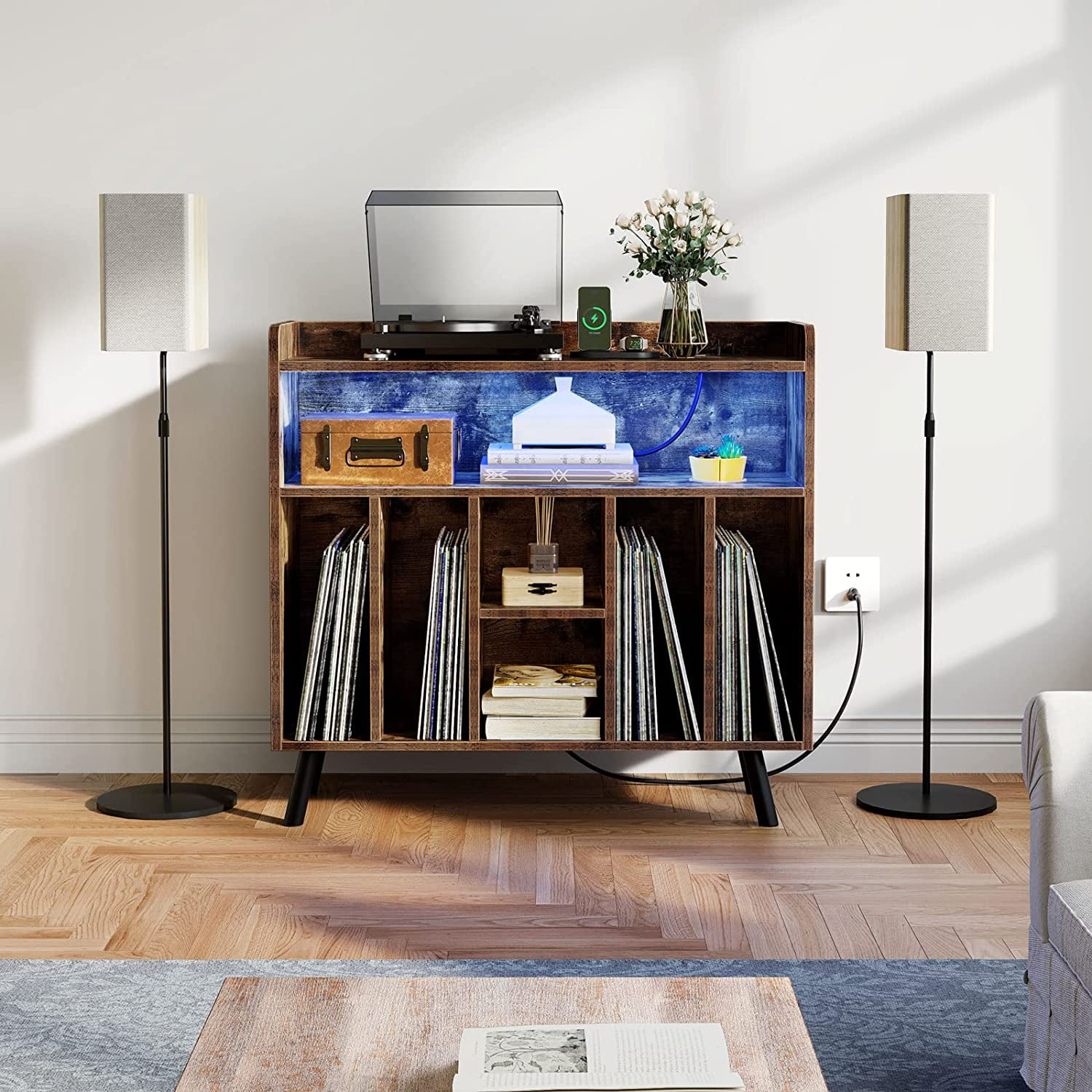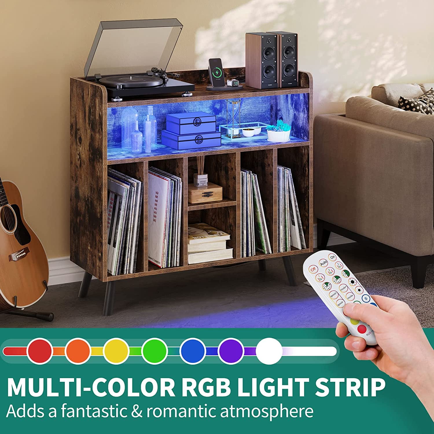 DYNAMIC LED LIGHTING: Elevate your record collection with a captivating multi-color RGB LED light strip, easily controlled via a Phone App or remote. The intelligent music synchronization feature ensures the LEDs groove to the rhythm. SPACIOUS STORAGE: This turntable stand boasts 6 cubbies to accommodate up to 200 albums, keeping them organized and accessible. The roomy top and upper open storage are ideal for your record player and media essentials. CONVENIENT CHARGING HUB: Our record player stand functions as a convenient charging station for your record player, DVD, TV, and projector. It has two USB ports and two regular plug outlets. A flawless fusion of design and utility. ROBUST AND VERSATILE: This display holder is built to last thanks to its robust legs and solid boards construction. It can be used as a projector stand, entry table, or side table in addition to being a record shelf. EASY INSTALLATION & IN-TIME SUPPORT: The detailed directions are easy to follow, and each item is labeled for smooth assembly. Please come to us if you run into any problems, we will quickly and satisfactorily fix them.