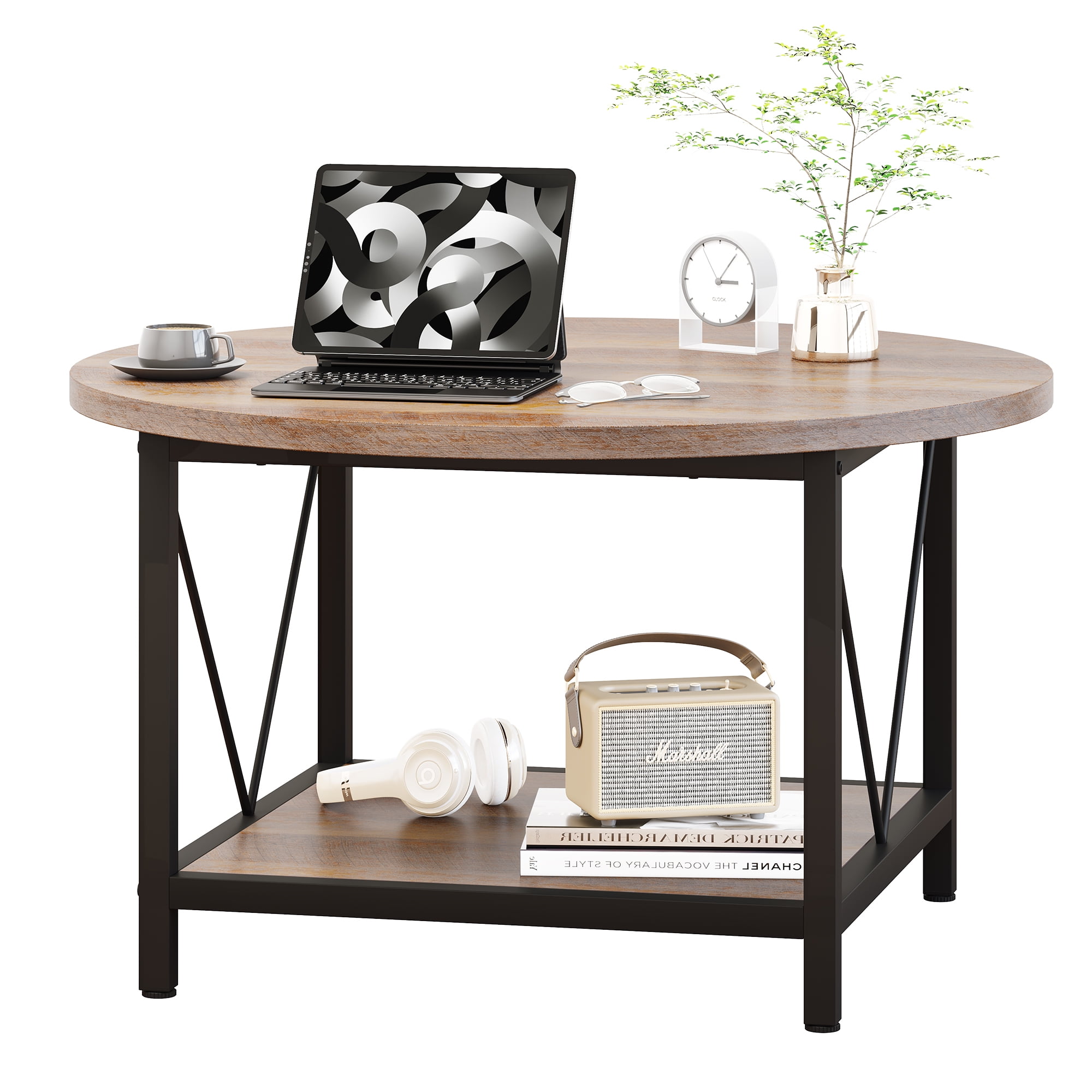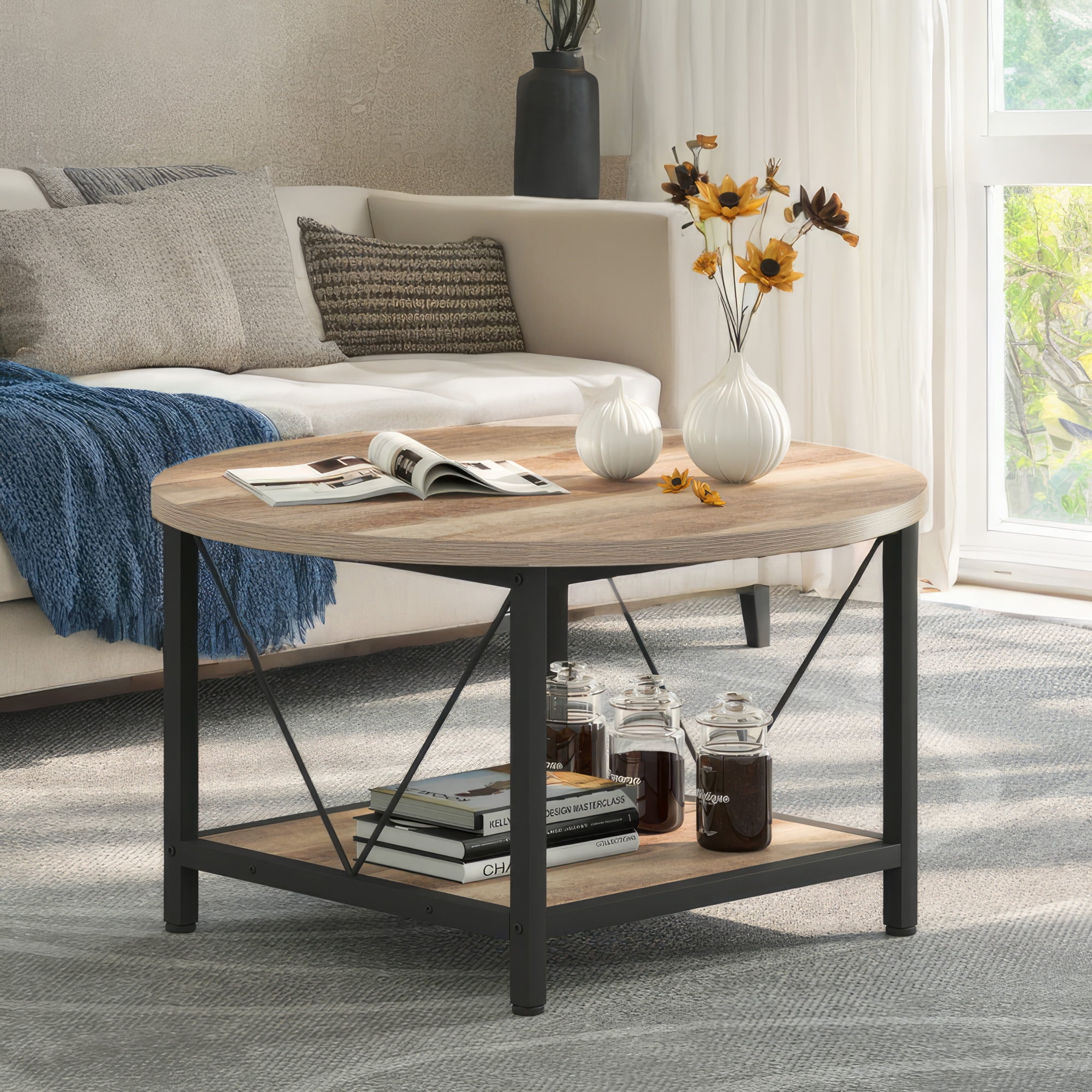 Dextrus Round Coffee Table with Storage, Rustic Living Room Tables with Sturdy Metal Legs, Gray Wash
