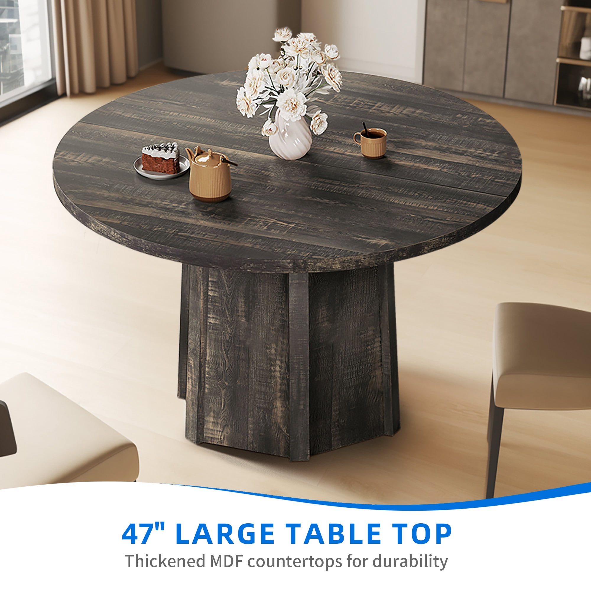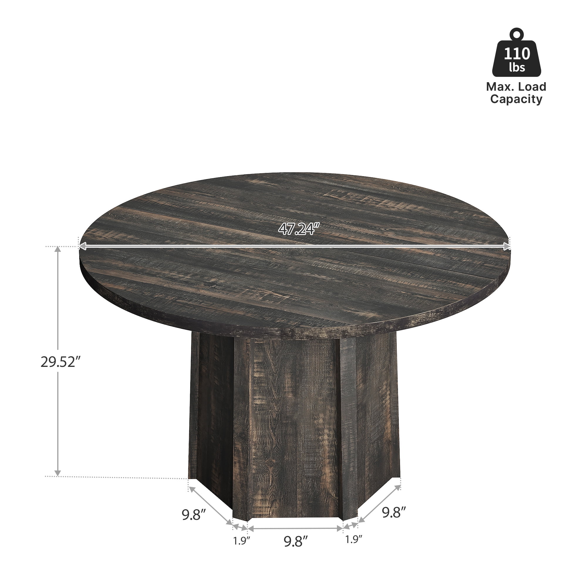 Introducing our 47″ Round Dining Table – a perfect addition to your industrial farmhouse or modern dining room. The 1.18″ thick wood grain tabletop provides ample space to accommodate up to 4-6 people for meals or family gatherings. The rustic design of the table is accentuated by the unique hexagonal base, which not only looks great, but also provides sturdy support. The table is made of high-quality materials, ensuring durability and longevity. Whether you’re serving dinner, hosting guests, or simply enjoying a cup of coffee, this modern dining table is the perfect centerpiece for your space. Upgrade your dining area today with our stylish and functional 47″ Round Dining Table. SPECIFICATIONS: Dimensions: 47.24″D x 47.24″W x 29.54″H Material: Engineered Wood Color:Rustic Gray Item Weight: 72.31 pounds Style: Farmhouse,Rustic,Modern Package Included: 1 x Round Dining Table 1 x Instructions Manual