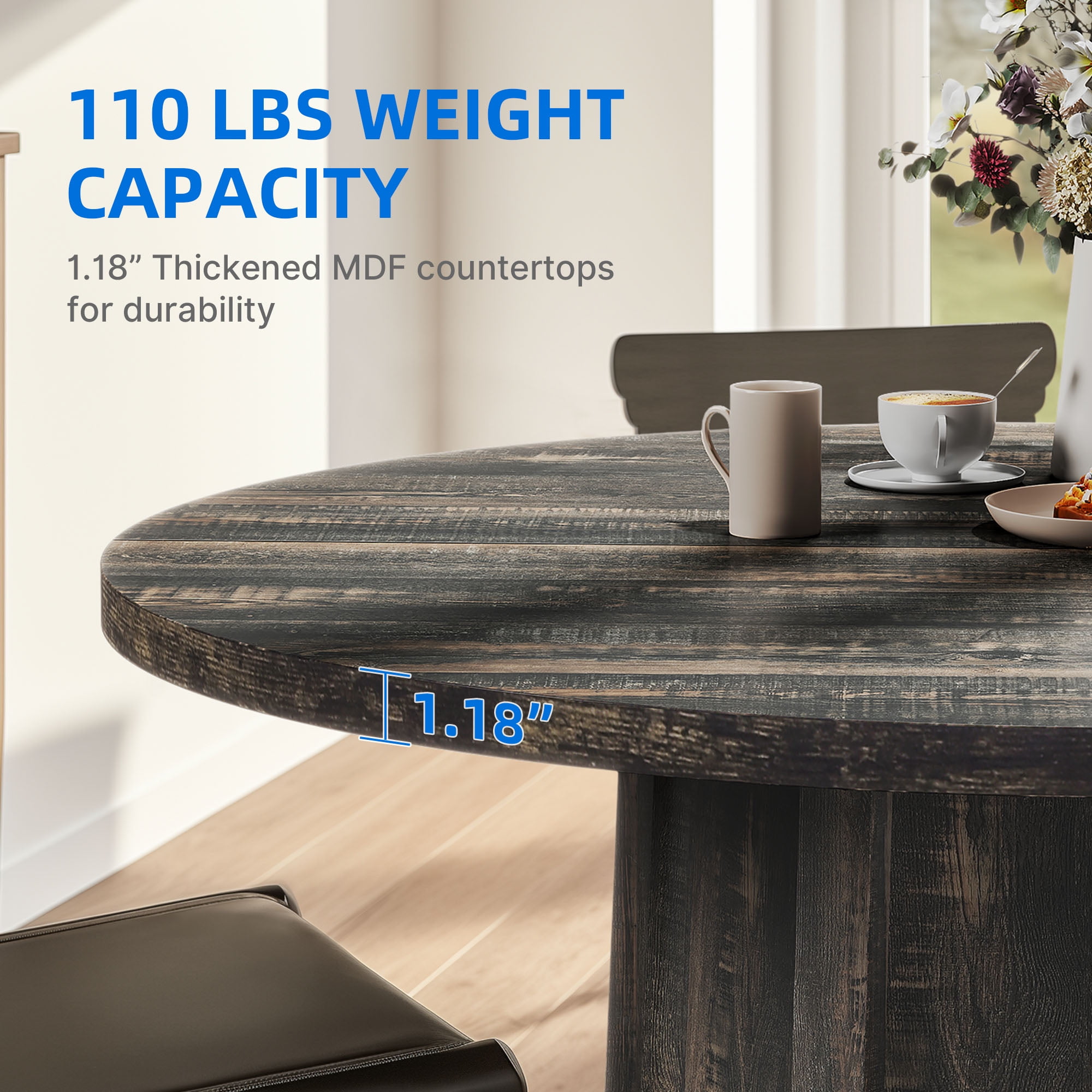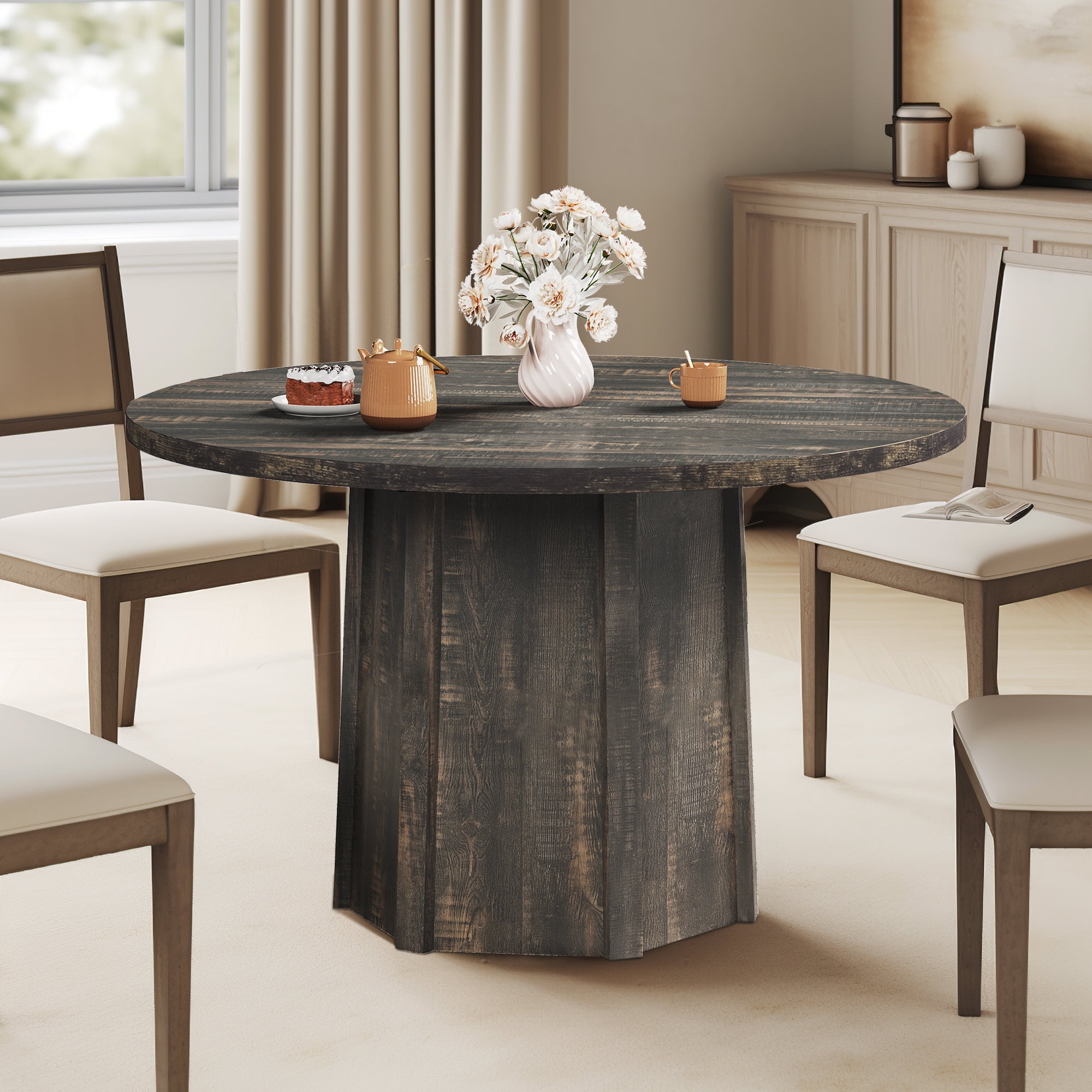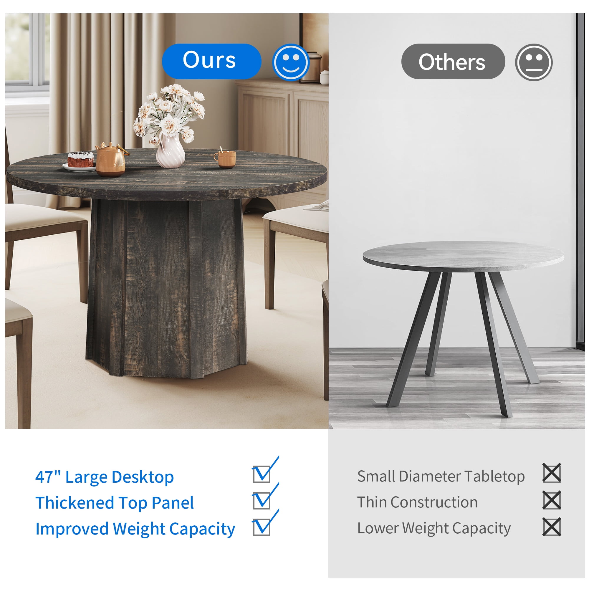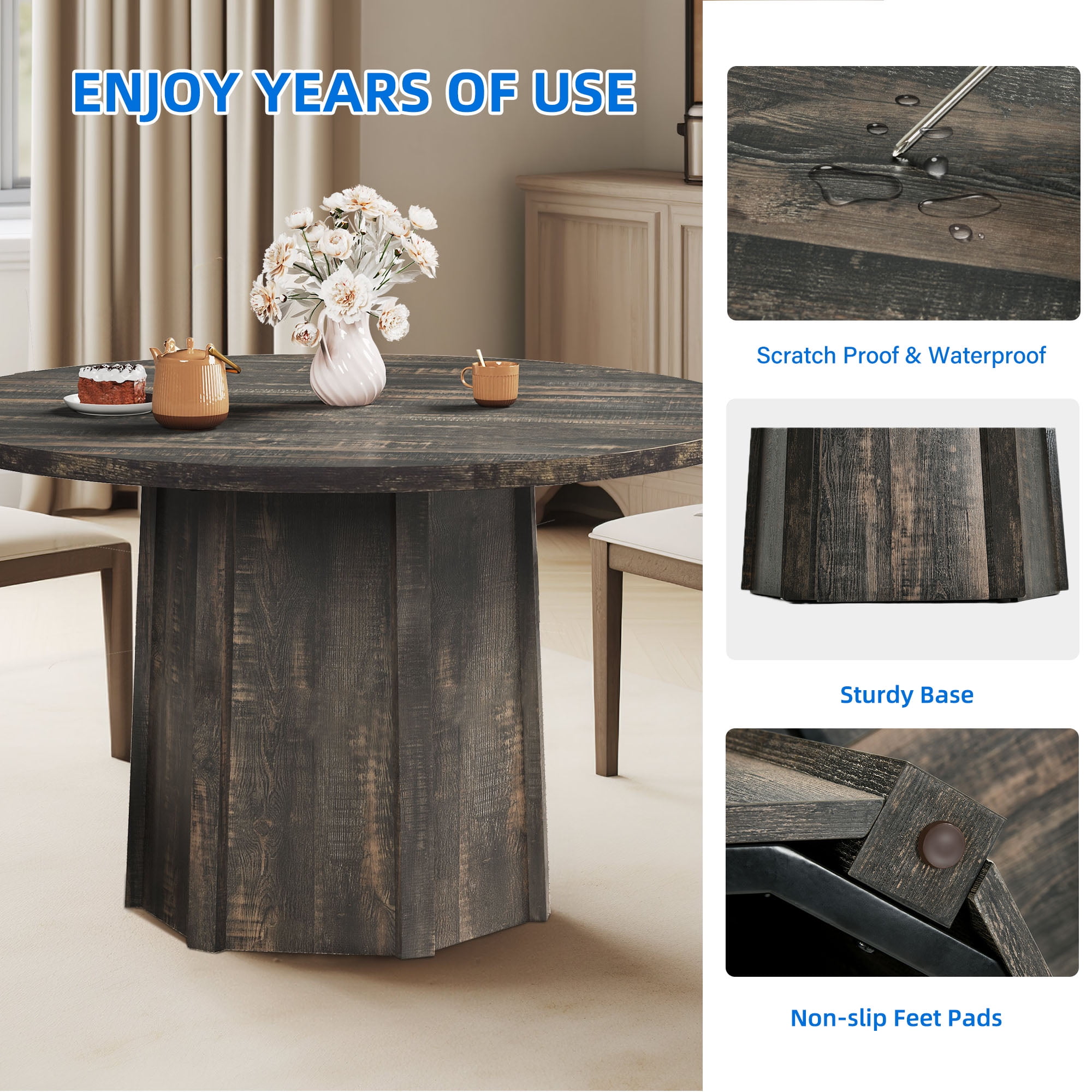 Exquisite Craftsmanship: Adorn your kitchen or dining room with this captivating round dining table for 4-6, featuring an impeccable handcrafted design. Its elegant lines and sophisticated details create a stunning centerpiece that effortlessly combines rustic charm and modern appeal. Whether your decor leans towards contemporary or traditional, this table is sure to make a statement. Versatile Seating: Measuring 47.24″ W x 47.24″ D x 29.54″ H, this round dining table accommodates up to 4-6 people, making it perfect for intimate gatherings or dinner parties. The spacious tabletop provides ample room for dishes, glasses, and decorations, creating an ideal setting for a remarkable dining experience. Solid and Stable: Embrace the solidity and reliability of this well-constructed round wood dining table. Its ingenious hexagonal stability system provides unwavering support, ensuring the table remains sturdy and firm. Crafted with premium materials and featuring a 1.18-inch thick tabletop, it effortlessly withstands the test of time, granting you years of dependable use. Versatile Use: This versatile dining table transcends boundaries, elevating ambiances beyond the realm of homes. Its captivating design finds harmony in versatility, making it equally suitable for renowned restaurants, cozy cafes, bustling schools, professional conference rooms, grand dining halls, enchanting event venues, and opulent banquet halls. Illuminate any space with its sophisticated allure. Effortless Assembly and Maintenance: Experience convenience from start to finish. Every component of this exquisite dining table is meticulously labeled for swift and effortless assembly. The stain-resistant wood grain tabletop gracefully avoids signs of wear, effortlessly withstanding hot water and making cleaning a simple task with just a damp cloth.