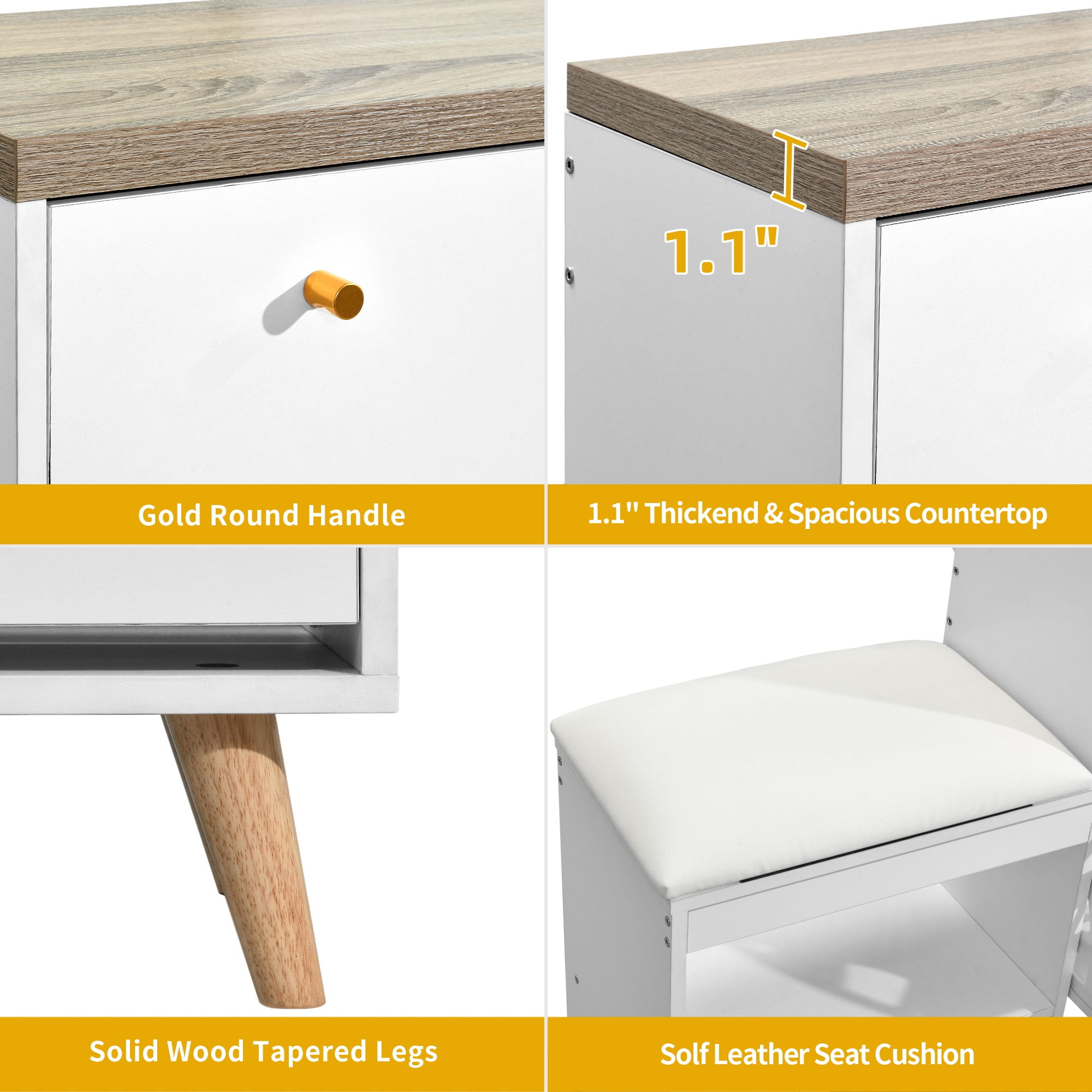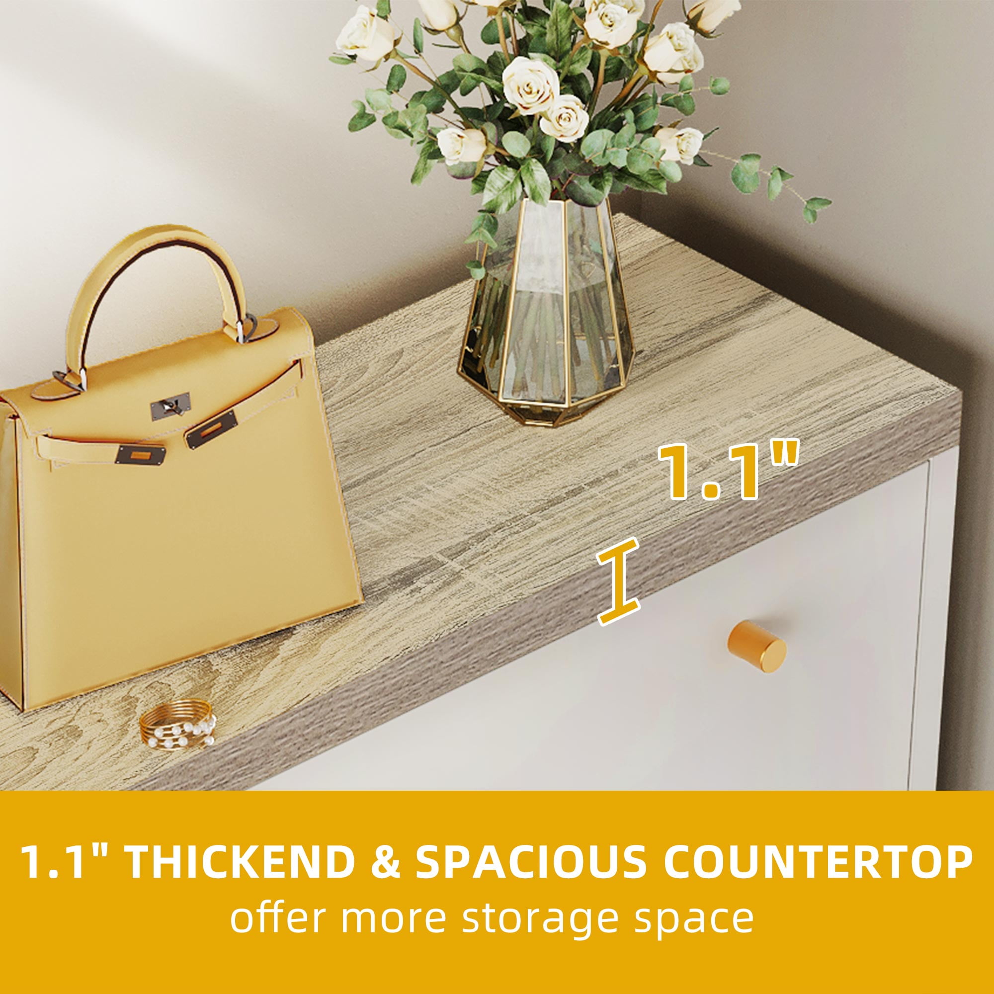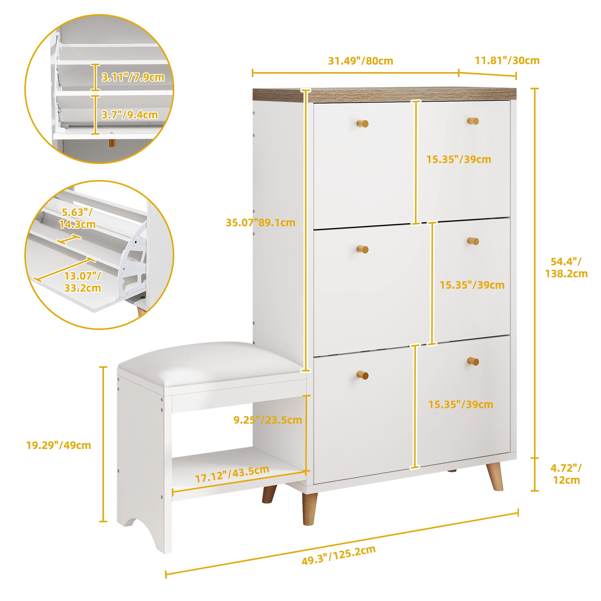 Versatile and adjustable storage: DEXTRUS cabinet features three flip drawers with 3-position adjustable and removable dividers, allowing you to customize the storage space to fit different types and sizes of shoes. It ensures that all your shoes can be neatly organized and protected from dust. Ample shoe storage capacity: This shoe storage cabinet can accommodate 29-38 pairs of shoes, providing ample space to keep your shoe collection organized and eliminating messy piles in your closets and entryways. Stylish and elegant design: With its Nordic twist, solid wood legs, golden metal handles, and top panels made of 28mm thickened green honeycomb material, this shoe cabinet adds a touch of style and sophistication to your home decor. It serves as a high-end furniture piece that uplifts the aesthetic appeal of any living space. Easy assembly and customer satisfaction: The shoe cabinet comes with easy-to-understand instructions and numbered parts, making assembly a hassle-free experience. If you have any questions or encounter any issues, our dedicated customer support team is available to assist you promptly, ensuring your satisfaction. Functional and practical features: The shoe bench with a soft leather seat cushion provides a comfortable spot for changing shoes. Additionally, the open shelves and bottom space under the bench offer convenient storage and easy access to frequently worn shoes and home shoes. The cabinet’s ventilated design and thickened top panels enhance airflow, keeping your shoes fresh and allowing for additional storage options such as bags, photos, keys, plants, or decorations.
