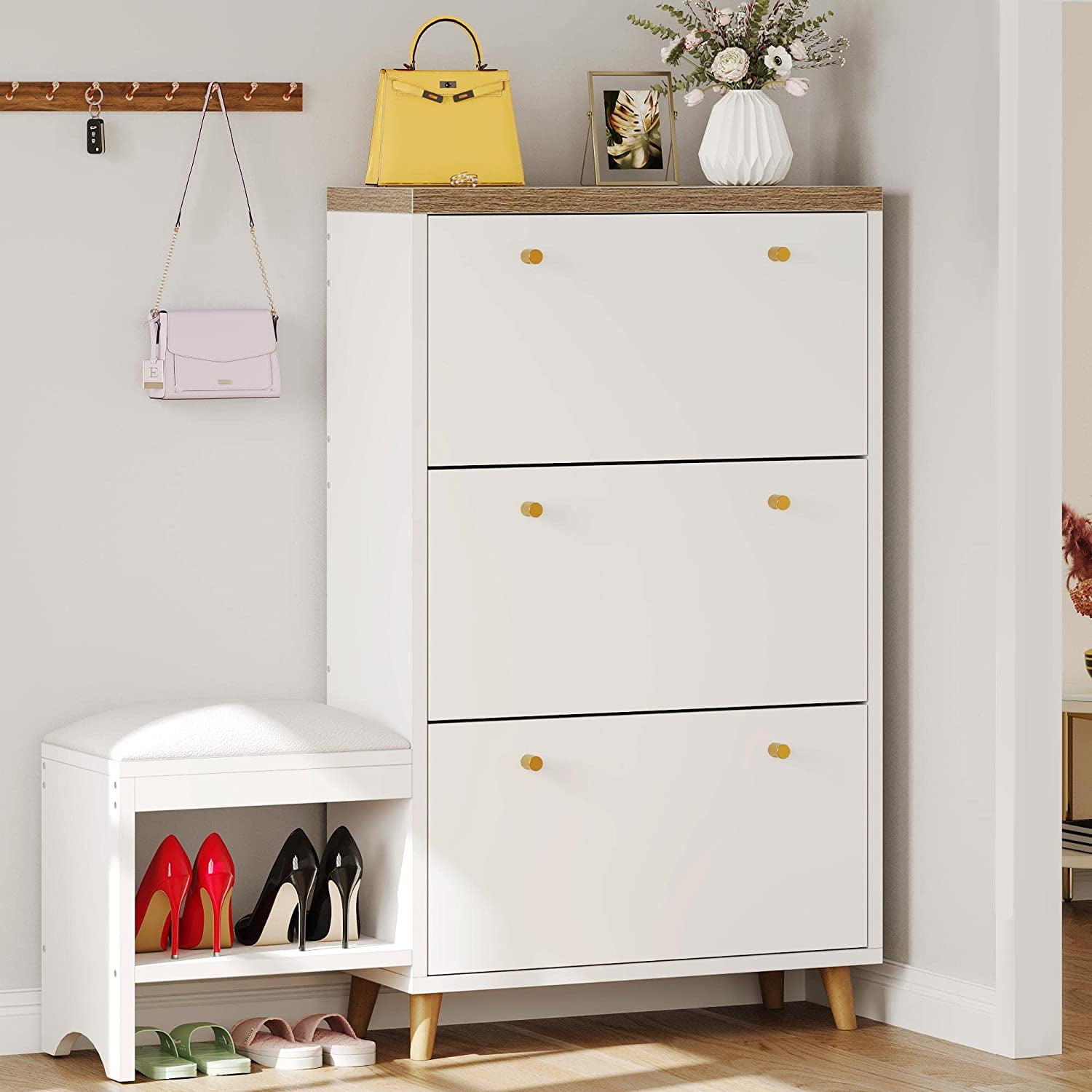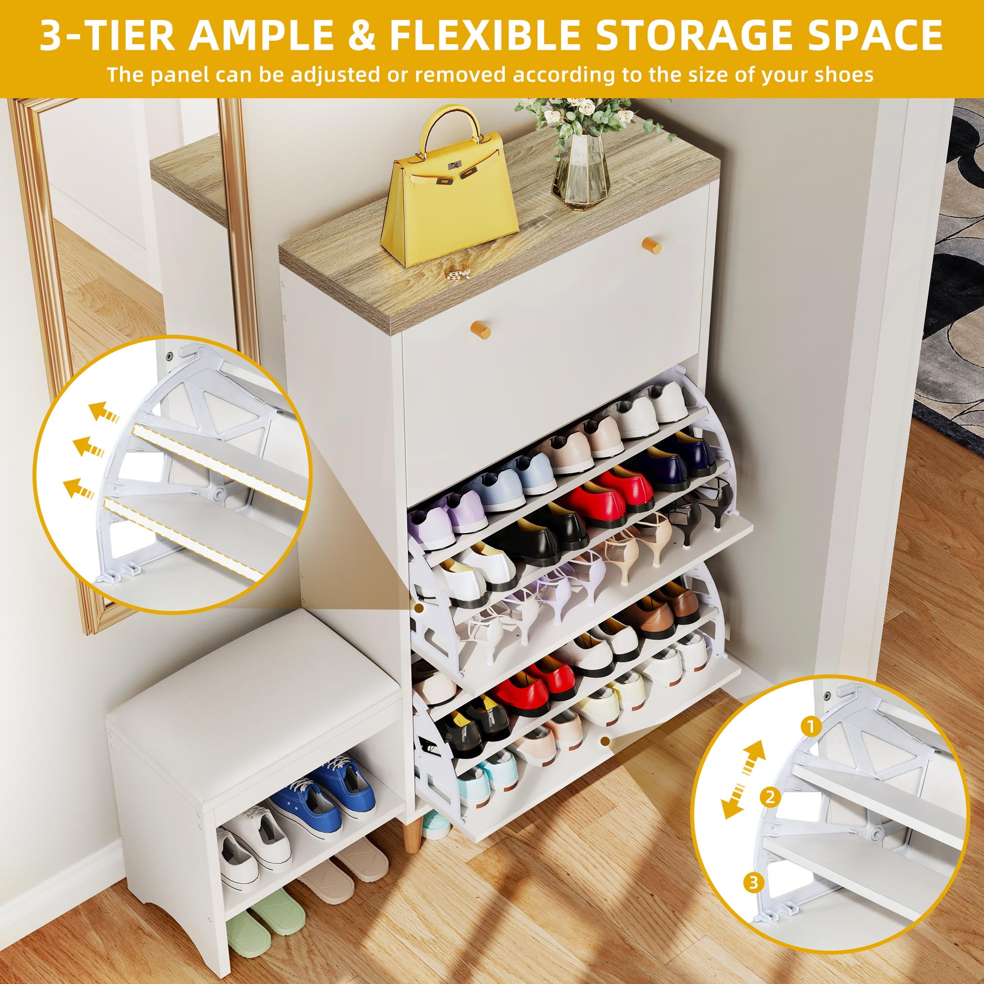 DEXTRUS white shoe cabinet provides you with enough storage space. 3 spacious flip drawers can hold up to 27 to 36 pairs of shoes to keep them organized and protected from dust. The panel in each compartment can be adjusted or removed to hold different sizes of shoes. This shoe rack suit perfectly for entryway, hallway, closet floor, cabinet, living room, bedroom, laundry room, downstairs, ect.