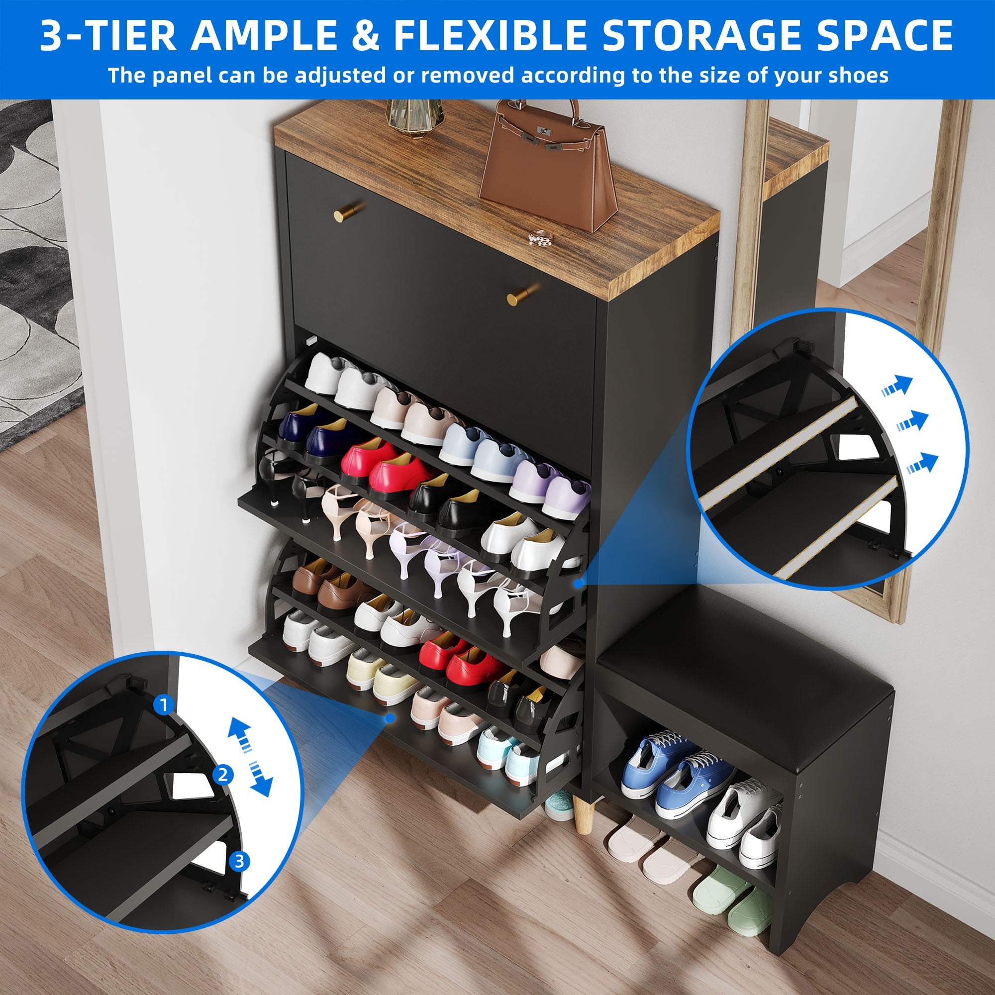 Dextrus Shoe Cabinet with 3 Flip Drawers, Freestanding Shoe Rack Storage Organizer Bench for Hallway Entryway Bedroom,Black