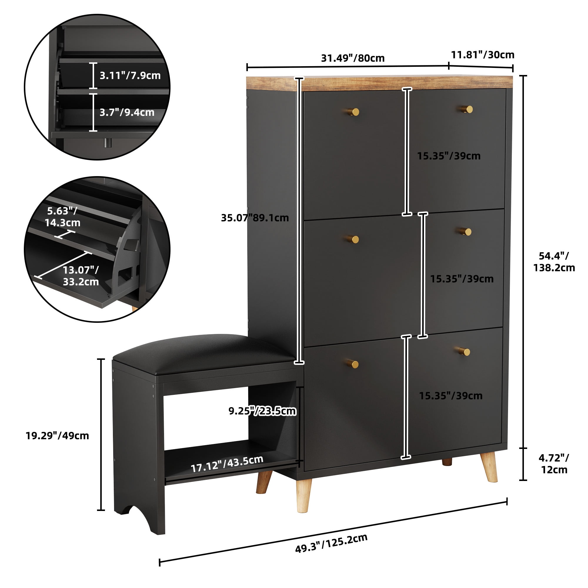Versatility and Customizable Storage: Dextrus cabinet features three flip drawers with adjustable dividers, allowing you to tailor the storage space for different shoe sizes and types. Enjoy the freedom to neatly organize your shoes while protecting them from dust. Abundant Shoe Capacity: Say goodbye to messy piles with our shoe storage cabinet that can accommodate a generous range of 29-38 pairs of shoes. Experience hassle-free organization and reclaim your closet and entryway space. Stylish and Elegant Design: Elevate your home decor with the Nordic-inspired flair of our shoe cabinet. Crafted with solid wood legs, golden metal handles, and top panels made of 28mm thickened green honeycomb material, it adds a touch of sophistication to any living space. Easy Assembly and Customer Satisfaction: Our shoe cabinet comes with user-friendly instructions and numbered parts, ensuring effortless assembly. If you have any questions or need assistance, our dedicated customer support team is ready to provide prompt assistance and ensure your satisfaction. Functional and Practical Features: Enjoy the convenience of our shoe bench with a soft leather seat cushion, offering a comfortable spot for changing shoes. The open shelves and bottom space beneath the bench provide easy access to frequently worn and home shoes. With a ventilated design and thickened top panels, your shoes stay fresh, and you have the option to store additional items like bags, photos, keys, plants, or decorations. Number of Pairs of_Shoes: 36