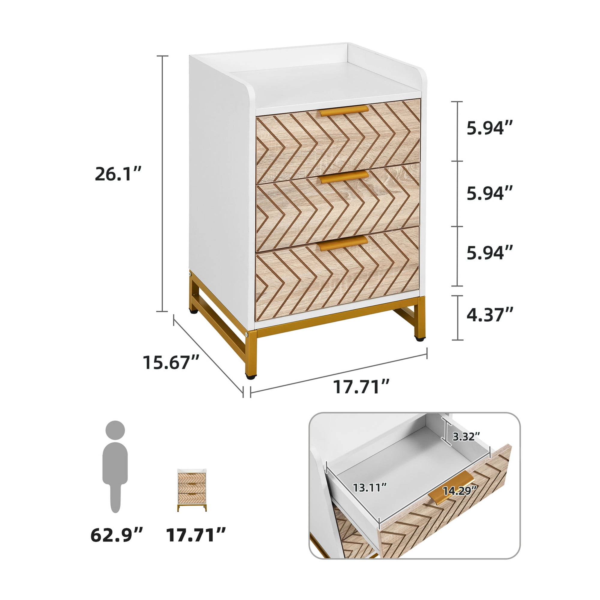 Stylish & Classic Design: This nightstand boasts a stylish white and gold color scheme with an eye-catching chevron pattern, seamlessly blending classic elegance with contemporary chic, making it a must-have for enhancing your home decor. Ample Storage Space: With 3 drawers, this bedside table offers generous hidden storage for your personal items and daily essentials, helping you keep your space organized and clutter-free while ensuring everything you need is easily accessible. Sturdy and Durable Construction: Crafted from premium particleboard and supported by a robust metal base, this 3-drawer nightstand guarantees durability and stability. Adjustable foot pads not only maintain balance but also safeguard your floor from scratches. Functional & Convenient Features: The drawers are equipped with metal slide rails for smooth opening and closing, ensuring convenience in accessing your belongings. A humanized protective raised edge prevents items from accidentally falling off. This nightstand is designed to fit well in small spaces without occupying too much room. Age_group: Adult. Easy Installation: Each component is labeled with a letter or number, and the provided instructions clearly indicate where each piece should go. If you encounter any issues during assembly, please don’t hesitate to contact us. We are committed to promptly resolving any problems to your satisfaction.