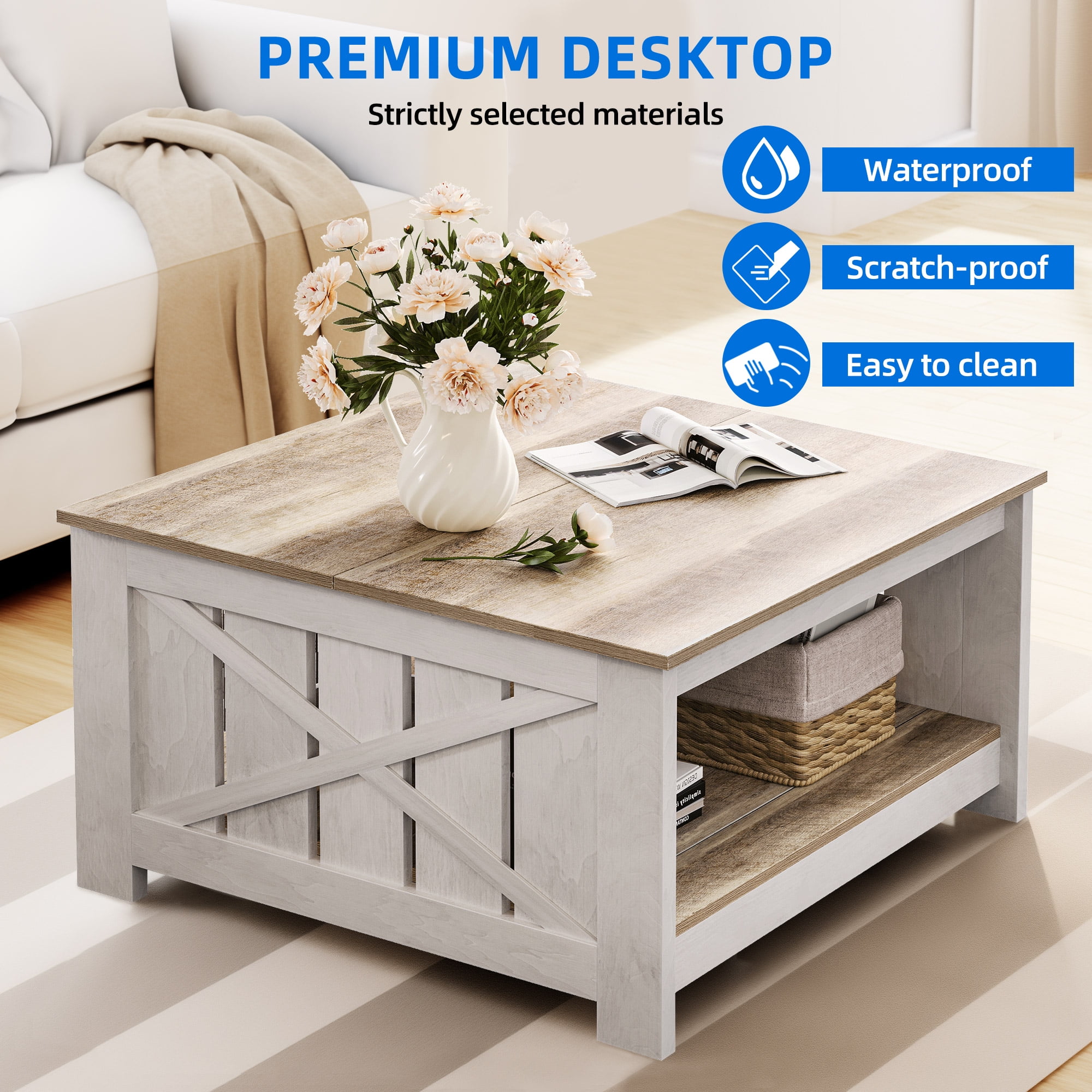 【Modern & Farm Style】- Combining natural grey wash with white, this coffee table adds a unique rustic aesthetic to your room, complementing both modern and rustic decor styles. 【Sturdy & Practical Construction】- Made of durable particle boards, this coffee table can hold up to 180 lbs. The “X” design frame adds sturdiness and farmhouse flair, while adjustable feet protect your floors. 【Double Layers Design】- With its spacious 2-tier design, this coffee table provides ample storage space and can also serve as a workstation, study table, or dining table. The semi-open design allows easy access from both sides. 【Scratch-Proof and Easy to Clean】- The waterproof and scratch-proof wood top of this coffee table is more durable than regular rectangular tables. Simply wipe it with a dry cloth for easy cleaning, reducing your household chores. 【Easy to Assemble】- The Dextrus Coffee Table comes with a detailed manual and all necessary accessories for quick and easy assembly.