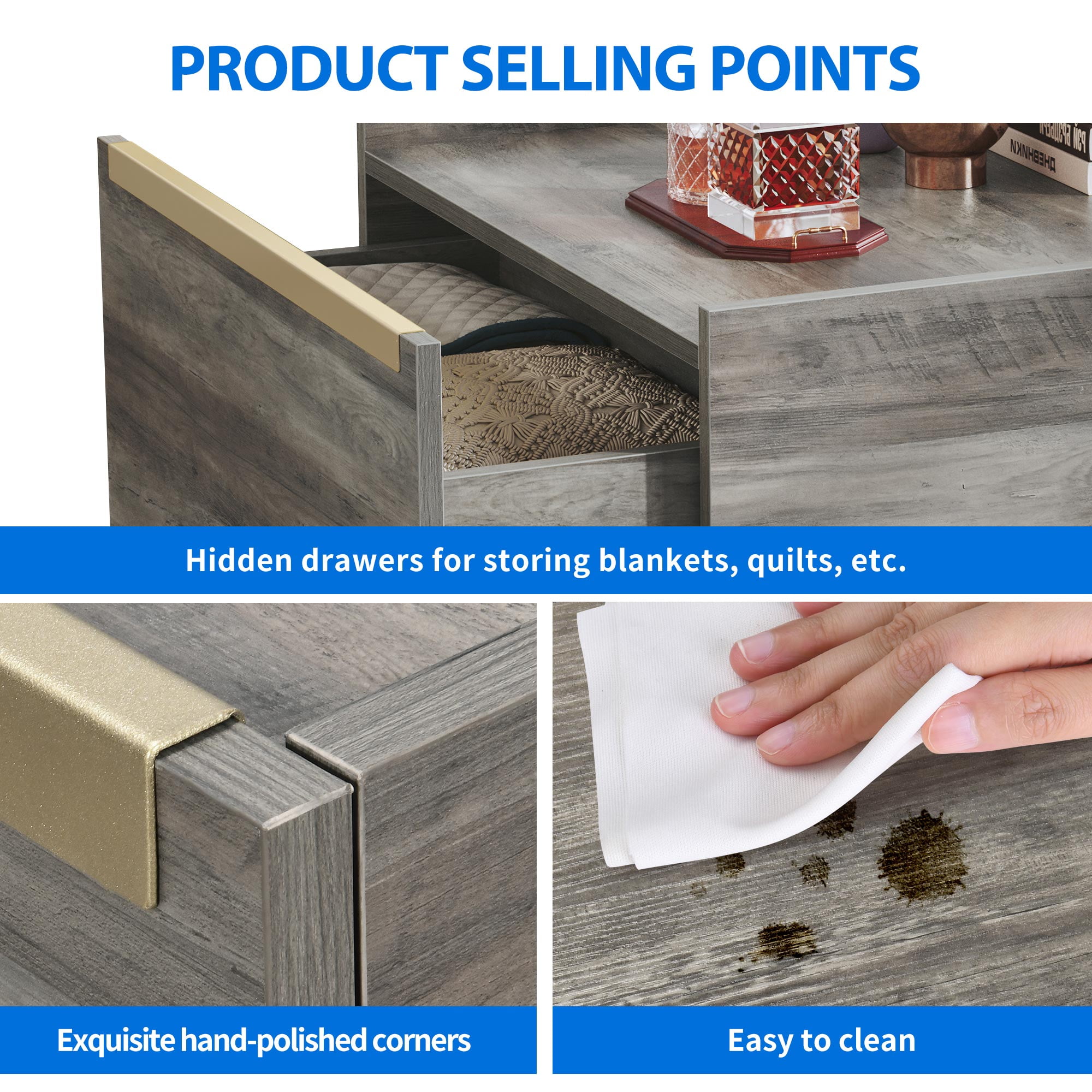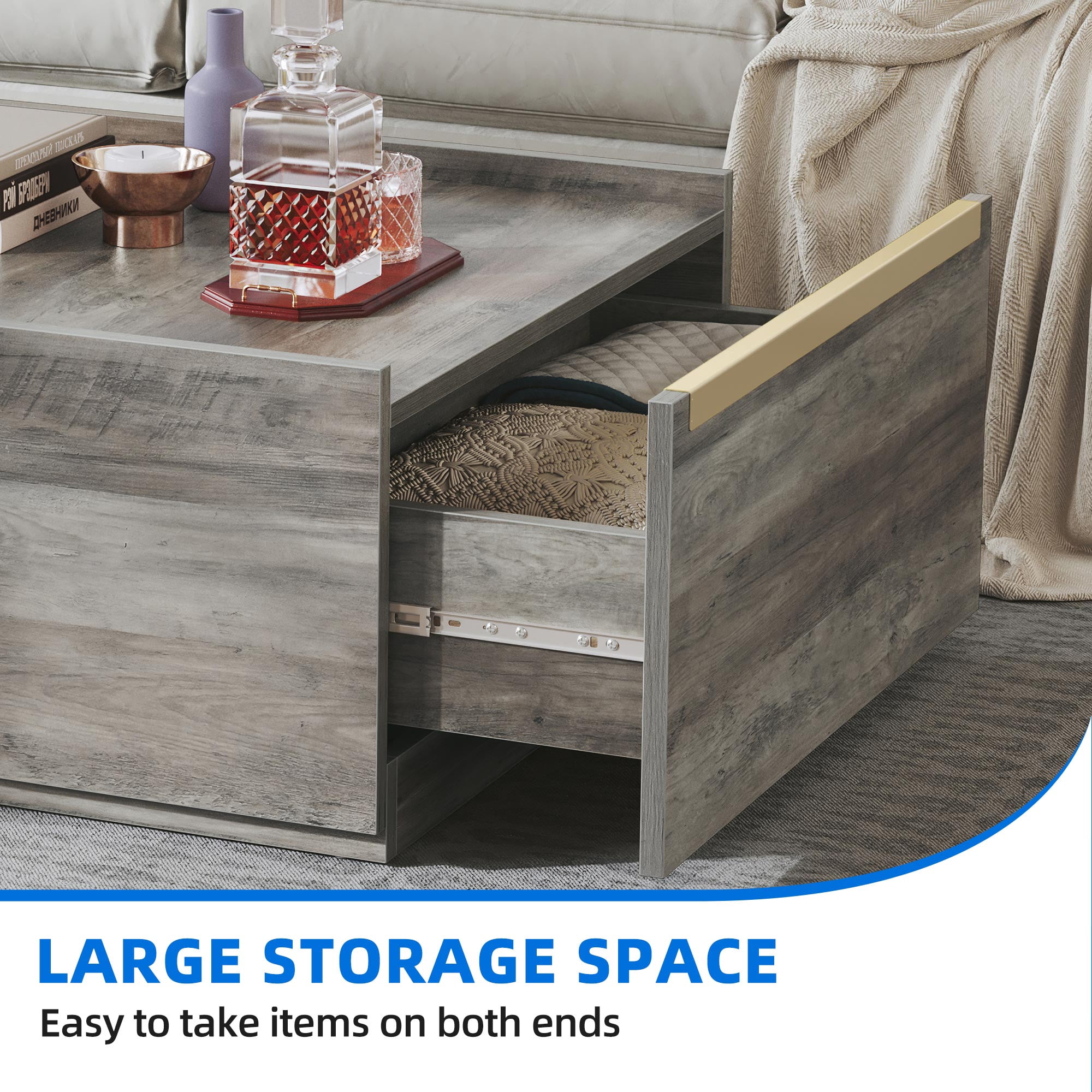 The new Dextrus coffee table is suitable for both farmhouse and contemporary home decor. The design with two drawers allows you to easily store and access blankets, clothes or quilts to take care of your health at any time. The subtle concave design can hold everyday items without falling out. Wooden base increase the height of the drawer base, reduce the friction between the drawer and the ground, increase the stability and prolong the service life. The drawer light rail design is easy to install and reduces noise when sliding, creating a comfortable and peaceful atmosphere. Can hold items up to 180 lbs. The farmhouse coffee tables are inspected and accepted repeatedly before shipment. If there are any parts damaged or missing, please find us and we will solve it as soon as possible.