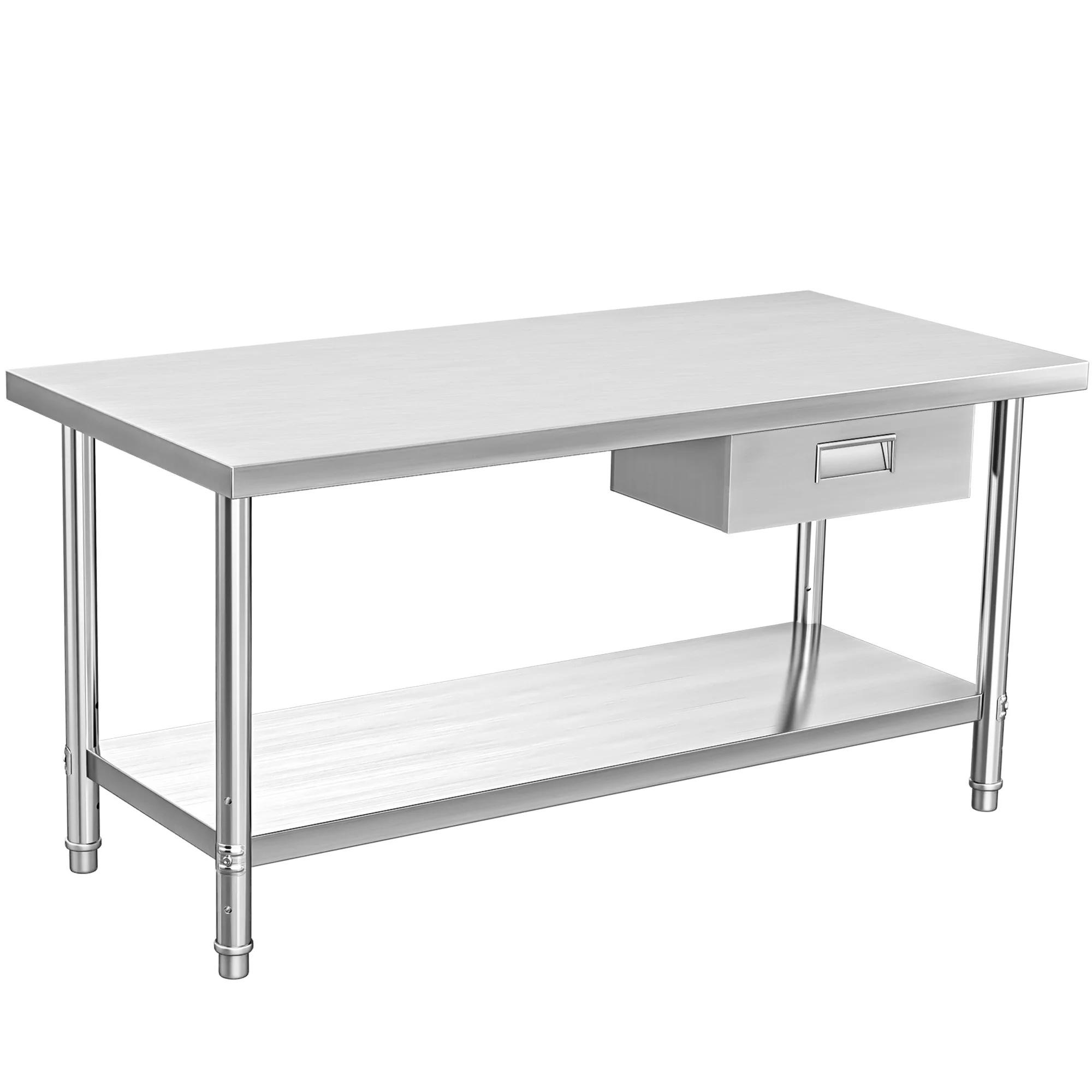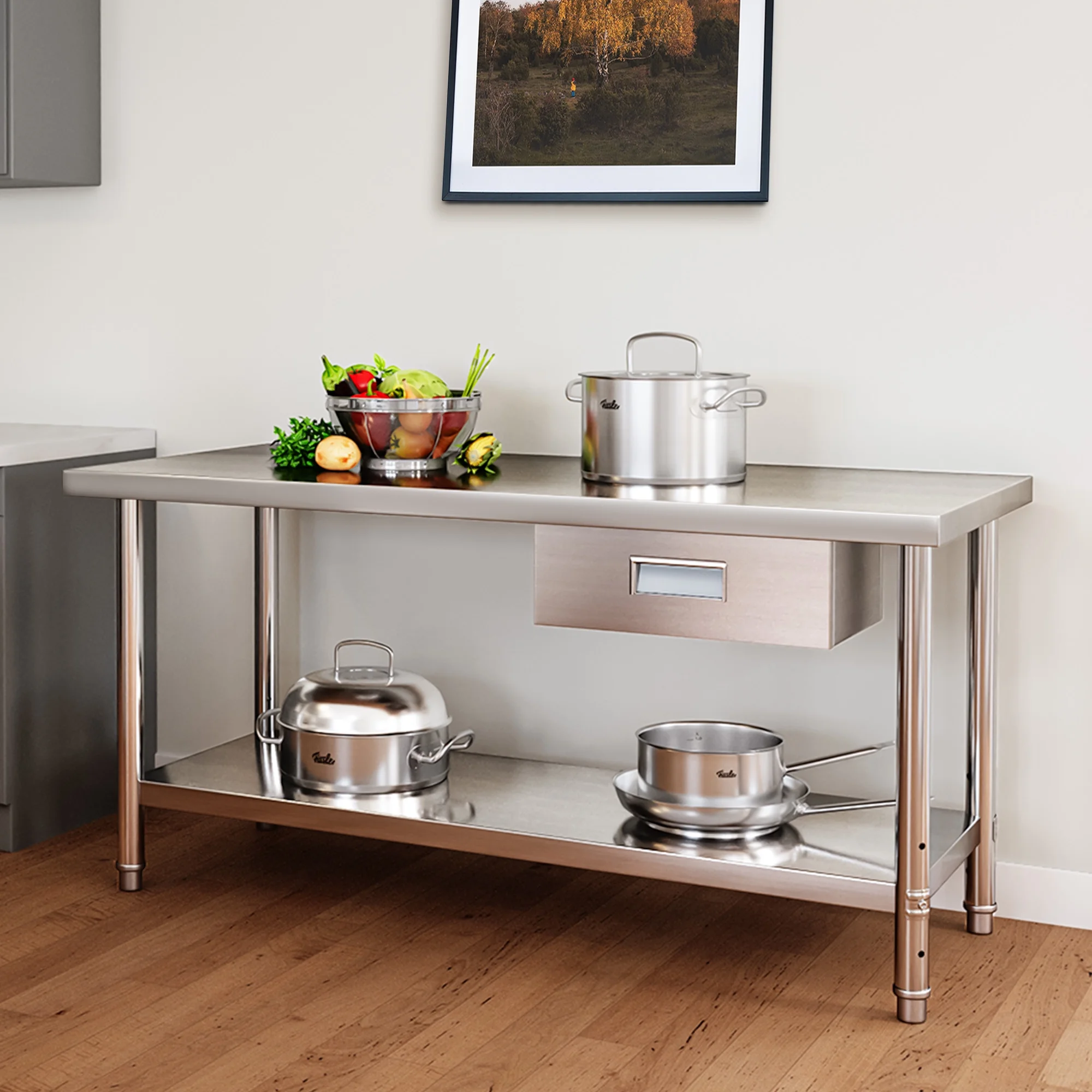 VERSATILITY: DEXTRUS stainless steel workbench is suitable for kitchen, garage, workshop, bar, restaurant, laundry room, school, hospital, warehouse and other places that accomodate for workbench, dinner table, laundry table SILENT DRAWERS: DEXTRUS stainless steel workbench drawers can better organize your belongings; Drawers can be opened and closed smoothly without making a sound STABLE: 2-layer stainless steel workbench can meet your use and storage needs at the same time, it is a storage place for your microwave oven, meat grinder and other appliances HIGH LOAD-BEARING: DEXTRUS 201 stainless steel table is corrosion-resistant, rust-proof, easy to clean, and has long service life; 0.6MM thickened stainless steel plate with thickened tubes and high-quality accessories provide a total of 840LBS load-bearing EASY INSTALLION: DEXTRUS stainless steel table comes with the exact number of accessories and detailed installation instructions, including tools and gloves, so you can easily complete the installation of the table