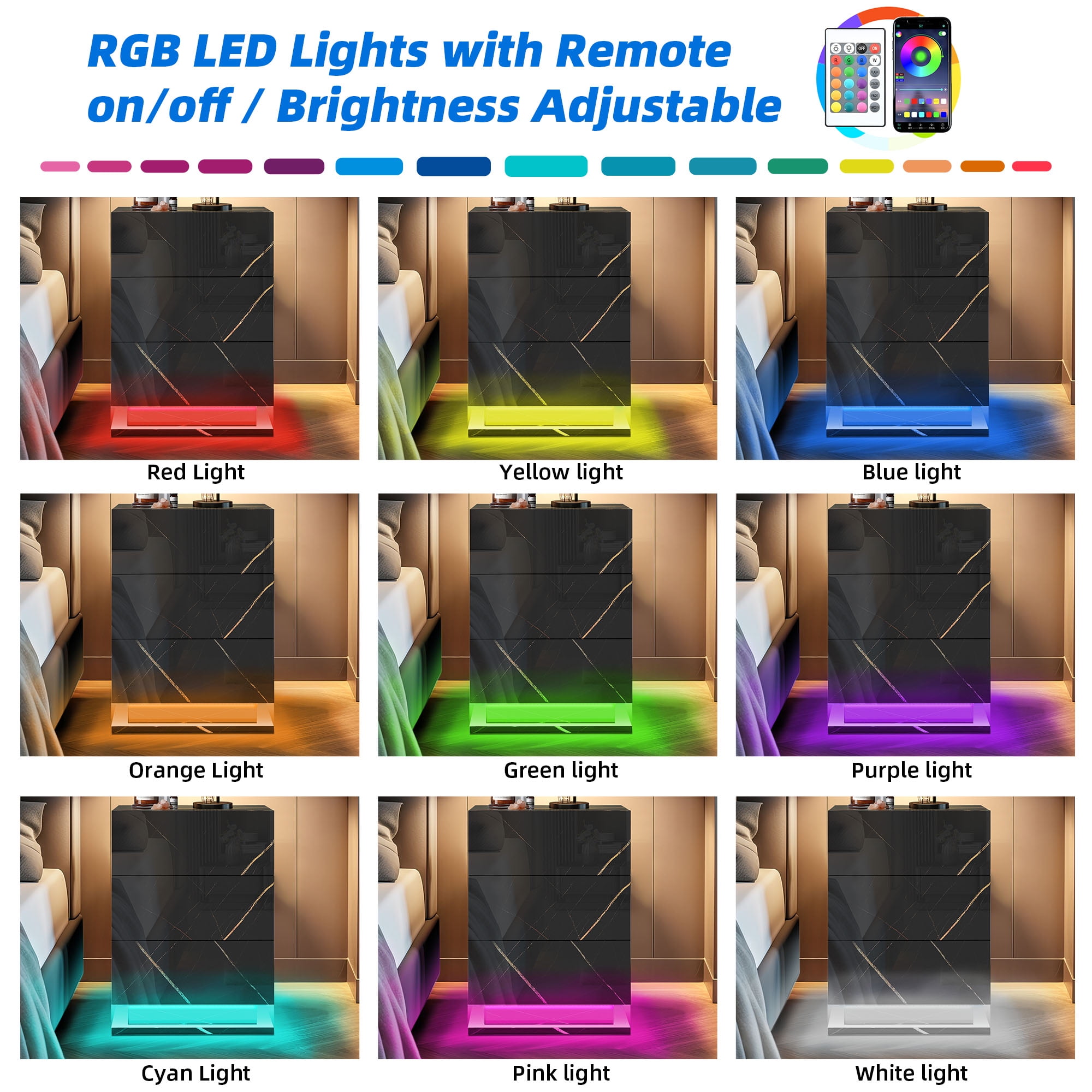 【Adjustable RGB Lighting】 Equipped with an adjustable LED lighting system, offers over 6000,000 RGB LED colors, 29 dynamic style modes, music mode, brightness adjustment, and timer function. You can customize the desired effect through the app and remote control, allowing you to create the perfect atmosphere for any occasion. (Compatible with Android and Iphone system) 【Spacious Drawer with Smooth Sliding】Featuring a spacious table top and 3 smoothly sliding drawers, this piece easily accommodates your cosmetics, books, and electronic devices. It not only provides generous hidden storage space, but also aids in organizing various items with ease. 【Premium Material】 Made from top-notch 15mm MDP (Medium Density Particleboard) with PVC edge banding, this product not only exudes a distinctive aesthetic, but also boasts enhanced durability. 【High Gloss Reflective Design】Features with a streamlined design and the top panel and all side panels of the nightstand are coated with a UV high gloss reflective finish, exudes a stylish and modern ambiance in your room. Additionally, the LED light at the bottom of nightstand will not harsh your eyes, illuminate soft lighting for relaxing sleep. 【Easy Installation】 No need to be an assembly expert. Our nightstand comes with clear instructions, all necessary parts and hardware are conveniently labeled, simplifying the process for you.