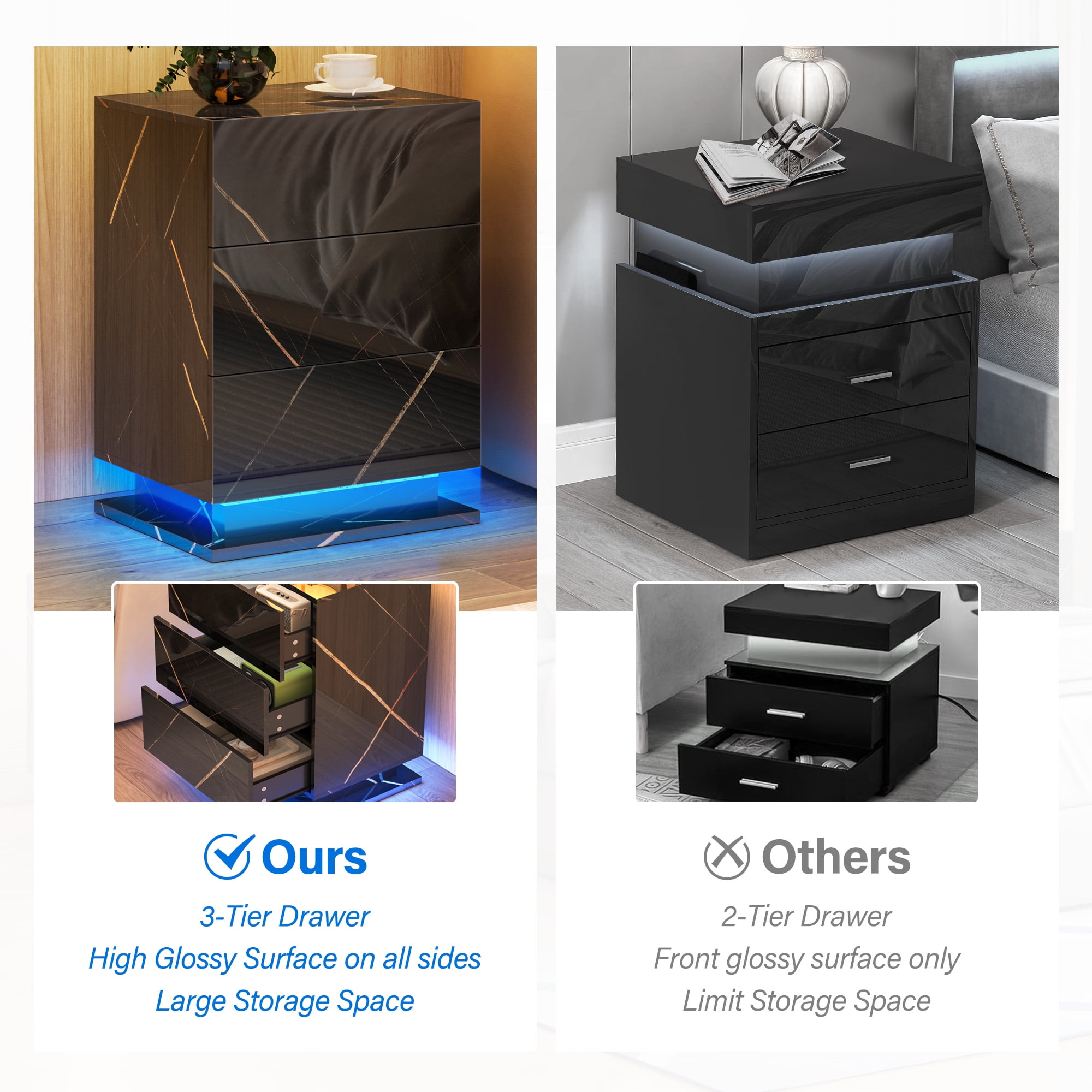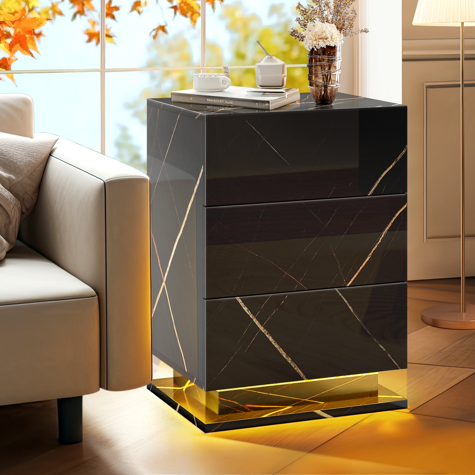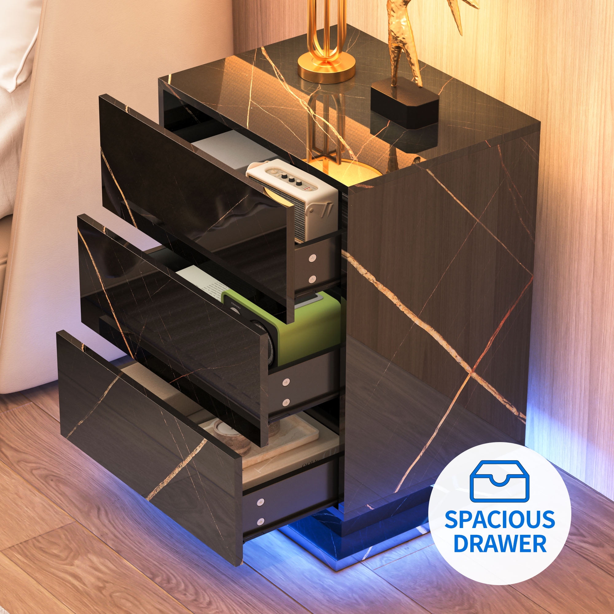 Dextrus Tall LED Nightstand with 3 Drawers, High Gloss Bedside Tables for Bedroom, Marble Black
