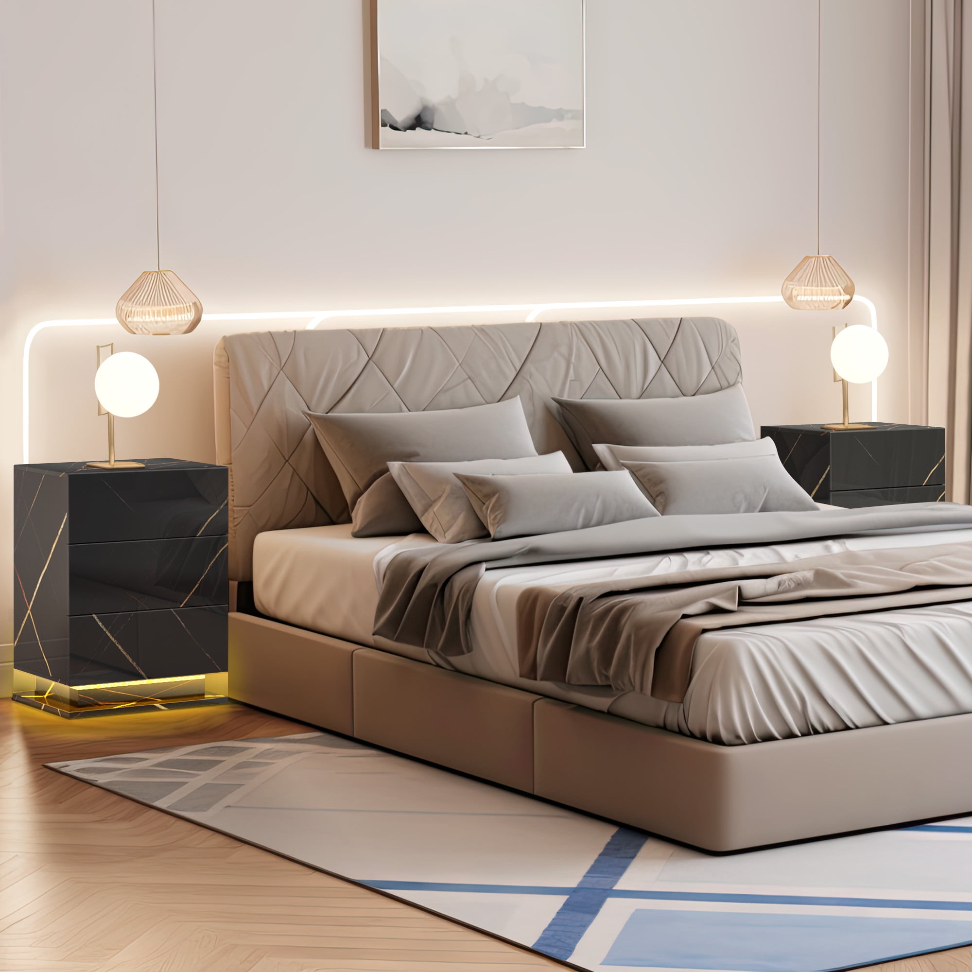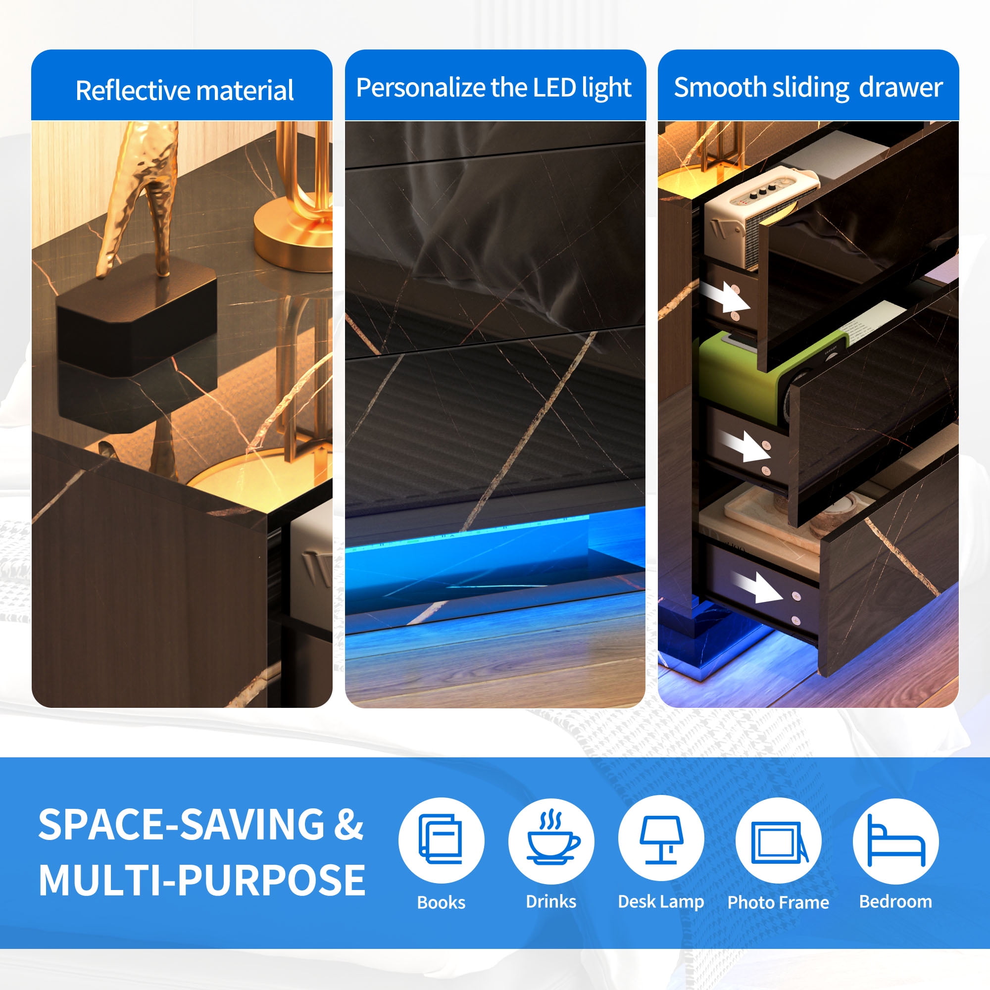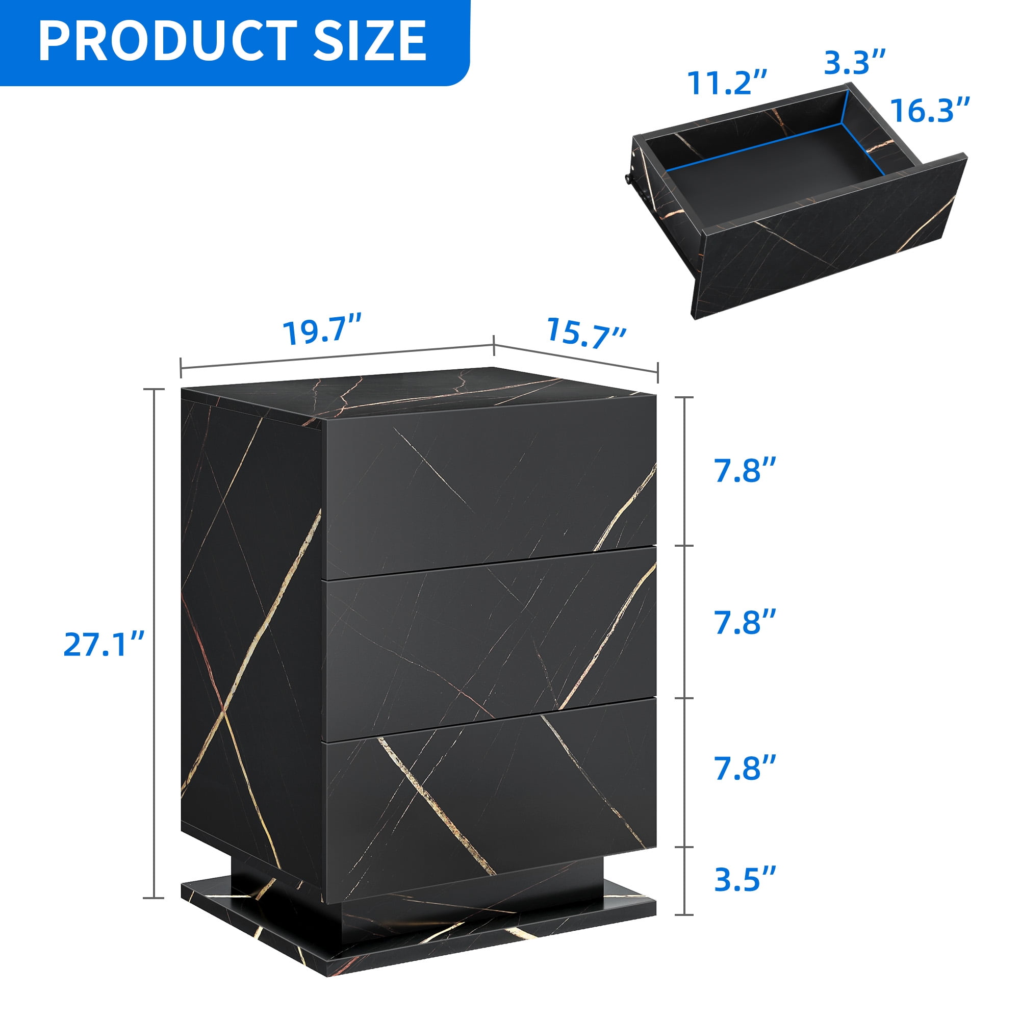 Dextrus Tall LED Nightstand with 3 Drawers, High Gloss Bedside Tables for Bedroom, Marble Black