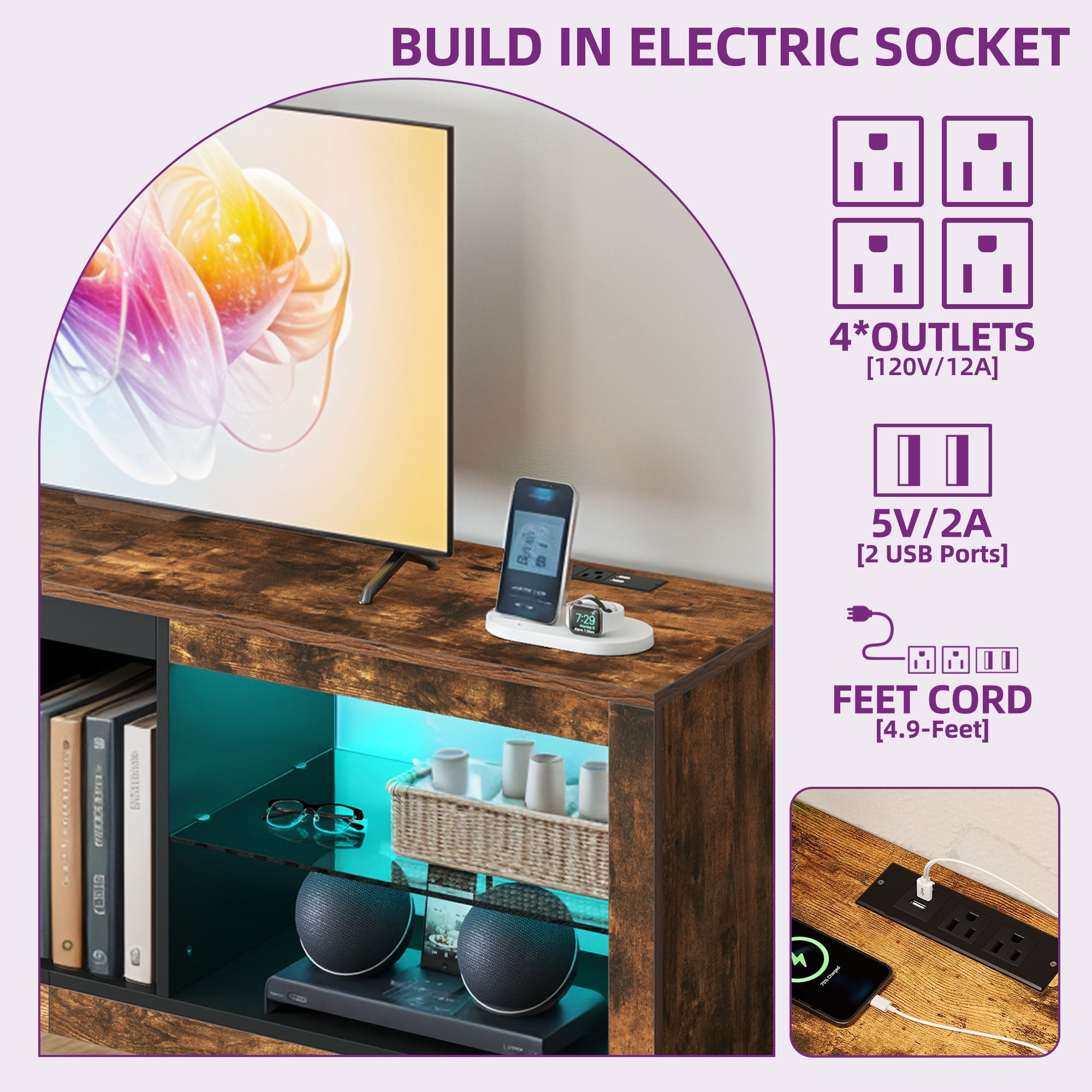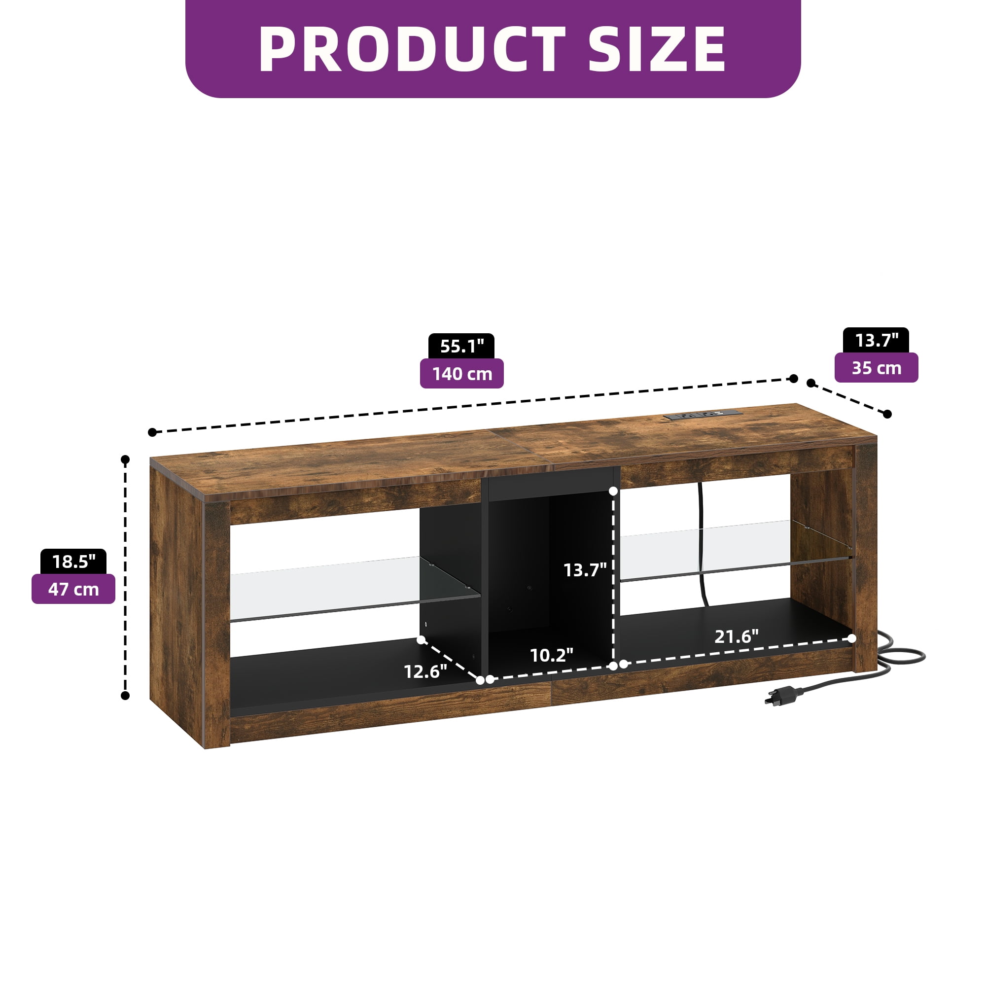 This brown entertainment center fits up to 62″ TV with total weight capacity 100 lbs. Made of CARB certified P2 particle board, it offers you great stability and durability. 5 compartments is enough to store many stuff.The middle shelf is specially designed for gaming device, like PS 4. Back hole for better wire management and tidiness.Our pre-installed RGB strip light comes with user-friendly remote. you could easily pick up your favorite vibe among 7 main colors and 20 display modes.Use of tempered glass that will not burst, and when you turn on the LED light, the light will also shine through the glass to create a better atmosphere.The included anti-tip kit is designed to provide great protection for the TV cabinet and also ensure the safety of small children and the elderly.