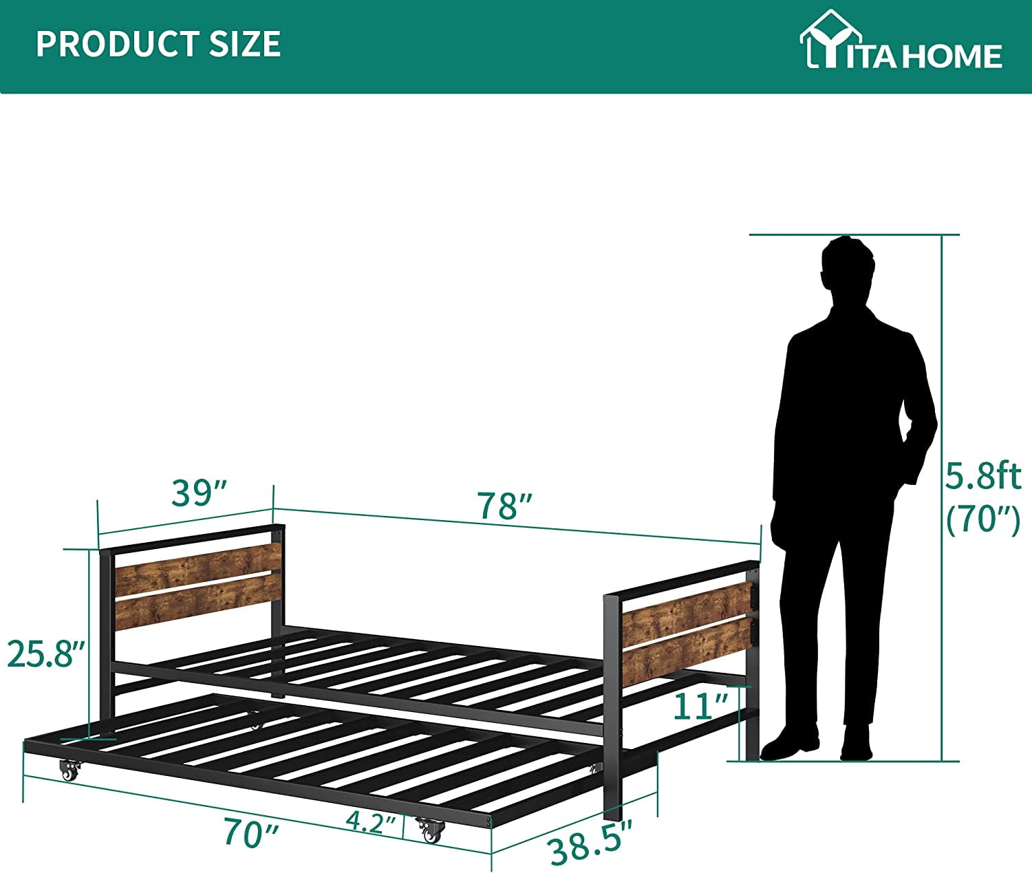 DURABLE AND STABLE- Our Dextrus’s durable and distinct iron frame adds a unique decoration to your sofa bed; The extra load-bearing support tube in the back and the wooden panel combine to offer additional stability and comfort. ADJUSTABLE HEIGHT AND 360° WHEELS- 360°swirling wheels ensure smooth flexibility and allow for easy movement; Adjustable height can meet your various needs. This is a ideal sofa bed for living room and children’s bed. VERSATILE USE- This twin daybed boasts dazzling details and modern aesthetics to fit in every home; it meets your various needs: can be used as a bed for sound nighttime sleep or as a sofa for your living room. ADDITIONAL STORAGE SPACE- Enjoy ample storage space under bed so you can always have somewhere to put your clothes, toys and quilts. A humanized function to make your room organized. EASY ASSEMBLY- The bed frame can be easily assembled within a short time period as all detailed instructions and parts are included; Two people are highly recommended for assembly. Please follow the instructions, and professional installation recommended.