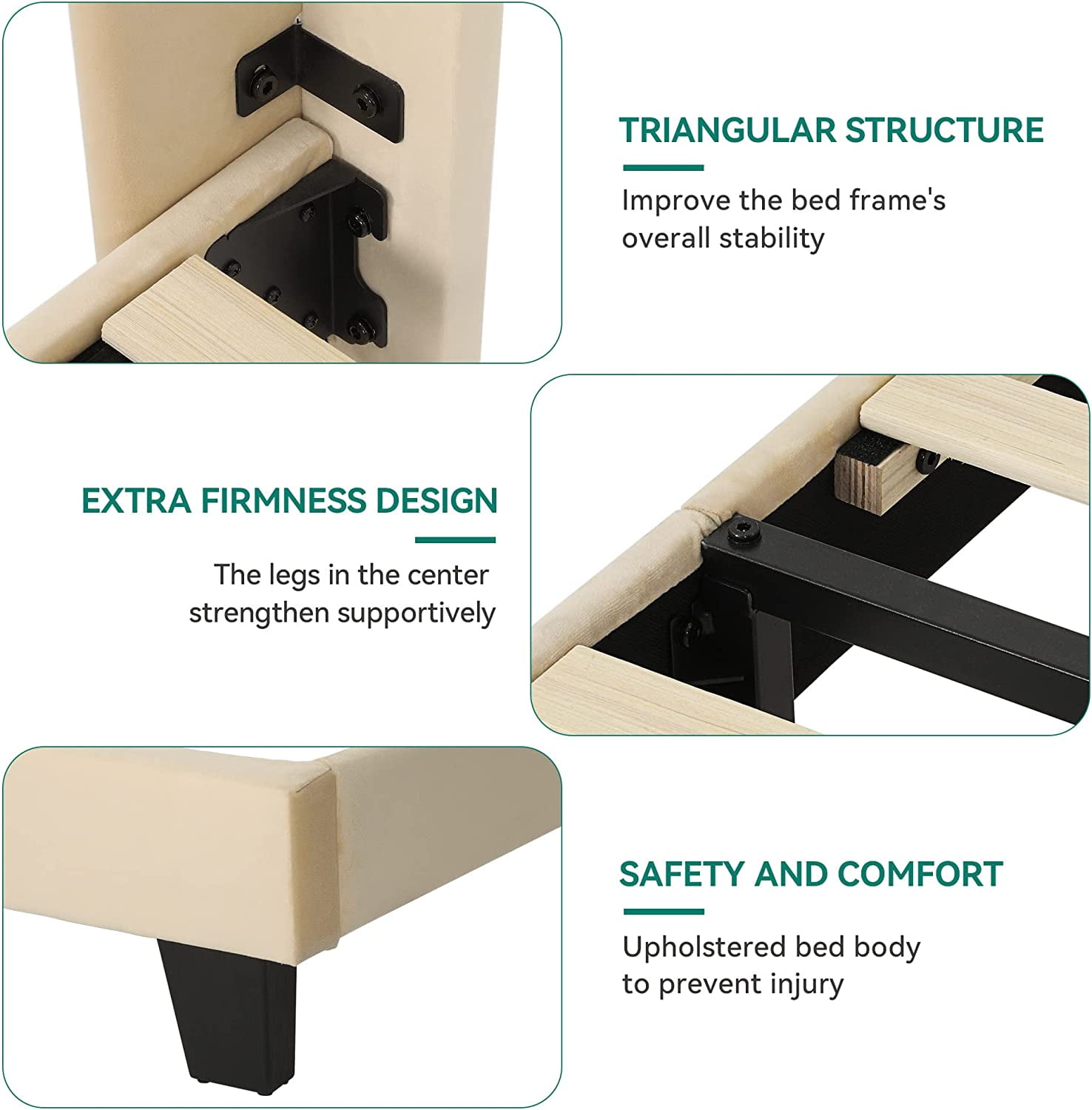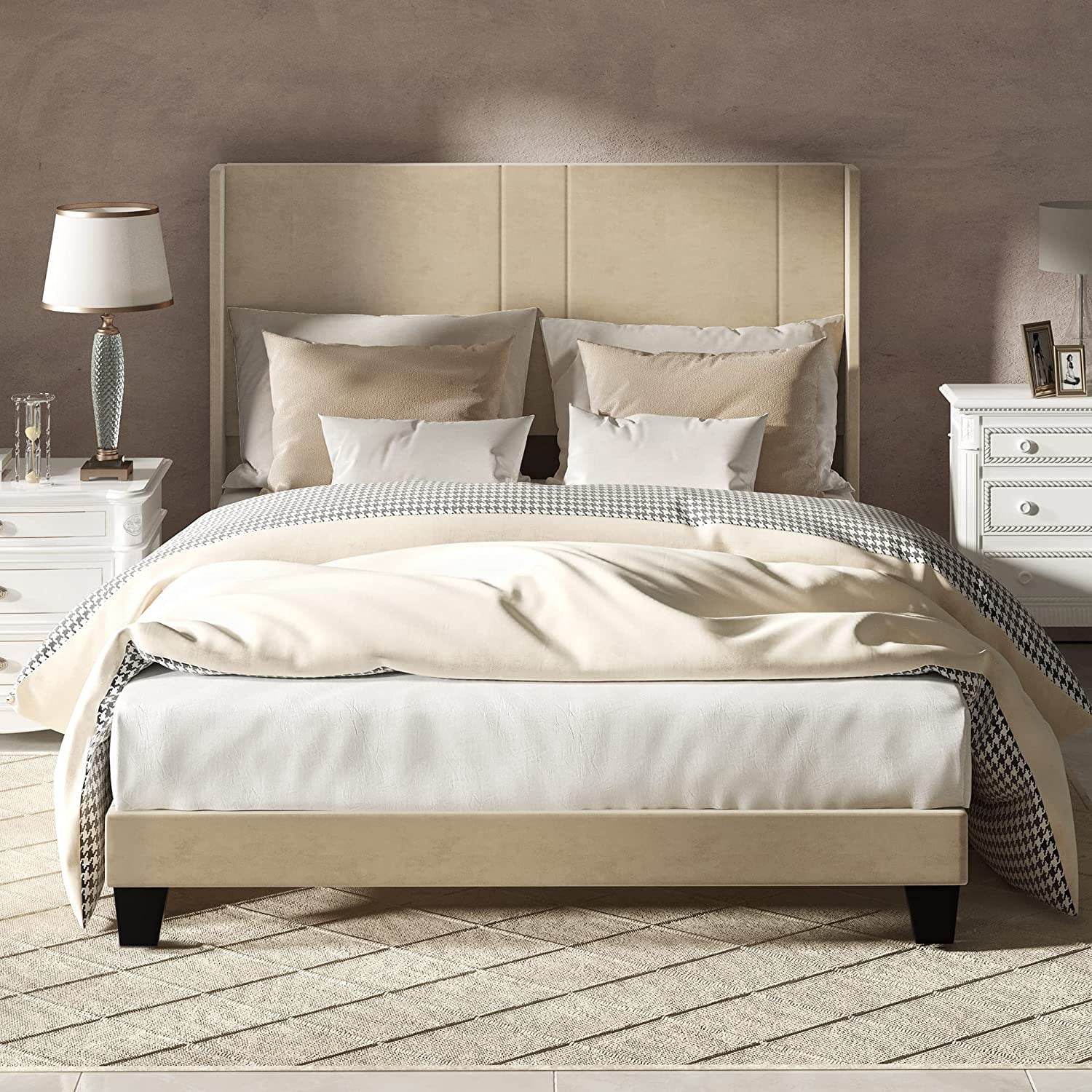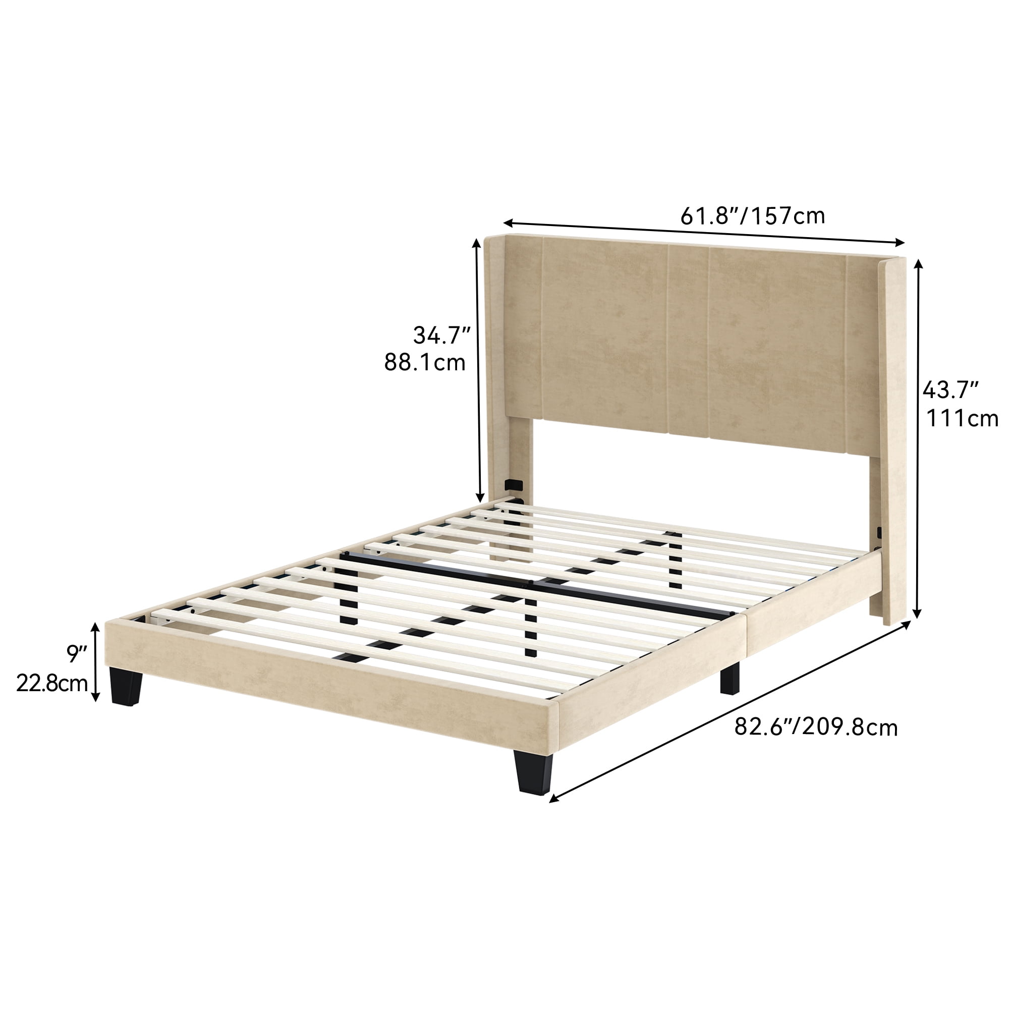 STURDY CONSTRUCTION- A thick & sturdy metal frame constructed from premium iron, and the well-selected wood keeps the mattress stable. Enjoy a bed frame with a longer lifespan. VELVET HEADBOARD- Features a suede surface with rectangular tufting for a classy look; The wingback design ergonomically fits the human curve with no box spring needed; Enjoy premium comfort and relaxation. HIGH PERFORMANCE- Middle bed legs are upgraded with anti-scratch foot pads to prevent damage to the floor or mats. Stickers on slats help to reduce noise; Create a noiseless environment for comfortable sleep. ELEGANT DESIGN- The upholstered platform bed has a minimalist headboard style that looks elegant in your bedroom; Beige color easily integrates into any room and suits various decorations. EASY ASSEMBLY- To avoid missing packages, product is packed in one carton for easy delivery; It may take you 30 mins to finish the entire assembly by following the user manual. Please follow the instructions, and professional installation recommended.