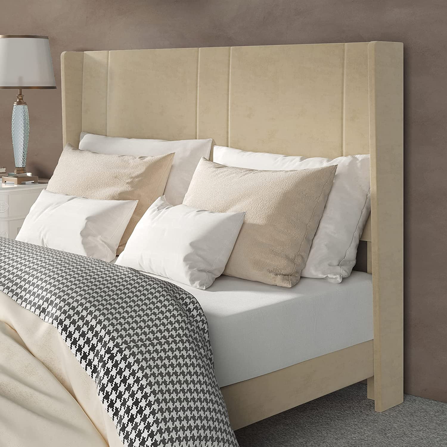 Dextrus Upholstered Bed Frame with Velvet Headboard and Wingback,No Box Spring Needed, Beige