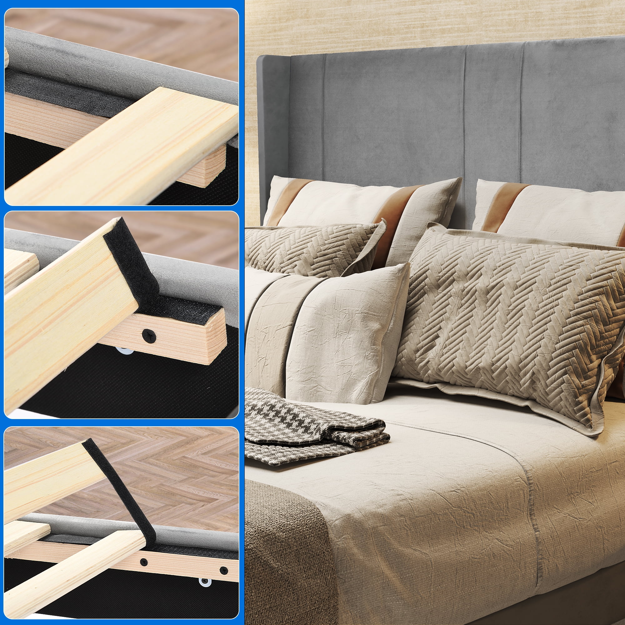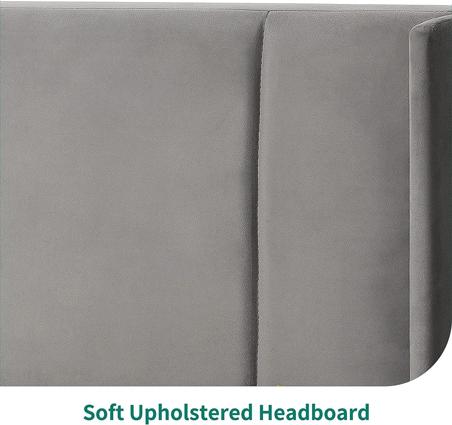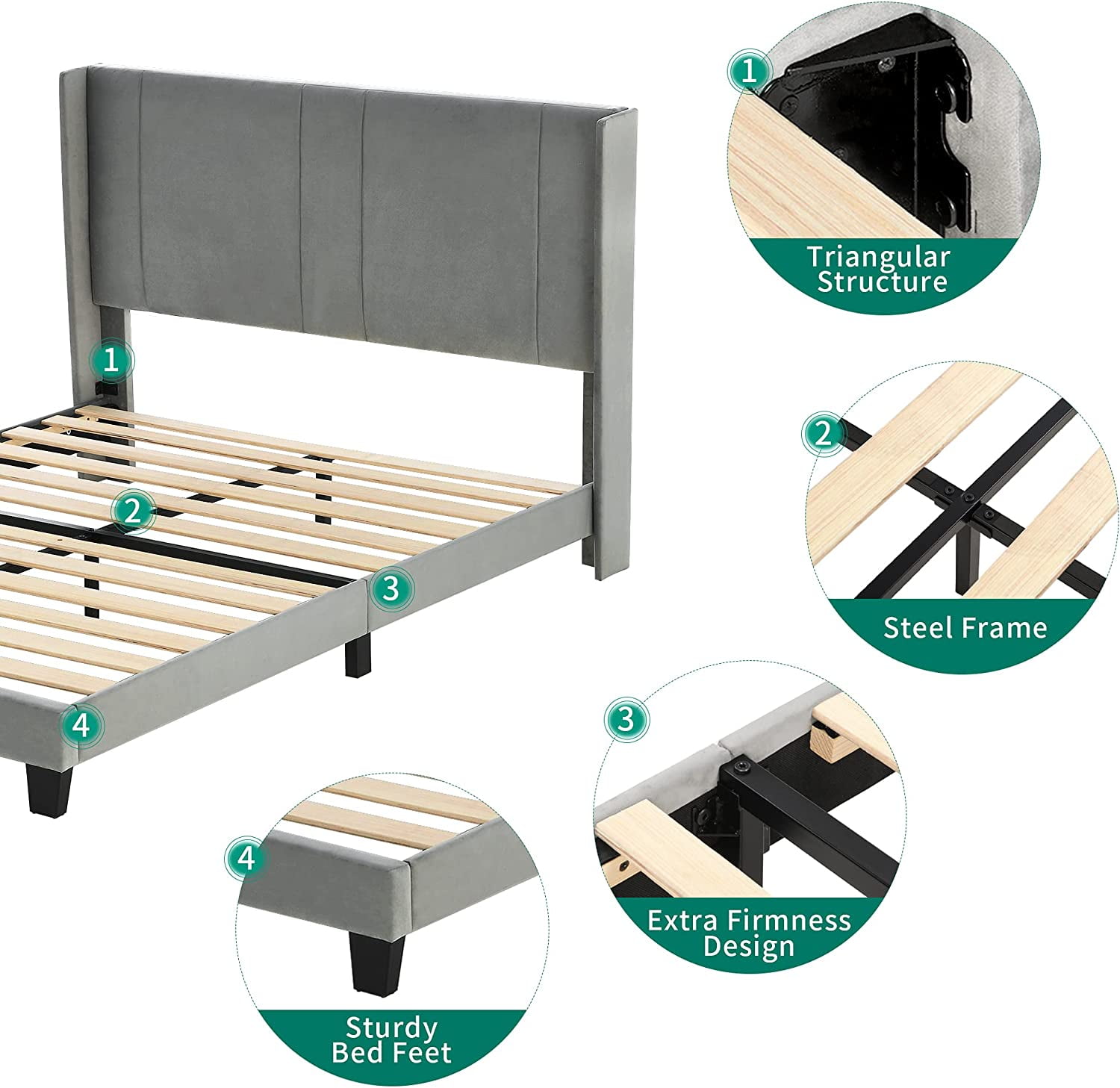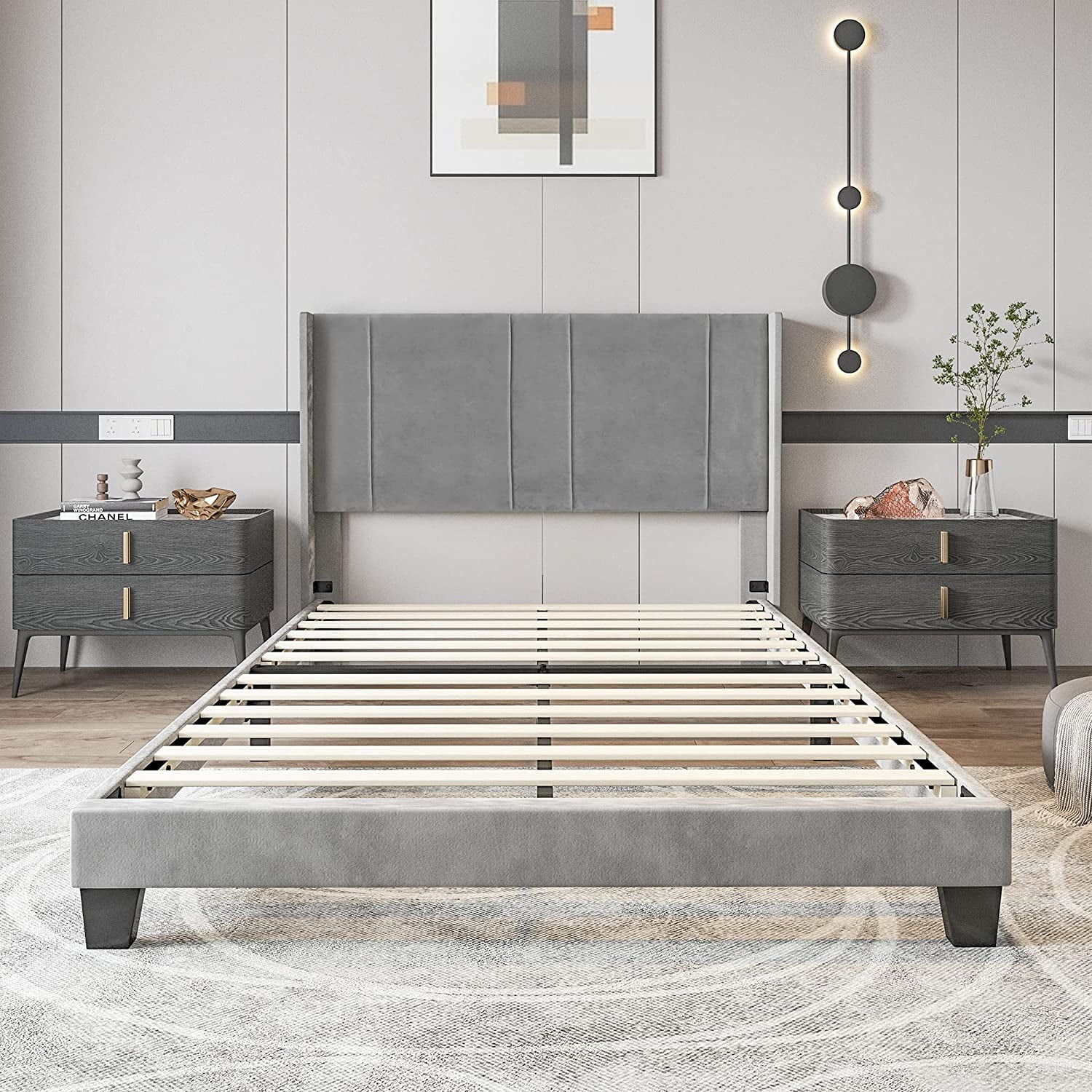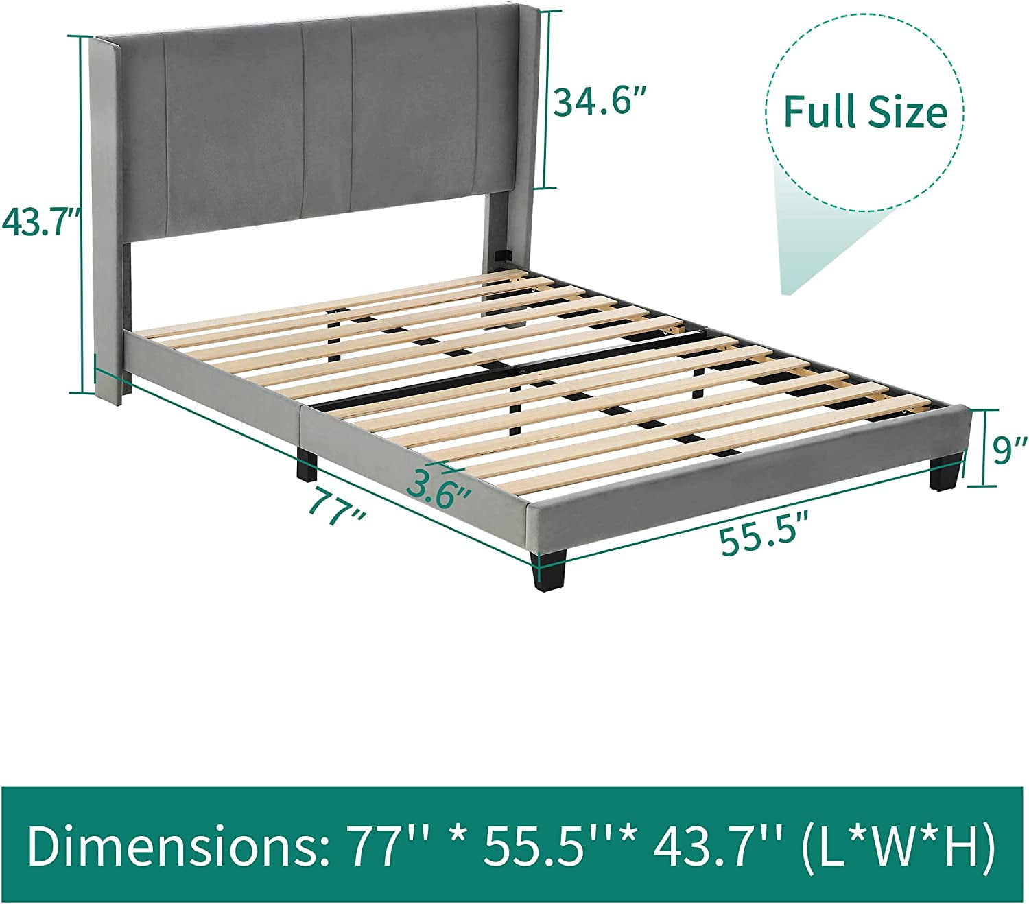 Dextrus Upholstered Wingback Platform Bed with Gray Velvet Headboard,No Box Spring Needed, Full