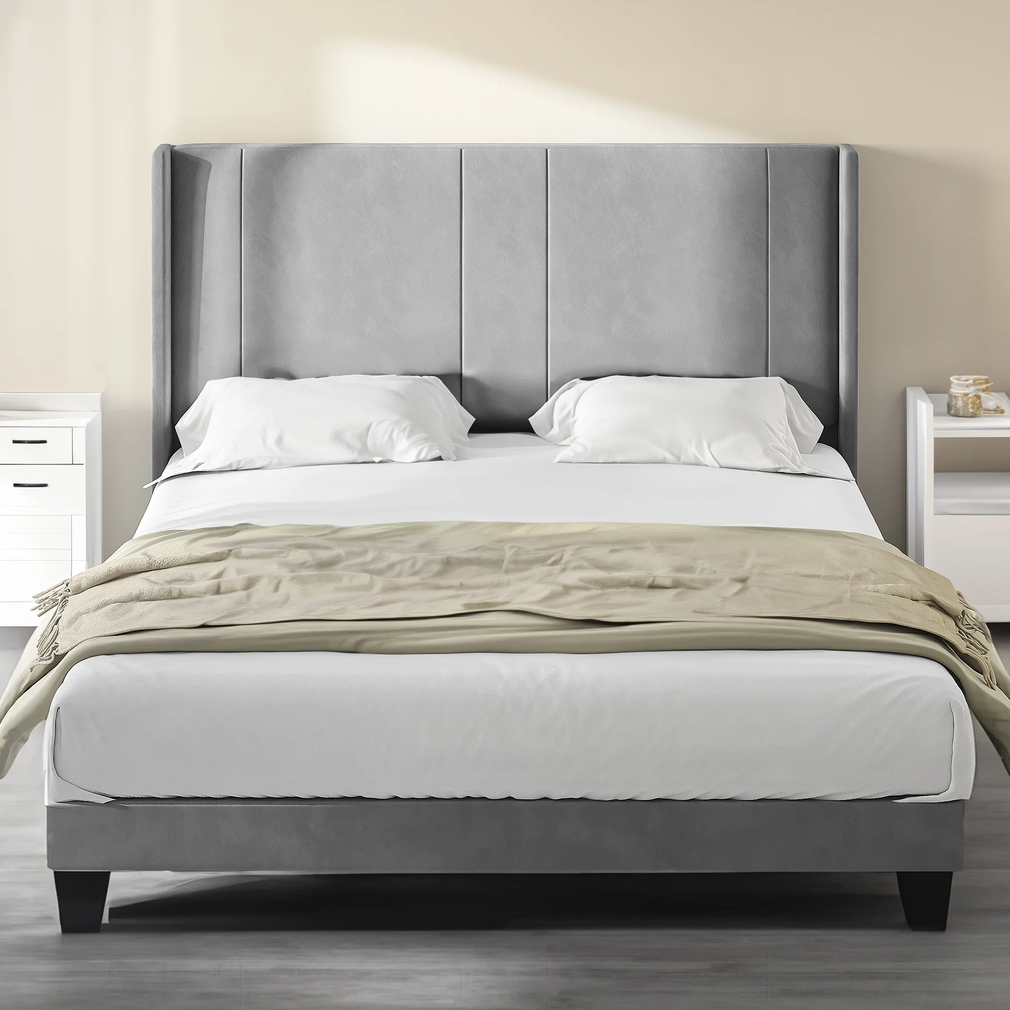 YITAHOME Upholstered Wingback Platform Bed with Gray Velvet Headboard, Bed Frame with Wood Slat, No Box Spring Needed, Mattress Foundation (Queen)
