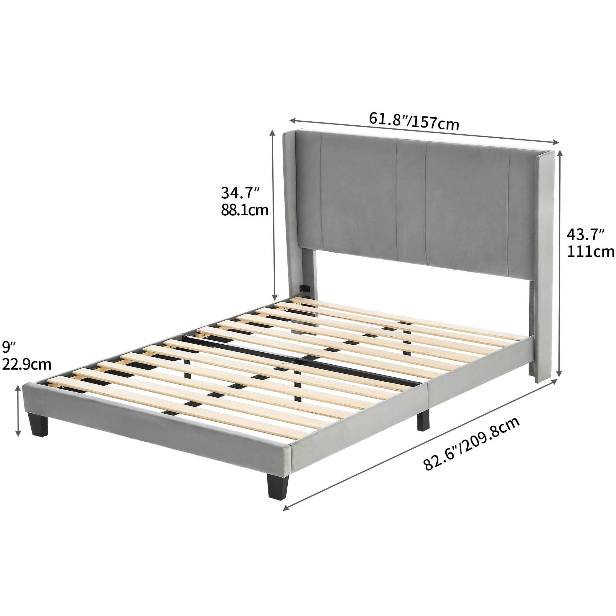 EASY ASSEMBLY- To avoid missing carton, it is smartly packaged in one carton for moving around easily. It may take you 30 mins to finish the whole assembling under the help of users’ manual. STURDY AND STABLE CONSTRUCTION- Features a thick & sturdy metal frame constructed from premium iron to provide product with a longer lifespan; The well-selected wood is sturdy and supports mattress stably. The bed frame can support up to 400 lbs(Full size)/ 500lbs(Queen Size). HUMANIZED DETAIL- The triangular structure near the headboard and the supportive legs in the center improve overall stability; Middle bed legs are upgraded, anti-scratch foot pads keep the floor or mats free from harm. Stickers on slats help to reduce noise. NO BOX SPRING NEEDED- Easy to assemble due to the minimalist design; Directly place a mattress pad on the frame, no box spring required. WINGBACK VELVET HEADBOARD- Has a lint-surfaced with rectangular tufting for a classy look. The wingback design conforms to human body and offers you more comfort when relax. Please follow the instructions, and professional installation recommended.