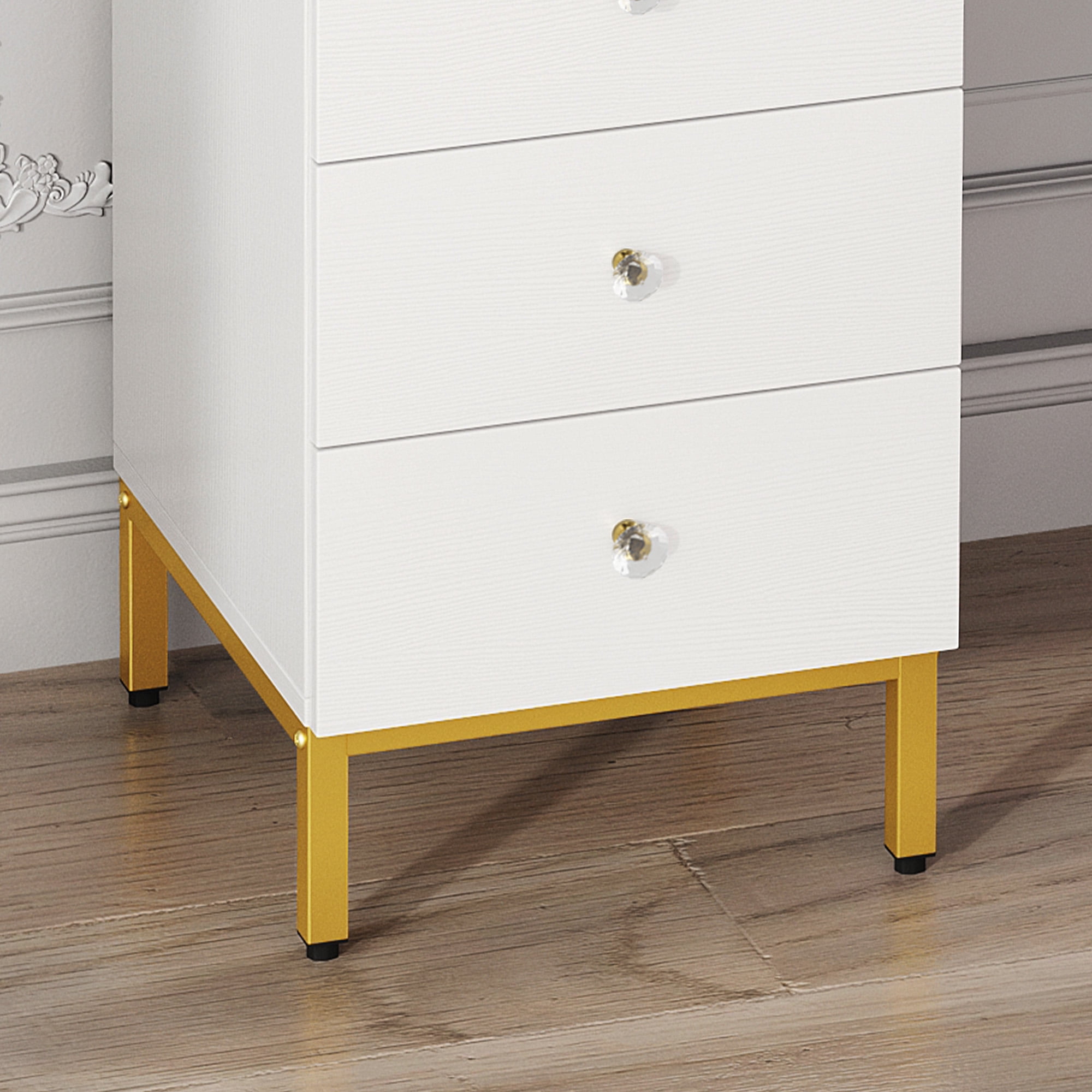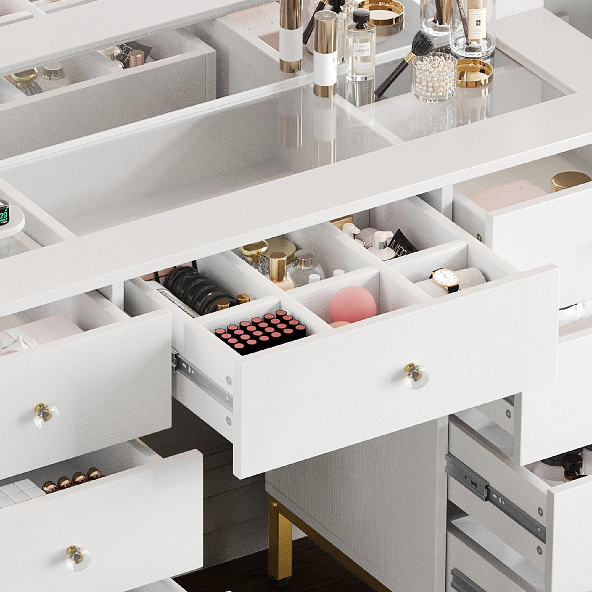 Enhance your daily beauty routine with Dextrus White and Gold Vanity Desk Set, designed in a modern style. The centerpiece of this set is a large LED lighted mirror measuring 39”x22.5”, offering a wide viewing angle for precise makeup application. With 3 adjustable color modes, you can achieve the perfect lighting for a clear and flawless look. The vanity desk features a convenient charging station with 2 standard outlets and 2 USB ports, allowing you to connect your hair dryer and charge your cell phone simultaneously. It also boasts 9 drawers, providing ample storage space for all your beauty essentials. The center drawer includes a divider for organized storage of accessories, ensuring everything is easily accessible when needed. To complete the set, we’ve included a stylish makeup stool. Measuring 15″L x 12″W x 18″H, it features a cushioned seat with a sleek leather finish that is both comfortable and easy to clean. The Black and Gold Vanity Desk Set is not only functional but also adds a touch of elegance to your space. Elevate your beauty routine with this chic and versatile vanity set. Specifications: 1. Material: Particleboard 2. Color: White 3. Function: Three-color light 4. Overall Size: 46″L x 16″W x 55″H 5. Stool Size: 15″L x 12W” x 18H 6. Assembly Required: Yes (easy) Package Includes: 1 x Dressing Table 1 x Stool 1 x Instructions 1 x Accessories Pack Age_group: Adult