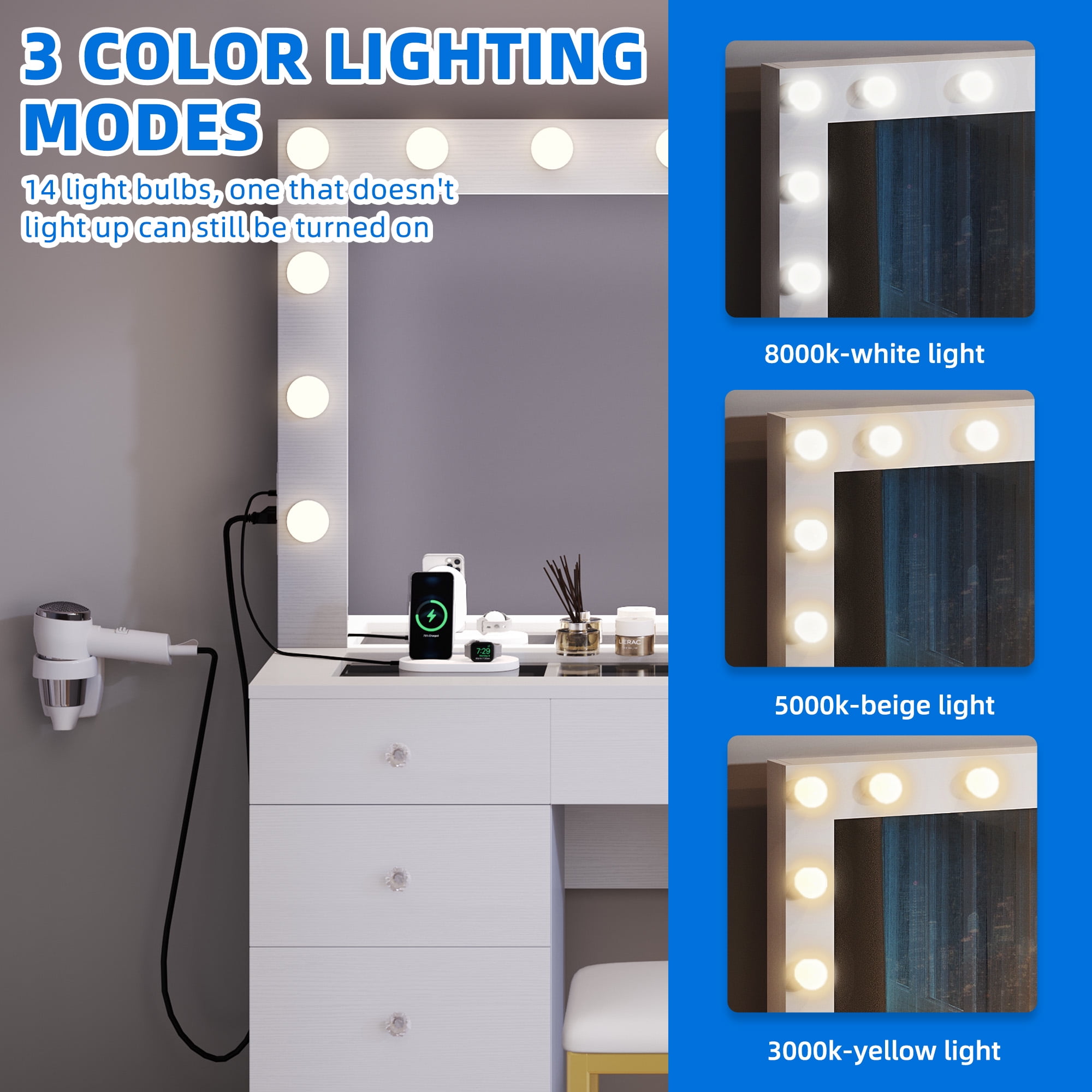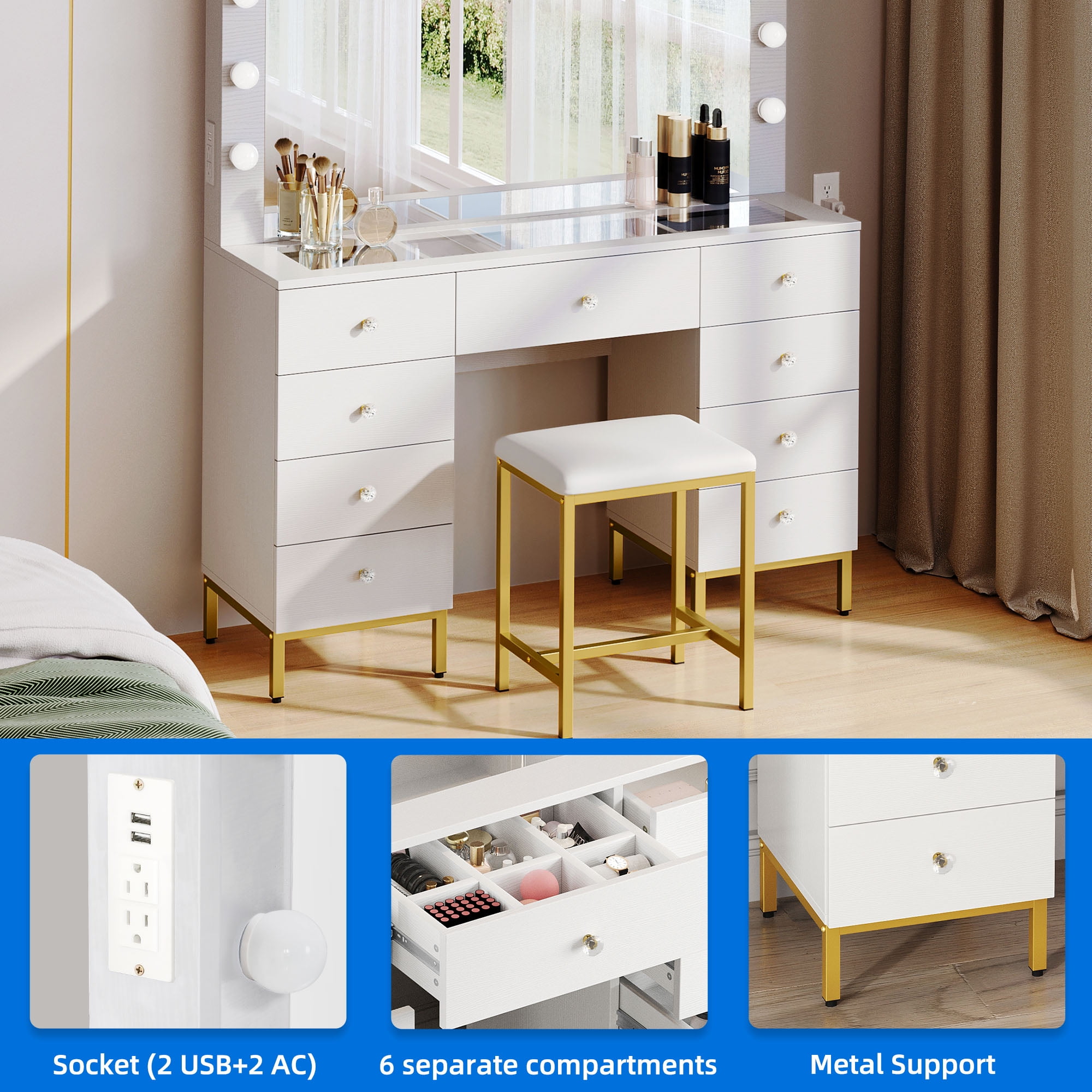 Gorgeous Hollywood style illuminated mirror: 14 LED bulbs on the mirror will illuminate evenly from all directions, helping you create the best look with your makeup. 3 color of the light is adjustable so you can get just the right lighting for you and your room. Metal frame: Crafted from golden metal frame and top grade particle board, this makeup vanity with lights will serve you for years to come. Charging Station: This large makeup table comes with a power strip that includes 2 standard plug sockets and 2 USB ports. This vanity can be connected directly to the vanity mirror while providing great convenience for using your hair dryer and curling iron Stylish and functional: This vanity table has a versatile look that complements a wide variety of room decor. A large table top is ideal for keeping all your makeup, perfumes and trinkets within an arm’s reach. Easy Assembly: The Makeup Desk, measuring 46″”L x 16″”W x 55″”H, and accompanying Makeup Stool, measuring 15″”L x 12″”W x 18″”H, are designed for easy assembly. The vanity set includes comprehensive instructions and all necessary accessories. Follow the step-by-step instructions, and effortlessly install each plank in numbered rows that correspond to each other. Assembly is a breeze, allowing you to enjoy your new vanity in no time. Age_group: Adult
