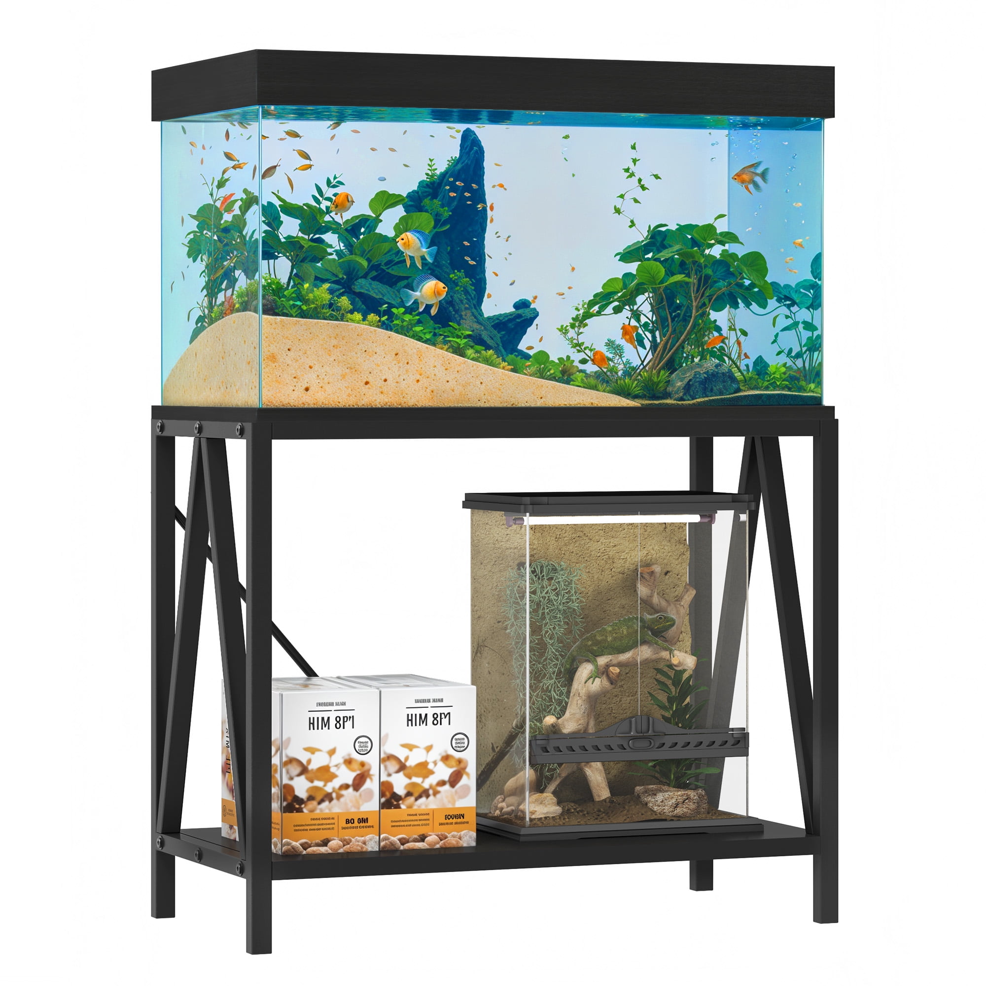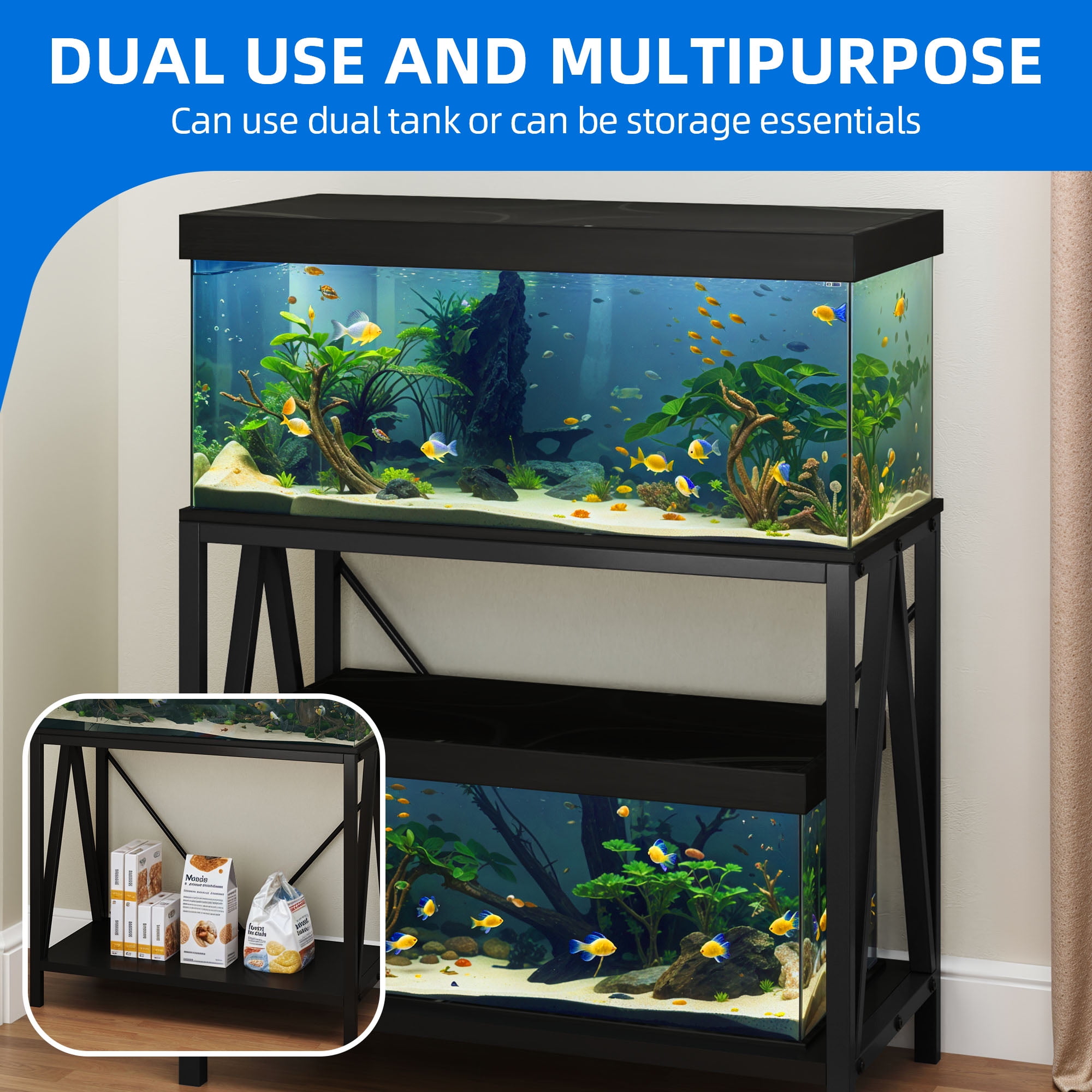 Product Description Maximize your space and enhance your aquarium setup with this sturdy 10-40 gallon fish tank stand. Featuring a dual-tier design, it holds two tanks while offering extra storage for essentials like food, nets, and tools. Made from durable pure iron with customizable side shapes (Z, W, X), it adds a sleek, modern touch to any room. Easy to assemble with two or more people. Specifications Brand: Dextrus Color: Black Material: Wood&Steel Product Dimensions: 39.4 x 21.2 x 6.3 inches Item Weight: 57.3 pounds