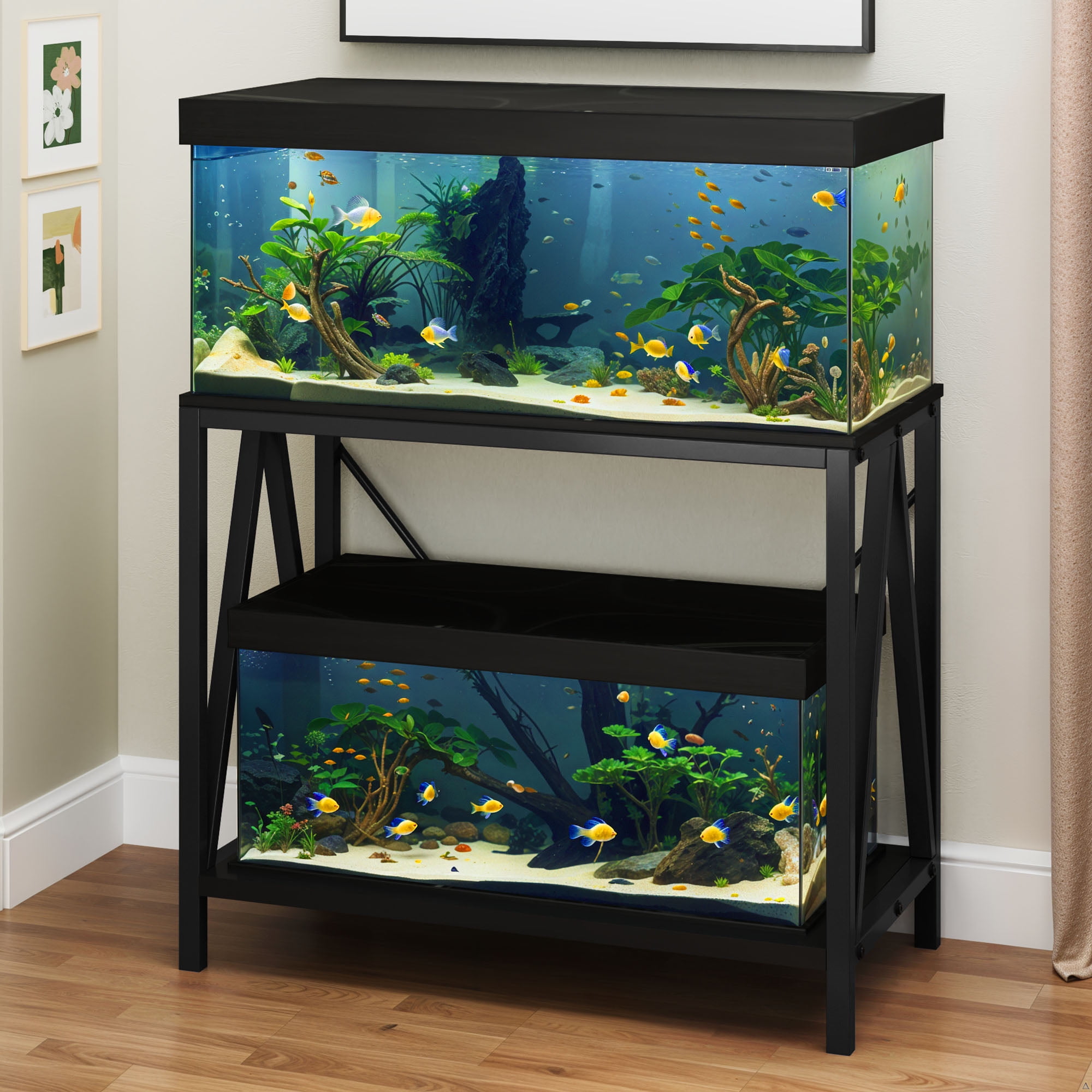 Sturdy & Reliable Build: Crafted from strong pure iron, this Dextrus 10-40 gallon fish tank stand is built to last. With a reinforced 1.0mm thick desktop frame, 0.8mm leg supports, 0.8mm thick transverse brace, and a 0.45mm bottom iron plate, it ensures safe and stable use for years to come. Space-Saving Dual-Tier Design: Maximize your space with this two-tier metal aquarium stand, designed to hold two 10-40 gallon tanks. Display your main tank on the upper tier while using the lower level for another tank, storage, or decorative elements. Convenient Storage & Accessories: Equipped with built-in hooks, this fish tank stand keeps essential tools like nets, thermometers, and plant pliers within easy reach, making aquarium maintenance more efficient and organized. Smart & Spacious Organization: The lower shelf provides extra storage for fish food, water dispensers, and cleaning tools-keeping everything neatly arranged. (For safety and ease, assembly is best done with two or more people.) Modern & Customizable Style: Choose from three side shapes-Z, W, or X-to match your room’s aesthetic. Available in classic black or white, this stand effortlessly enhances any living room, office, or aquarium setup with sleek and versatile appeal.