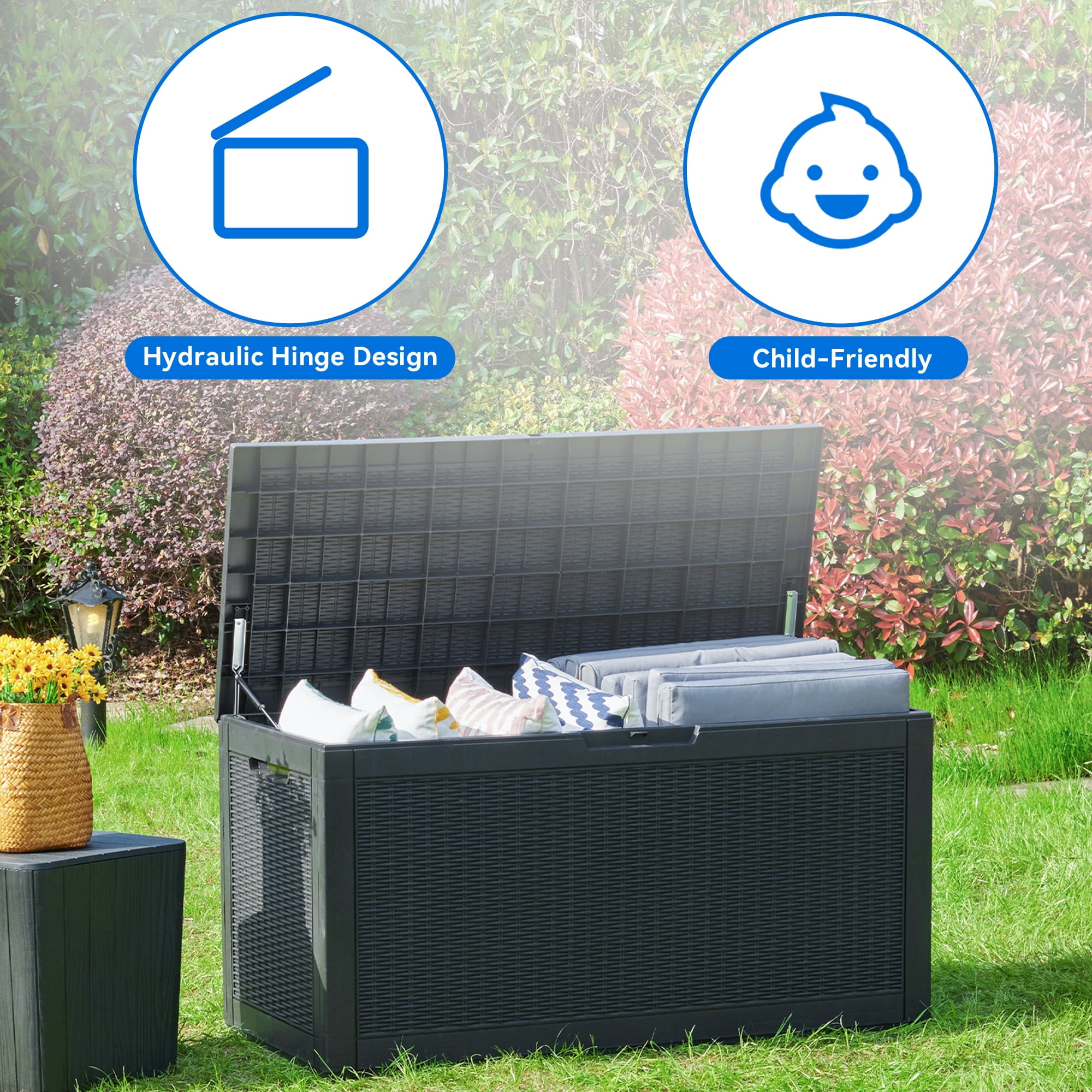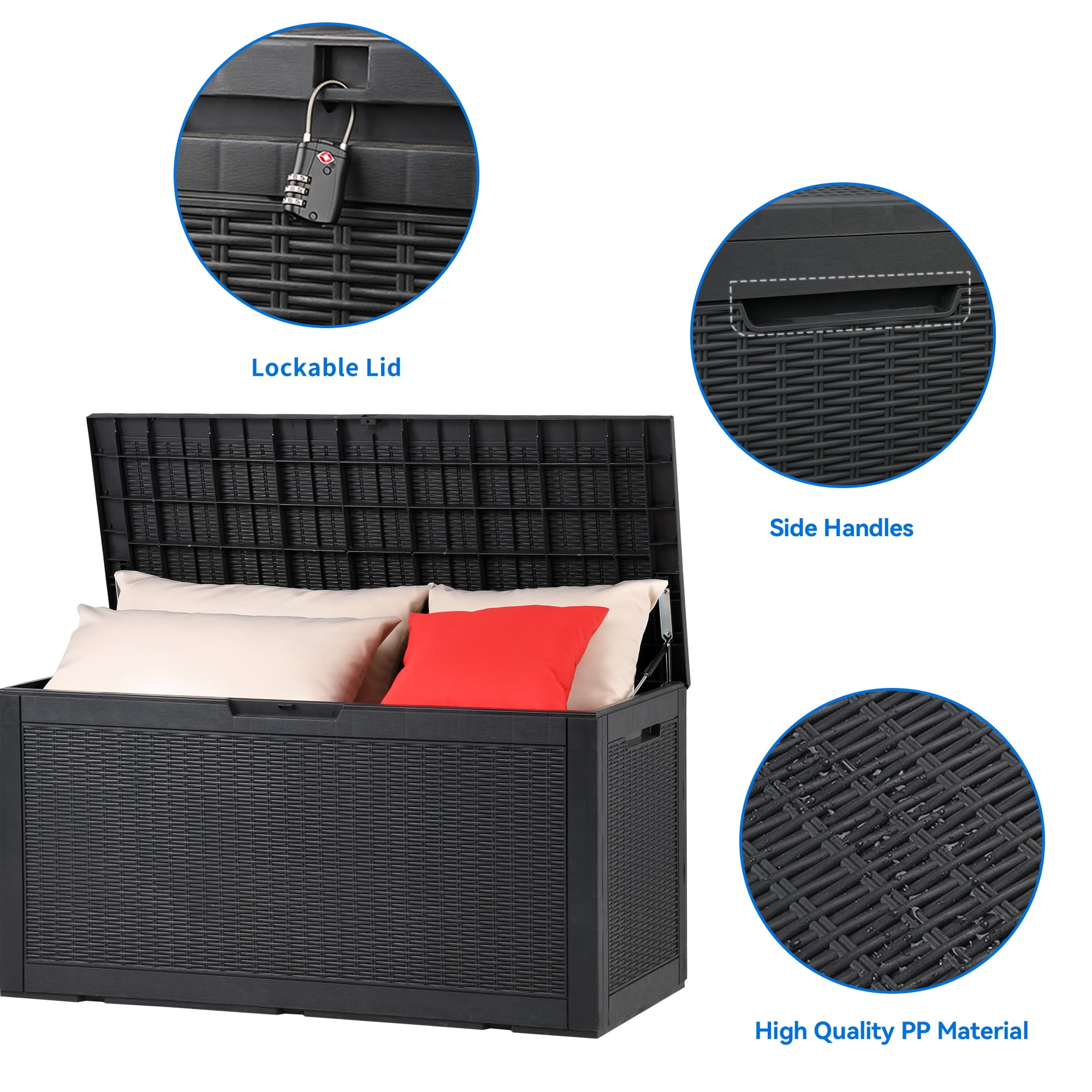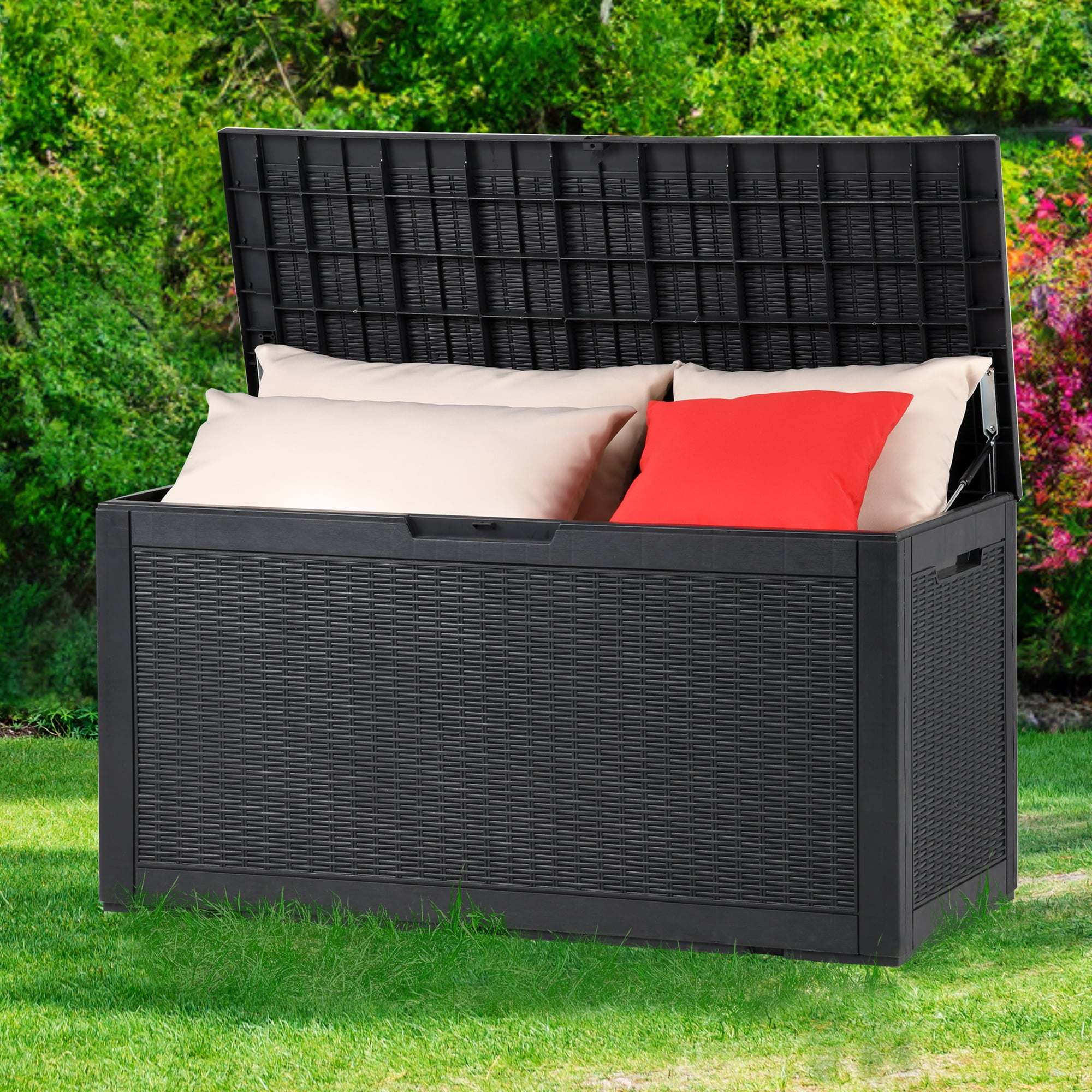 AMPLE STORAGE CAPACITY – Experience the convenience of our outdoor storage box, offering an exceptional storage capacity of 100 gallons. With generous dimensions of 47.6″L x 21.2″W x 24.8″H, it provides ample space to accommodate your patio essentials, garden tools, outdoor cushions, and pool supplies. SUPERB DURABILITY – Constructed using resilient poly resin material, this outdoor storage box is highly resistant to fading and rusting. It is designed to retain its shiny and new appearance for many years, ensuring long-lasting durability and protection for your belongings. MULTIFUNCTIONAL STORAGE SOLUTION – This versatile storage box is suitable for both indoor and outdoor use. It provides ample space to store a variety of items, including patio furniture cushions, gardening tools, outdoor supplies, and pool accessories. The lockable lid ensures the safety and security of your belongings, giving you peace of mind. USER-FRIENDLY DESIGN – The storage box features a functional design, with a lid that flips open effortlessly, allowing for easy access to your stored items. Additionally, it is equipped with ergonomic side handles, enabling convenient and comfortable transportation, making it easy to carry the box around as needed. ADDITIONAL SEATING OPTION – This storage box also doubles as a comfortable bench seat, offering a weight capacity of 440 lbs. It provides a convenient and practical seating solution for your outdoor space. With its straightforward assembly process, you can quickly set it up and enjoy the benefits of extra seating in no time.