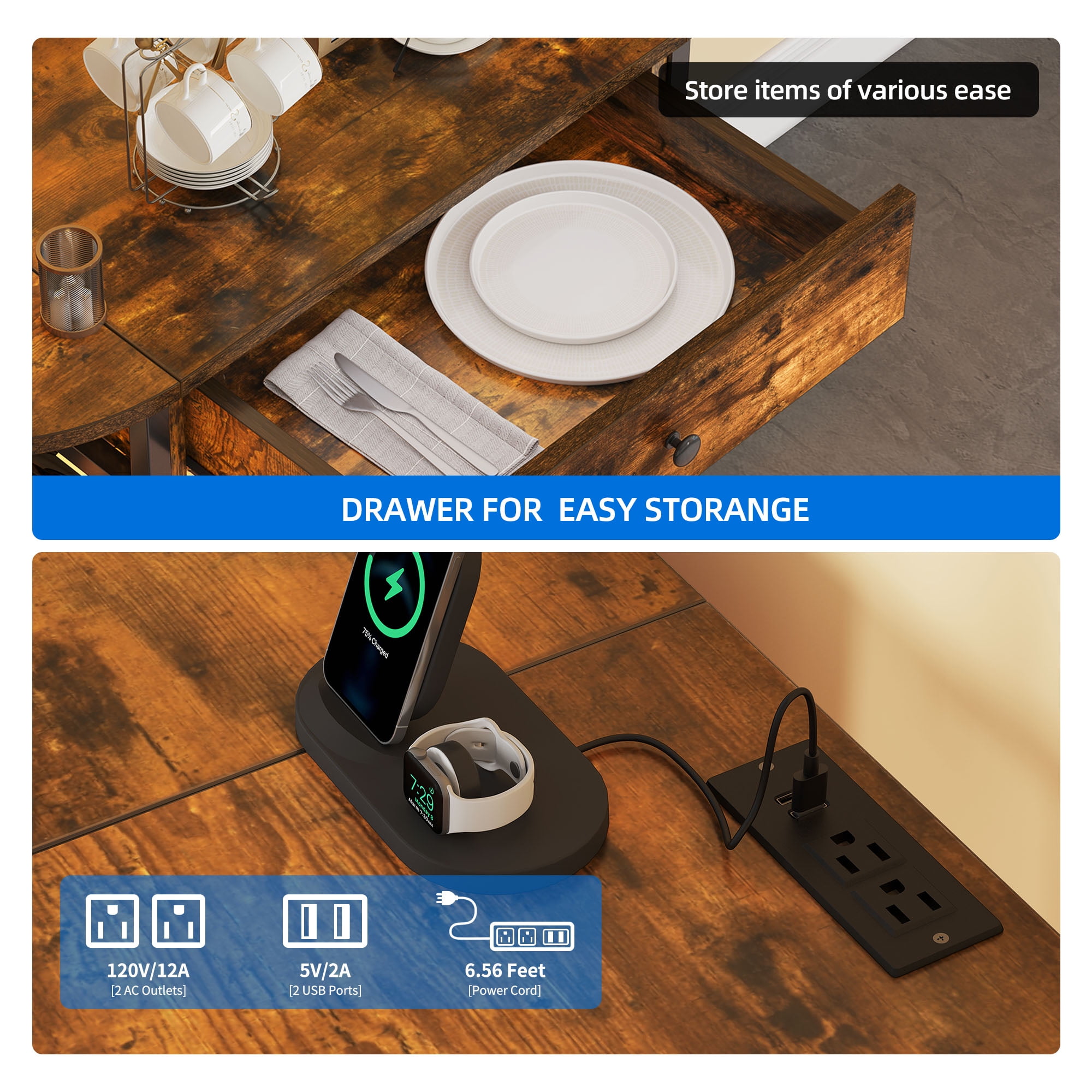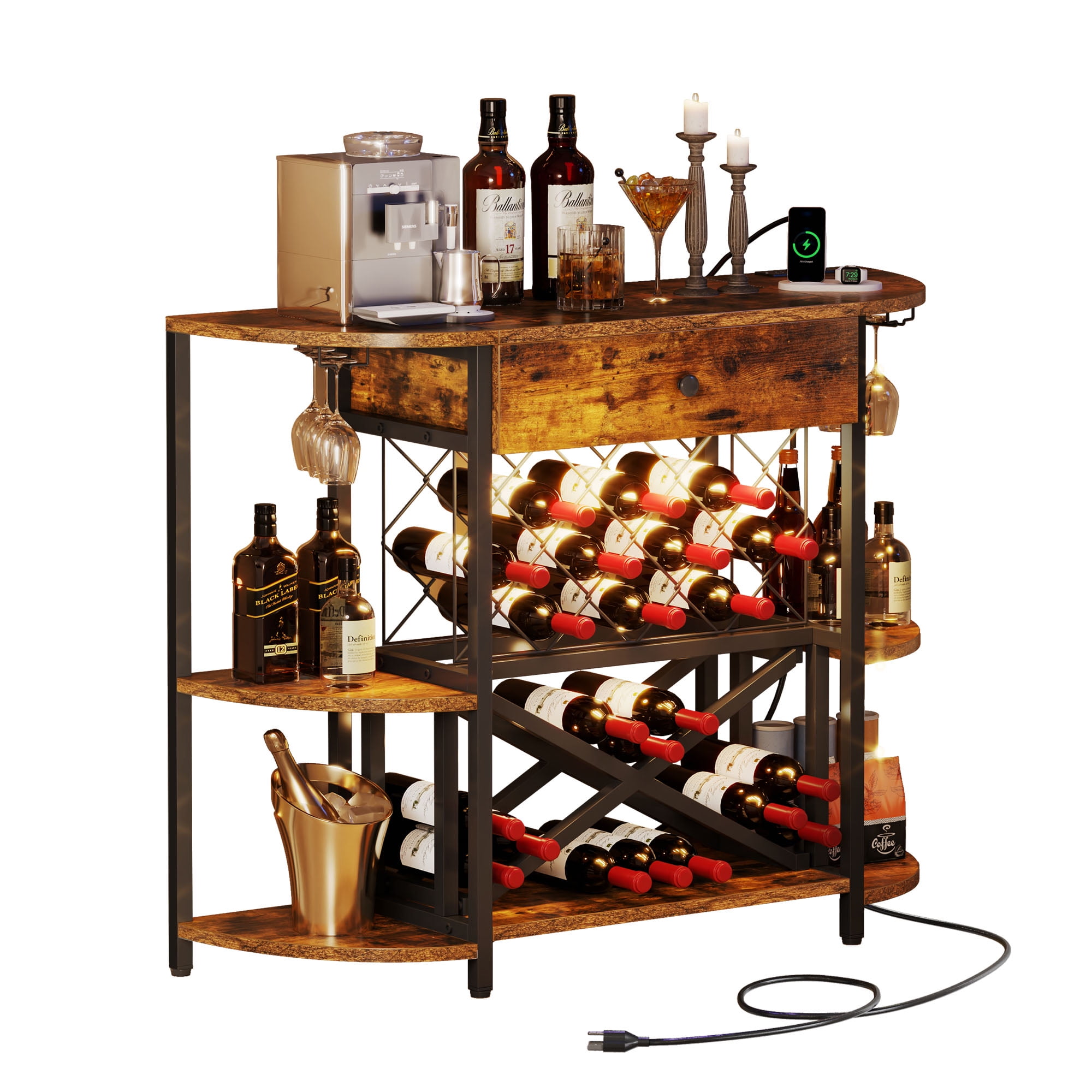Dextrus Wine Cabinet with LED Lights and Power Outlets, Wine Rack Table with Drawer, Brown